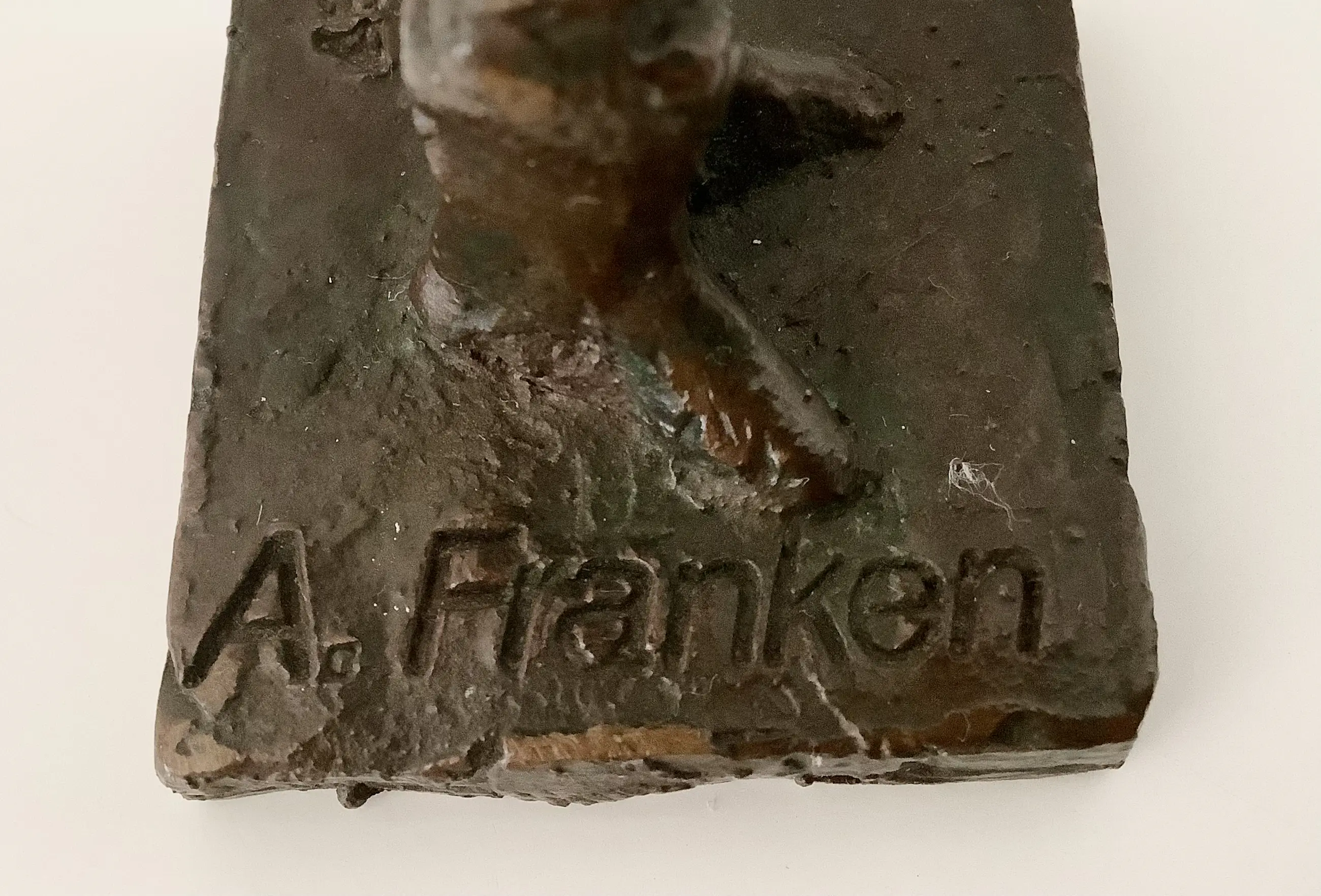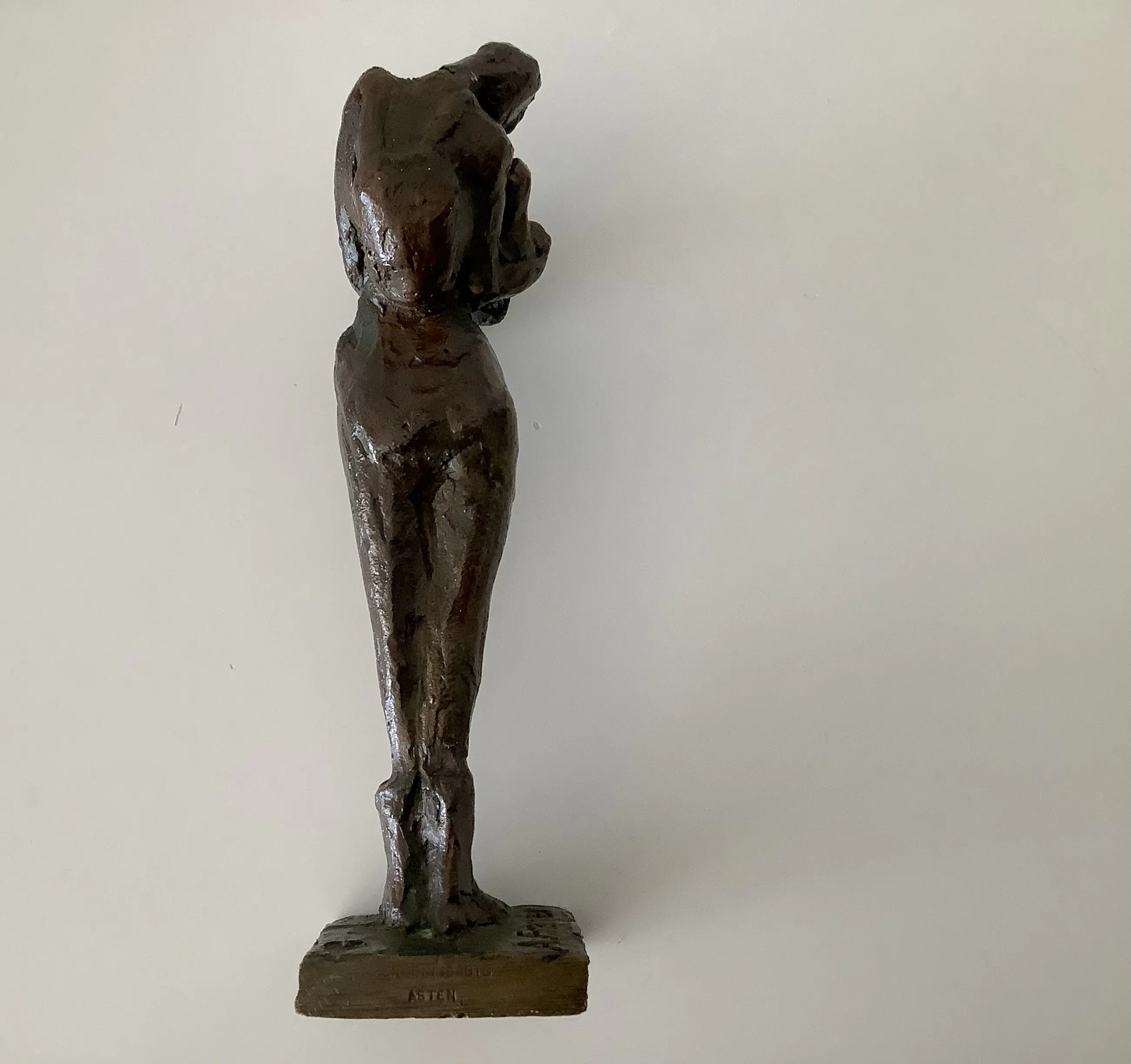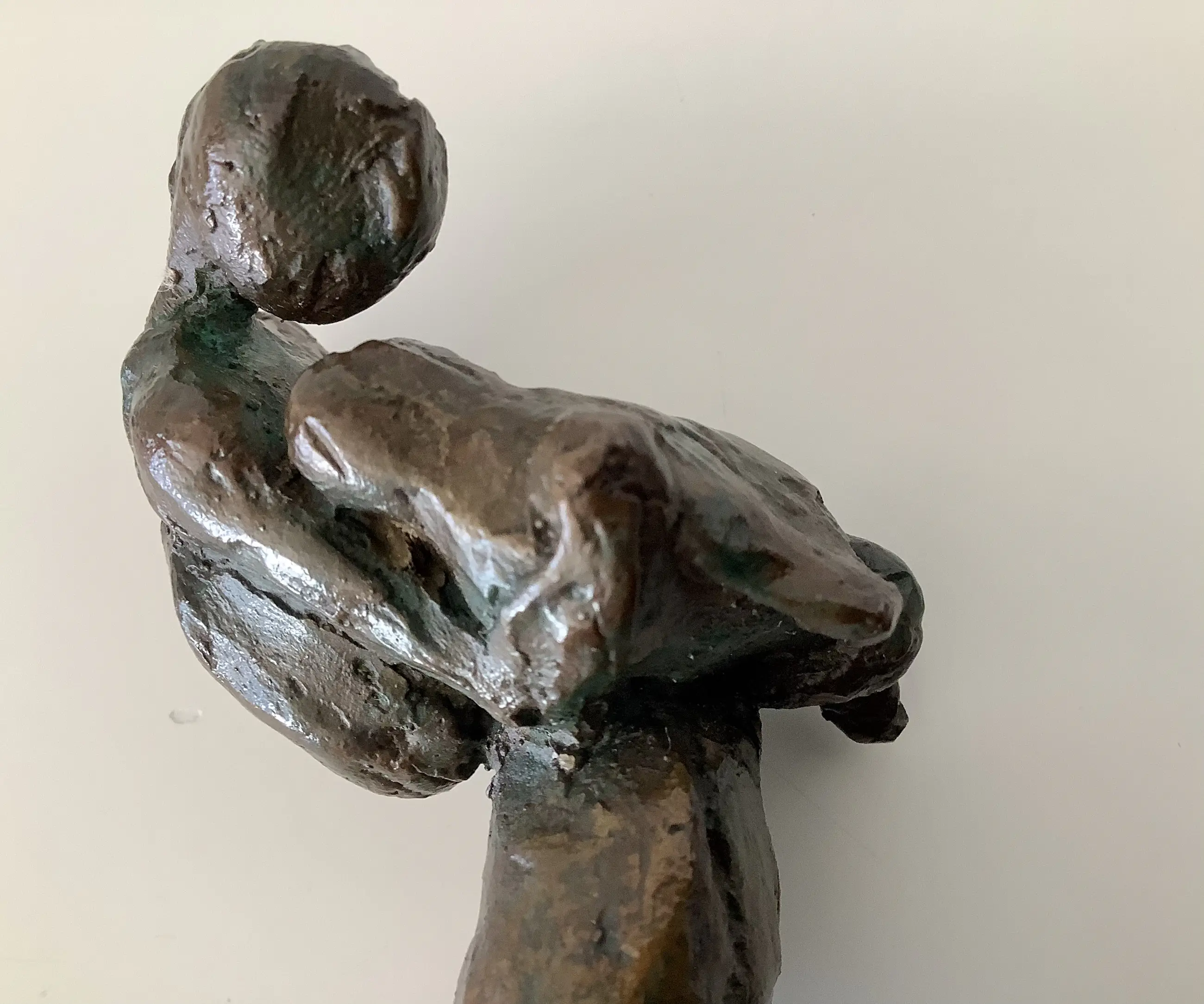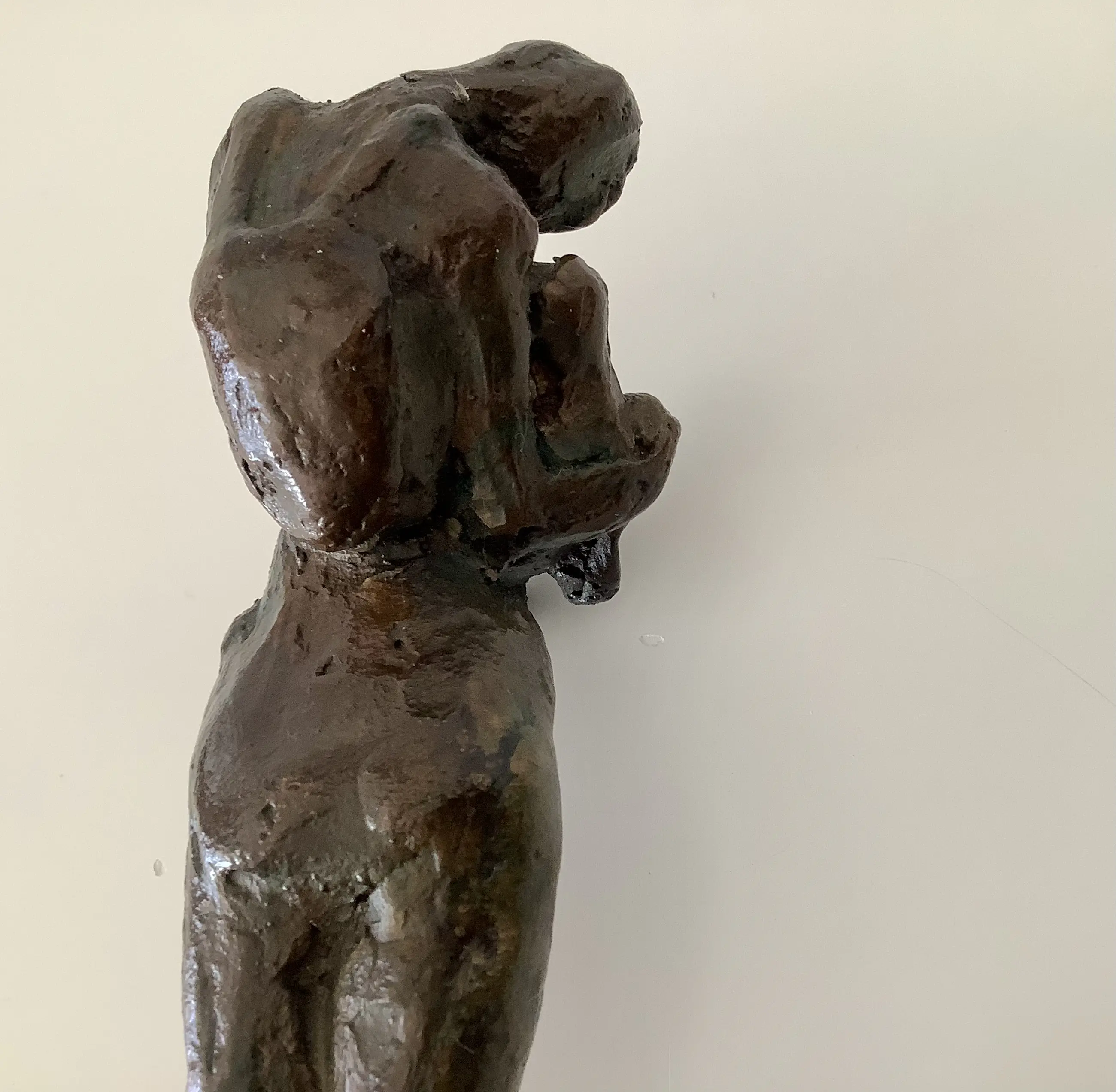 Massief brons. Jingle vrouw met laarsjes en rugzakje met in haar ramen een zeehondje. Fraaie boetseertechniek. Aandoenlijk beeld