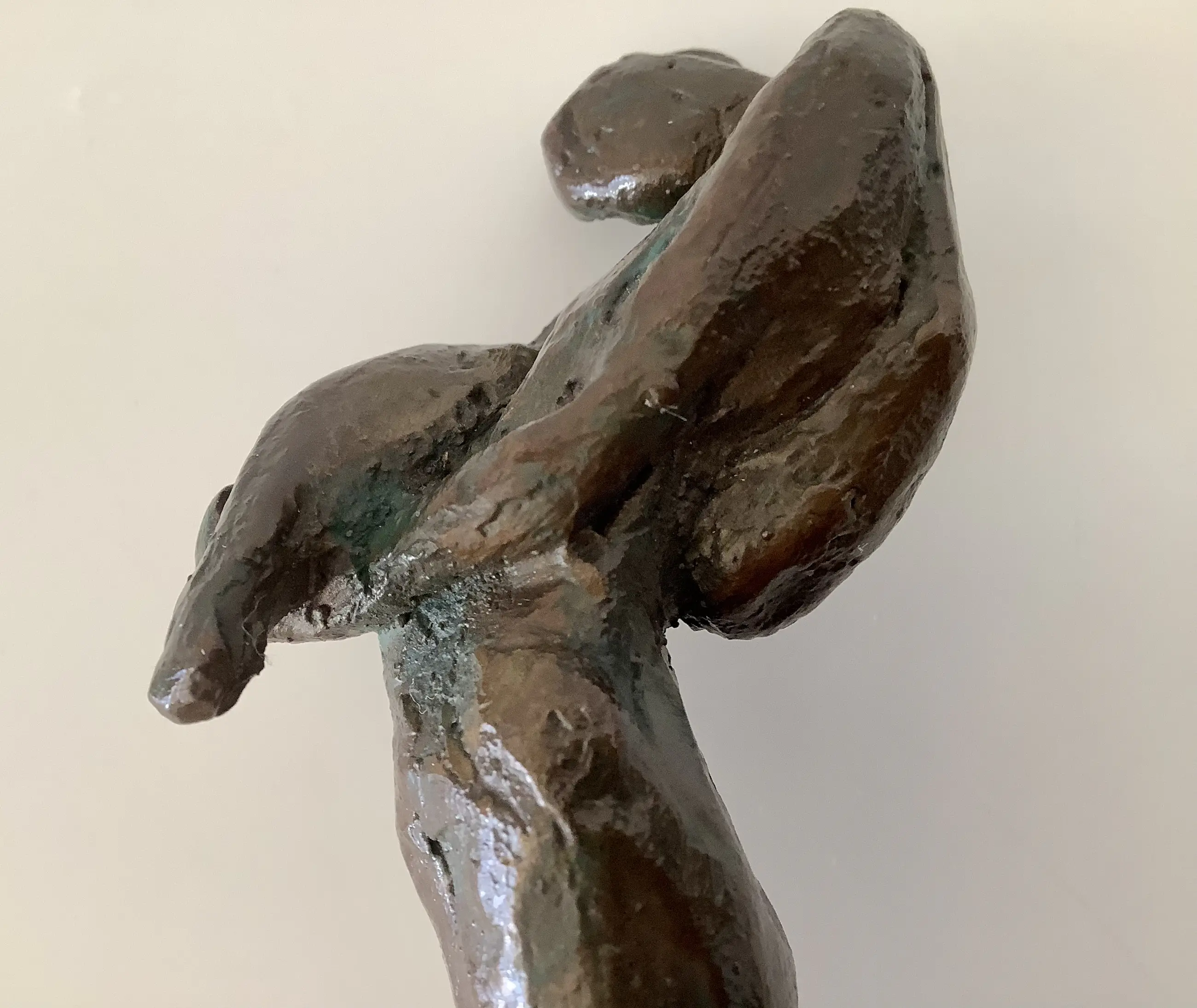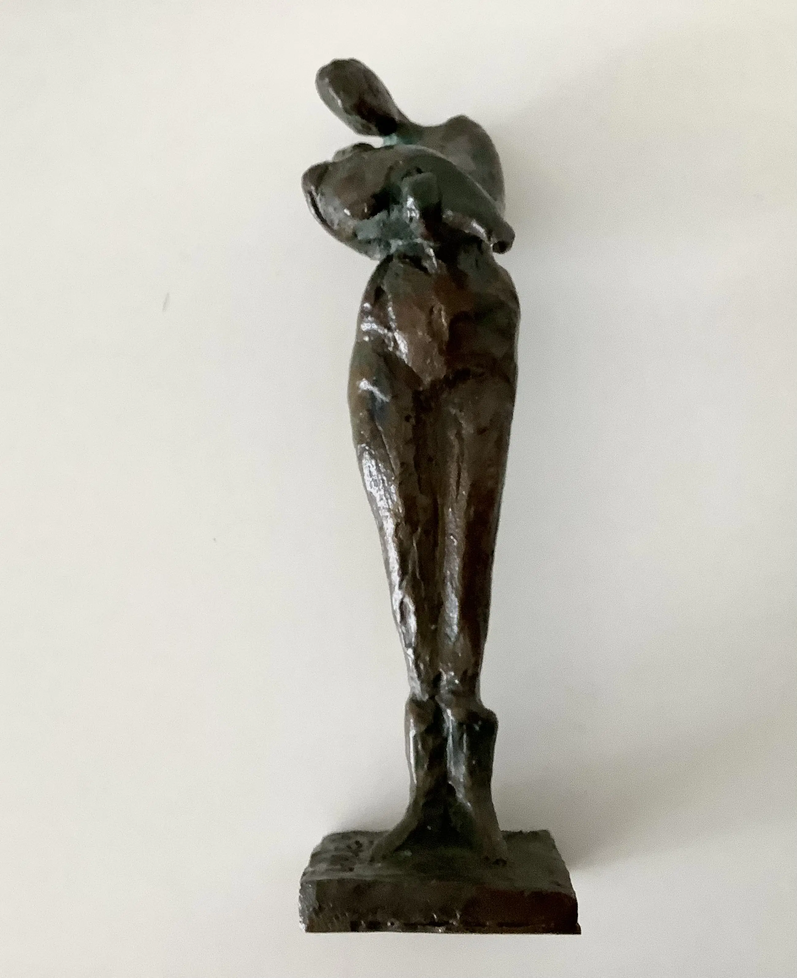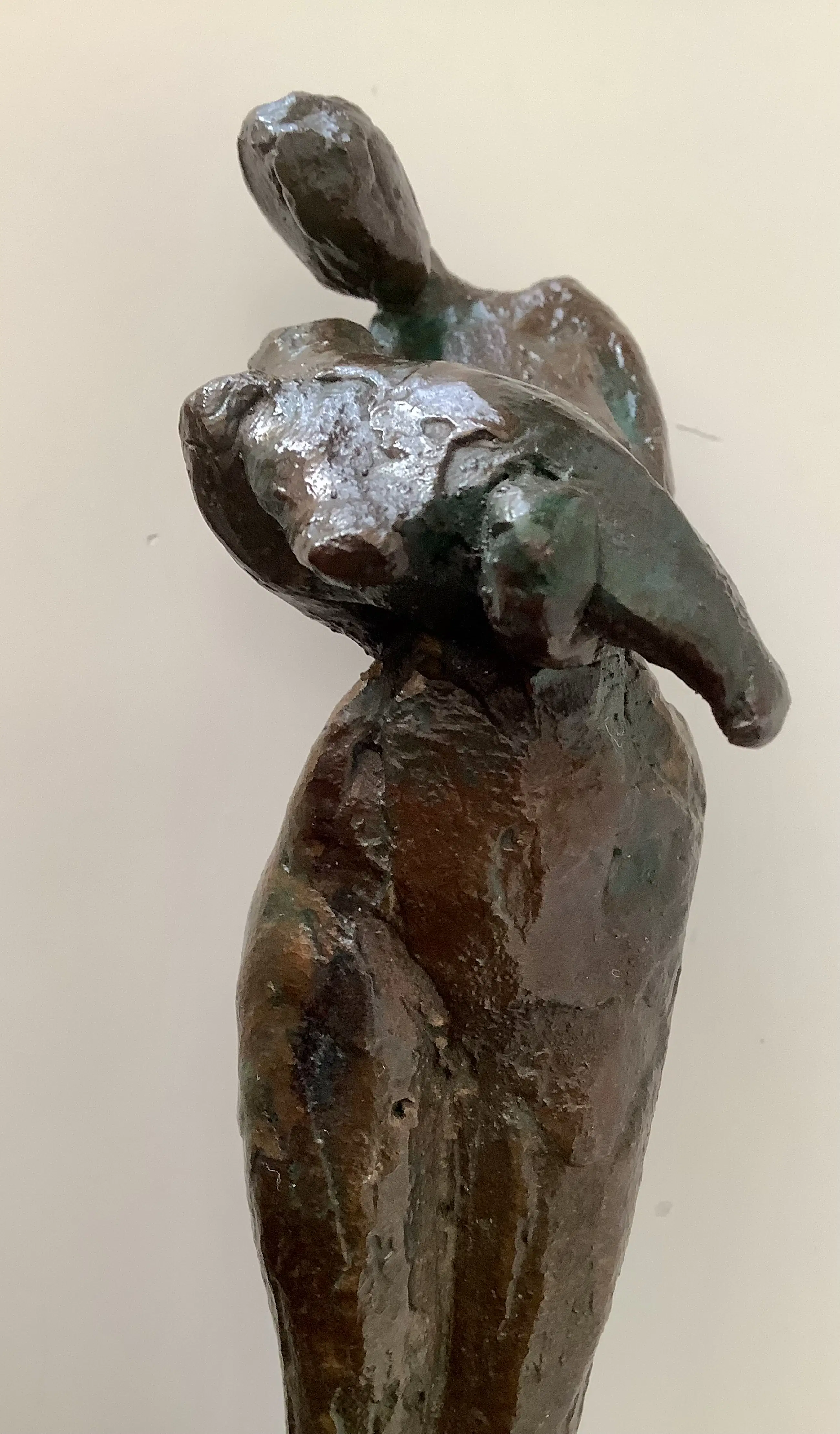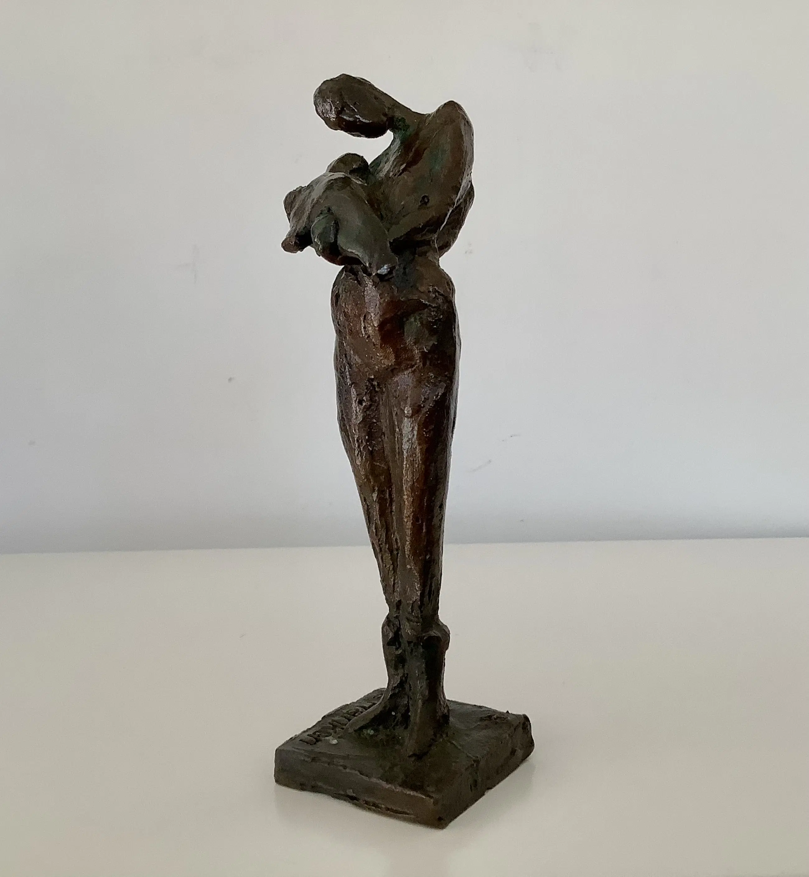 Massief brons. Jingle vrouw met laarsjes en rugzakje met in haar ramen een zeehondje. Fraaie boetseertechniek. Aandoenlijk beeld