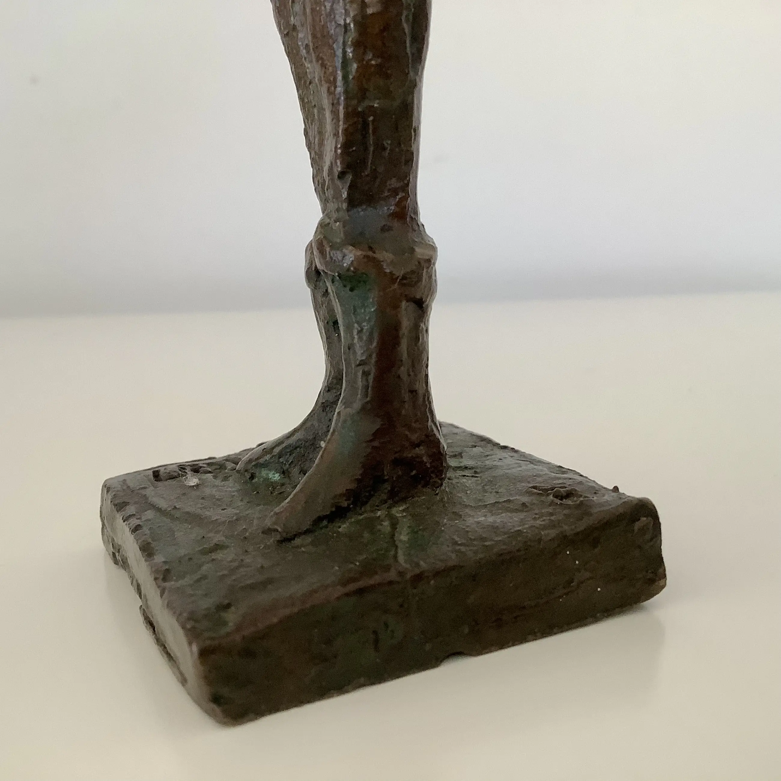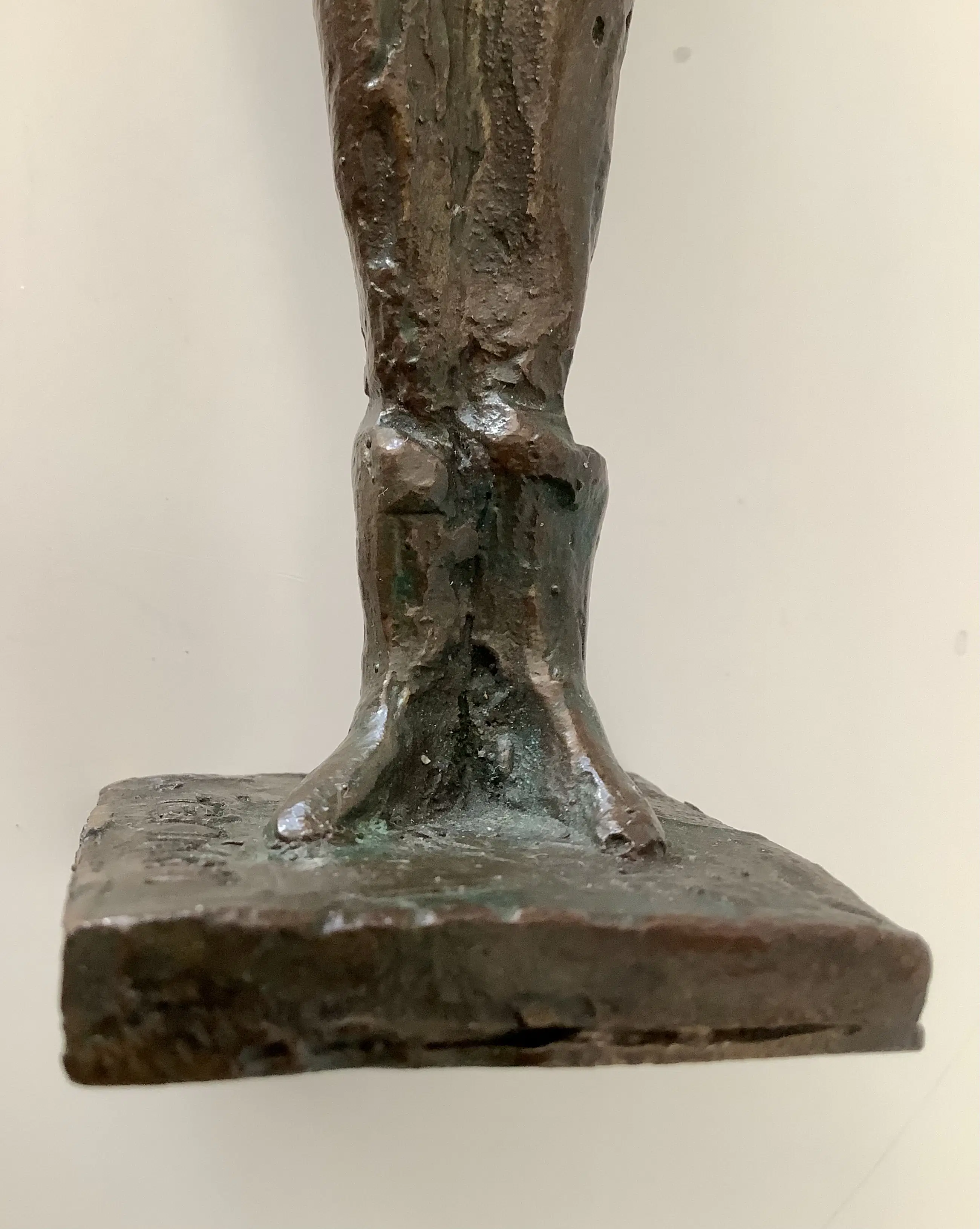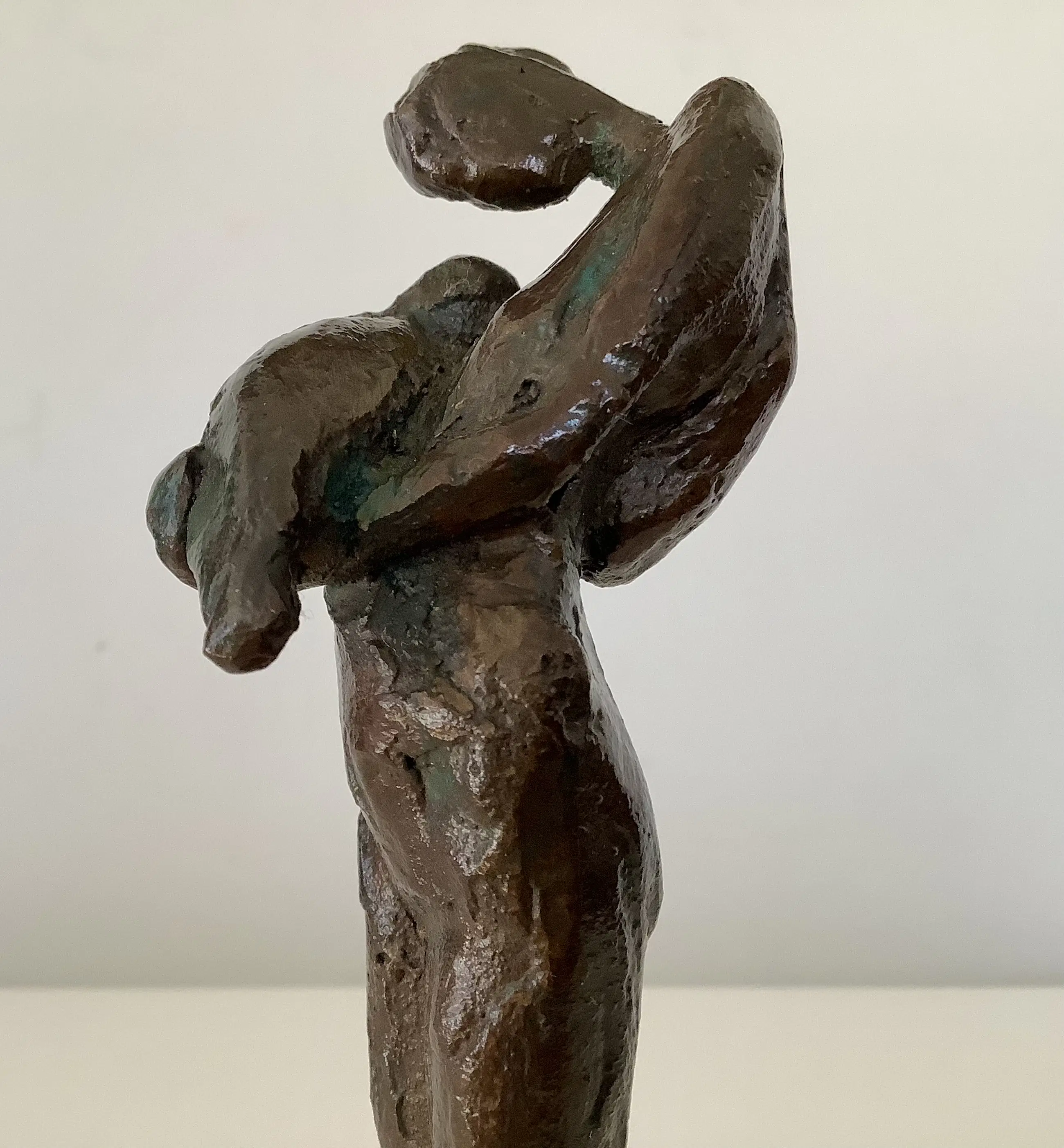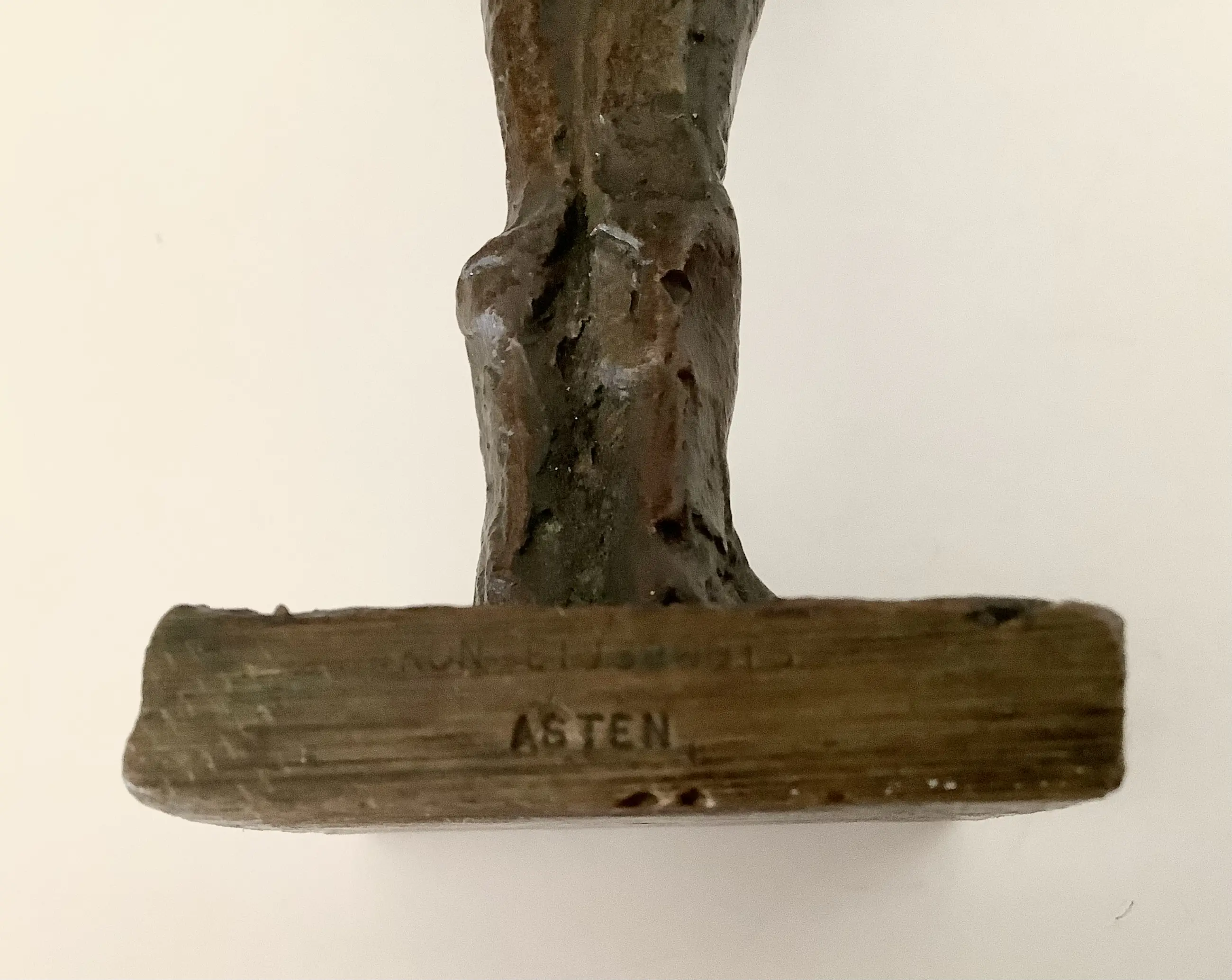Massief brons. Jingle vrouw met laarsjes en rugzakje met in haar ramen een zeehondje. Fraaie boetseertechniek. Aandoenlijk beeld