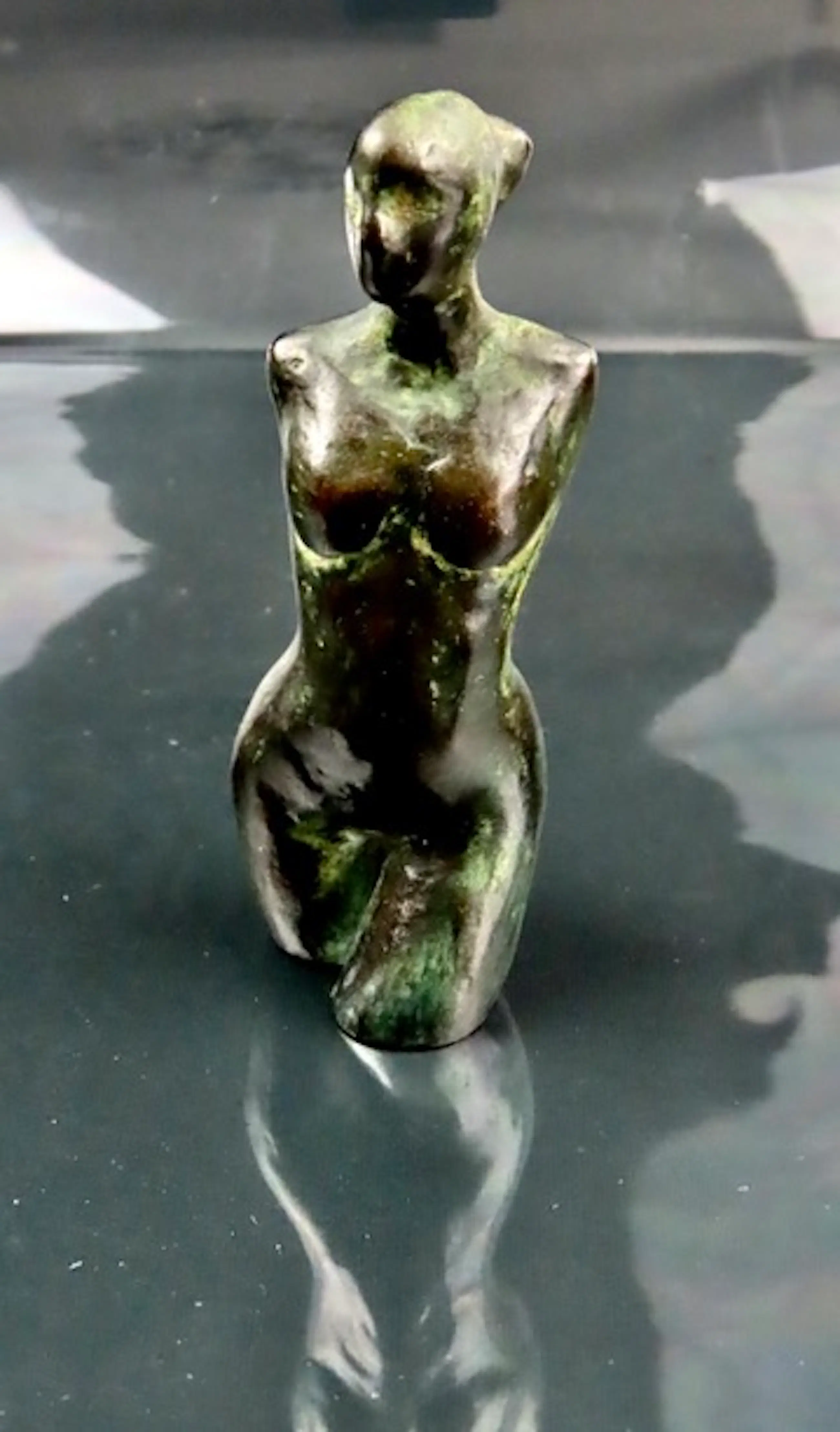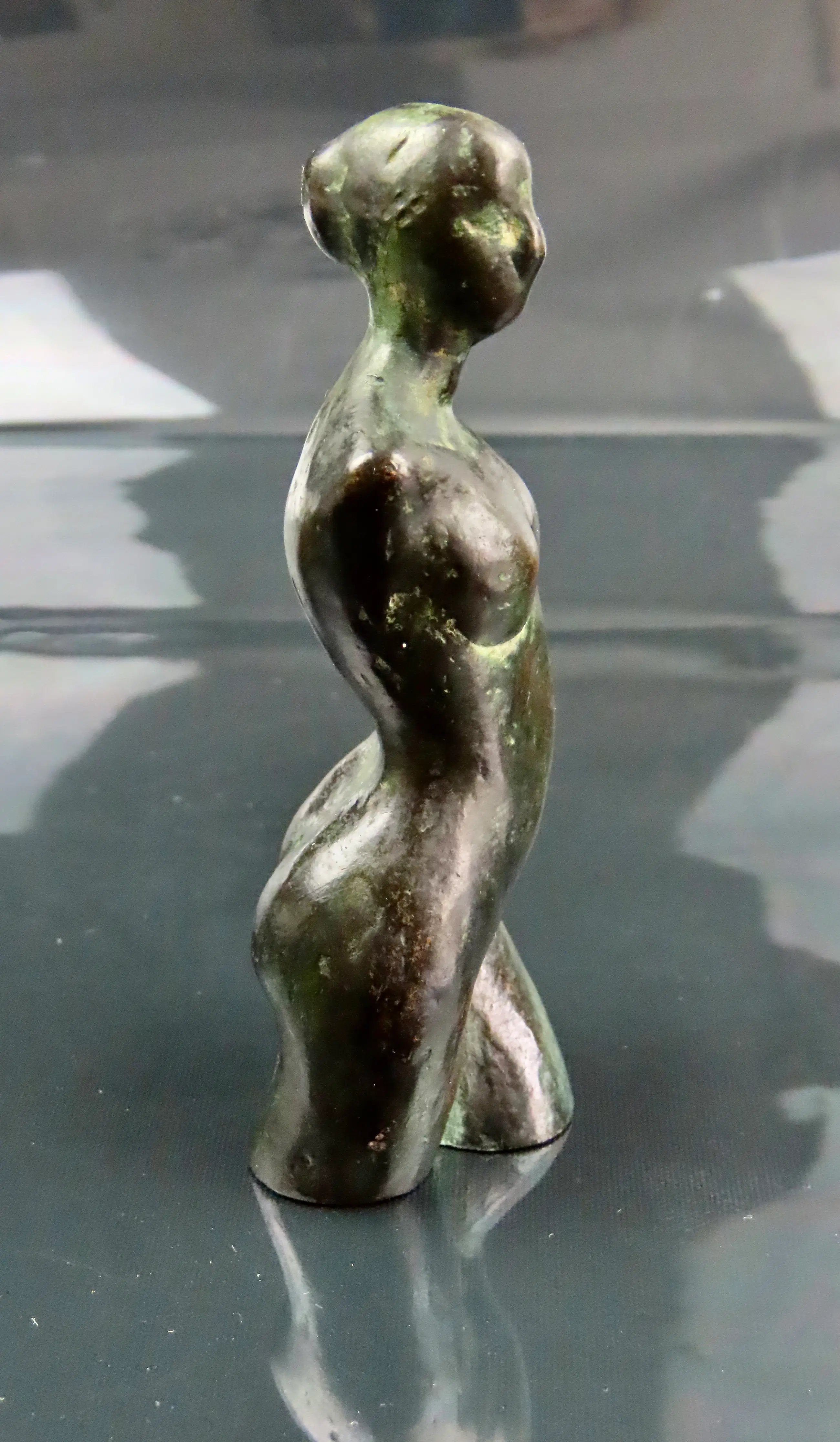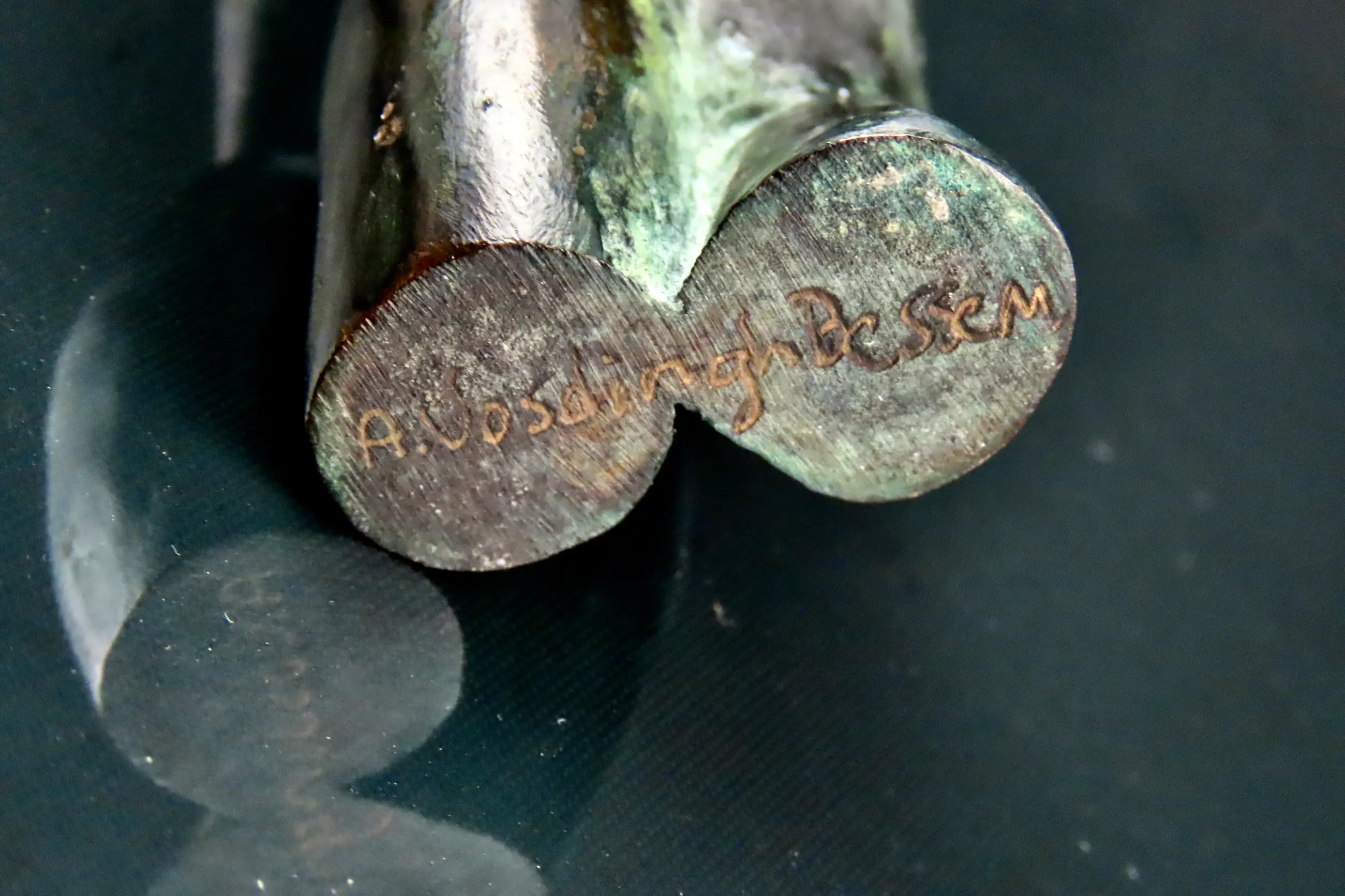 Fraai massief bronzen beeldje van Anja Vosdingh Bessem (1953-2021) met vloeiende wulpse vormen van een vrouw. In uitstekende staat en handgesigneerd aan de onderzijde. Aangekocht in 1997. 9x3x3 cm 279 gram.