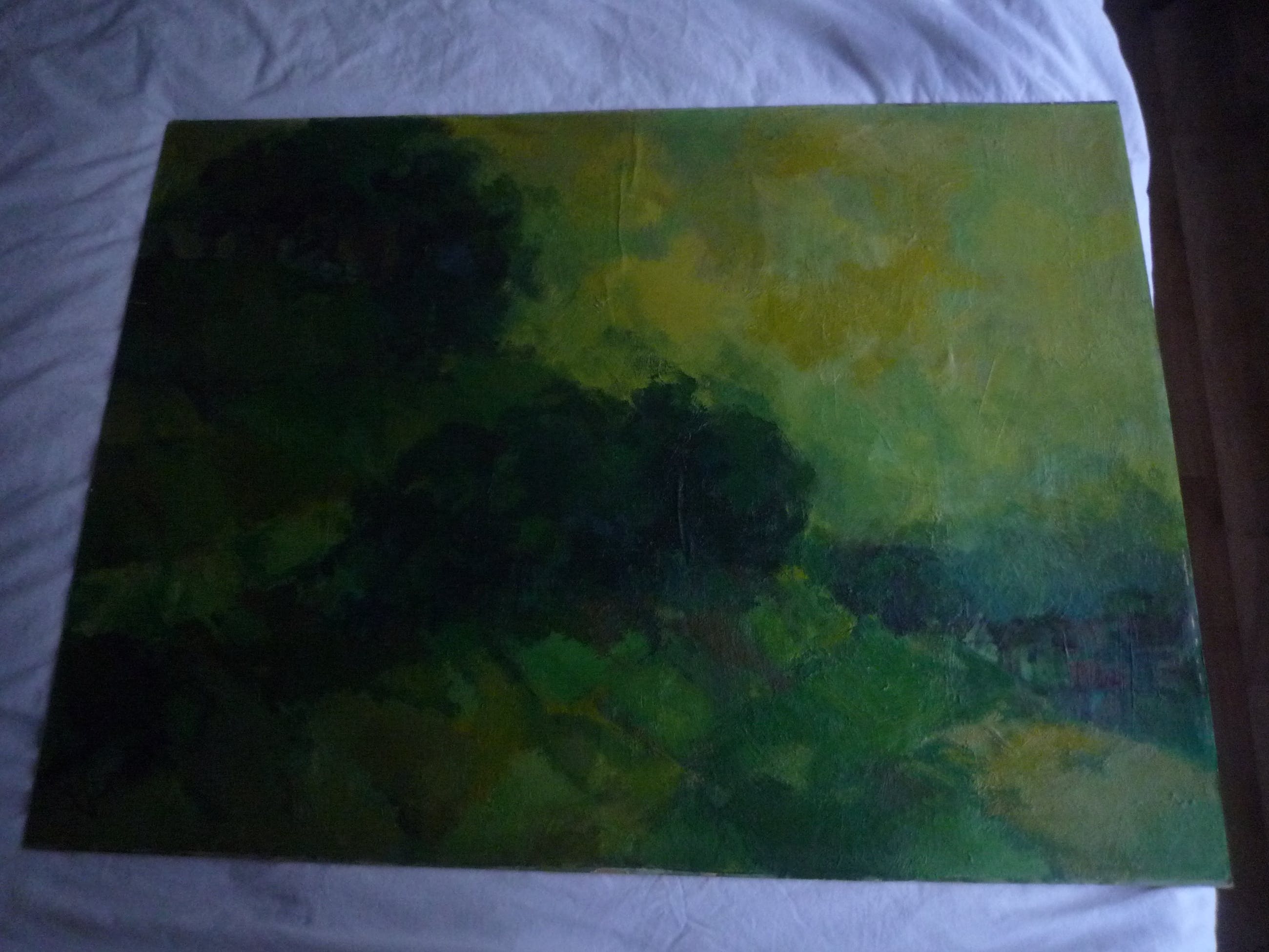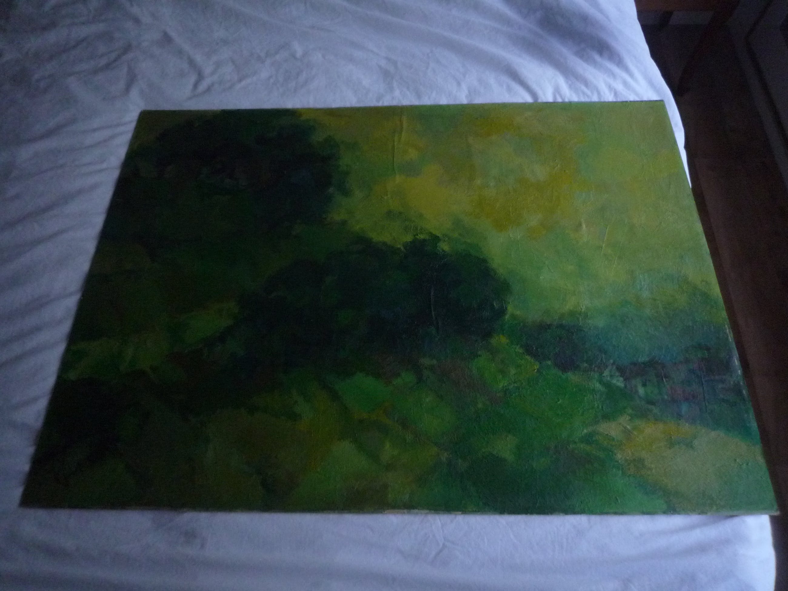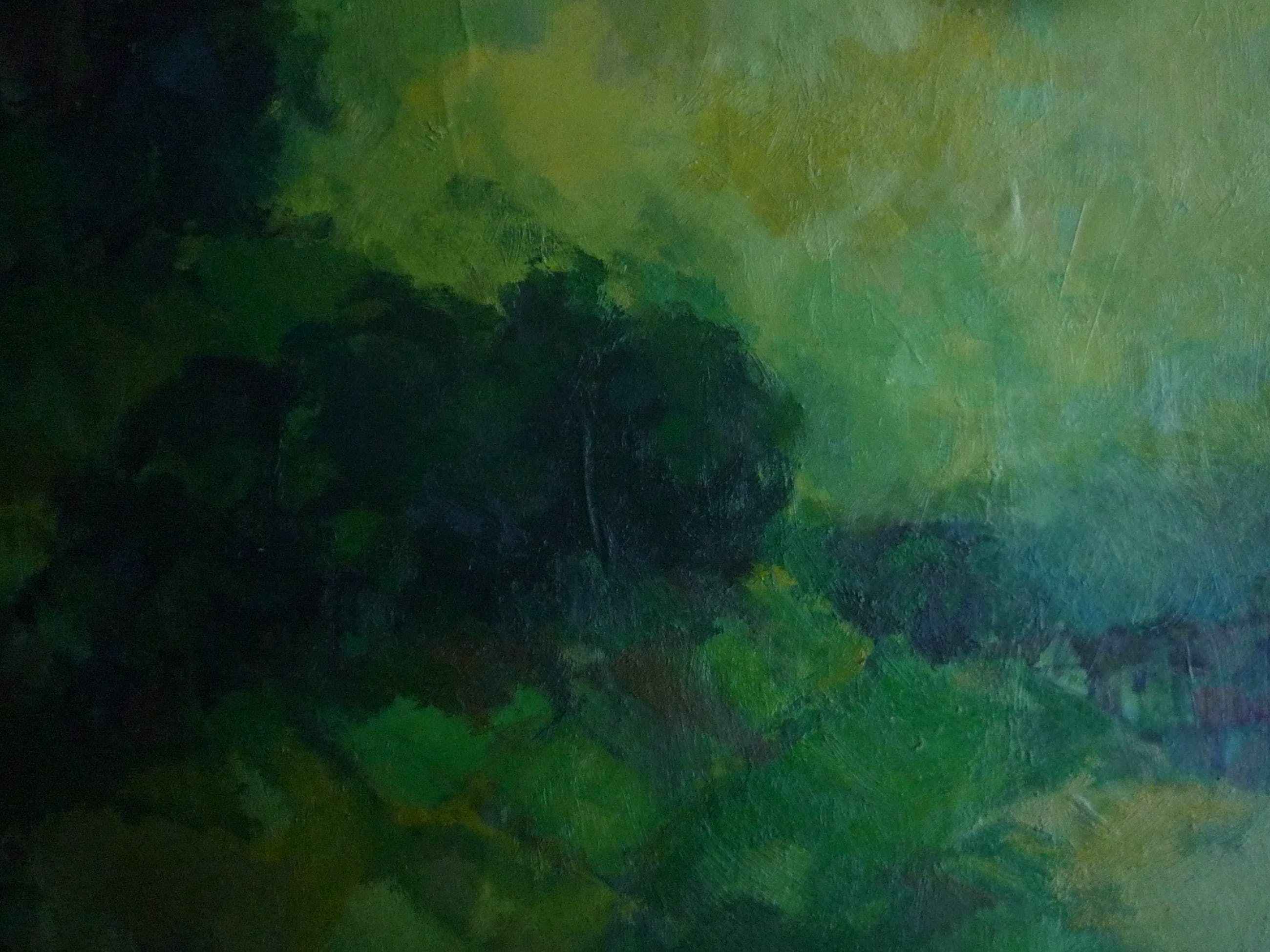 Boslandschap met dorpje rechtsonder op de achtergrond door de recent overleden Ank Overweel