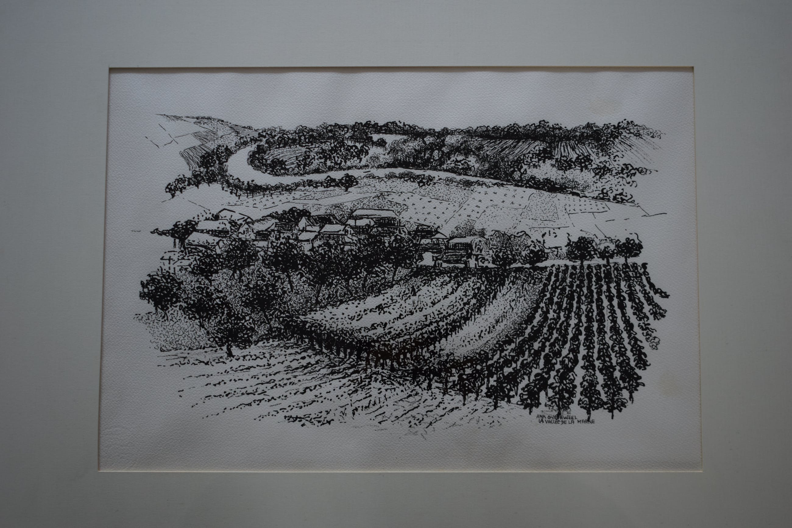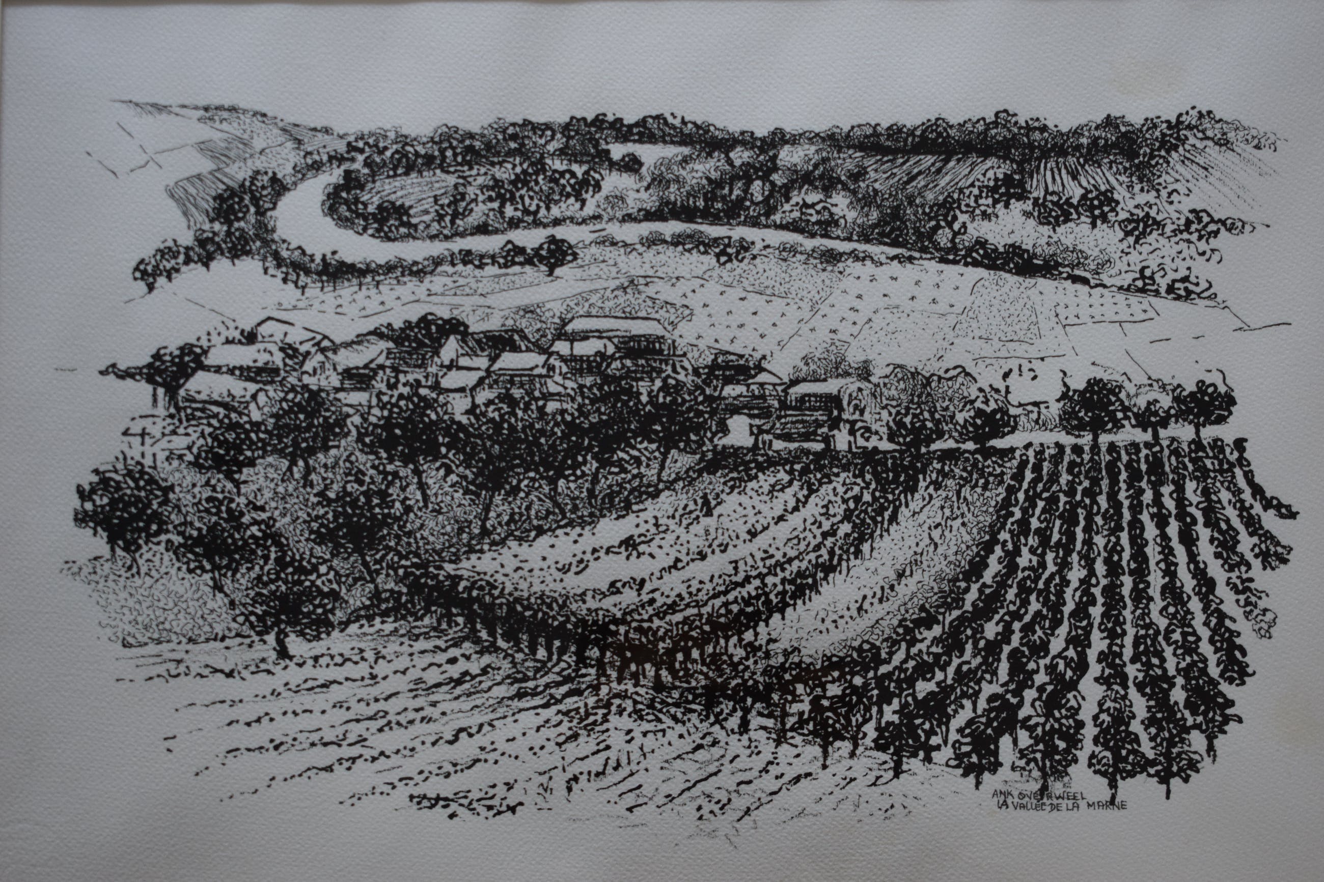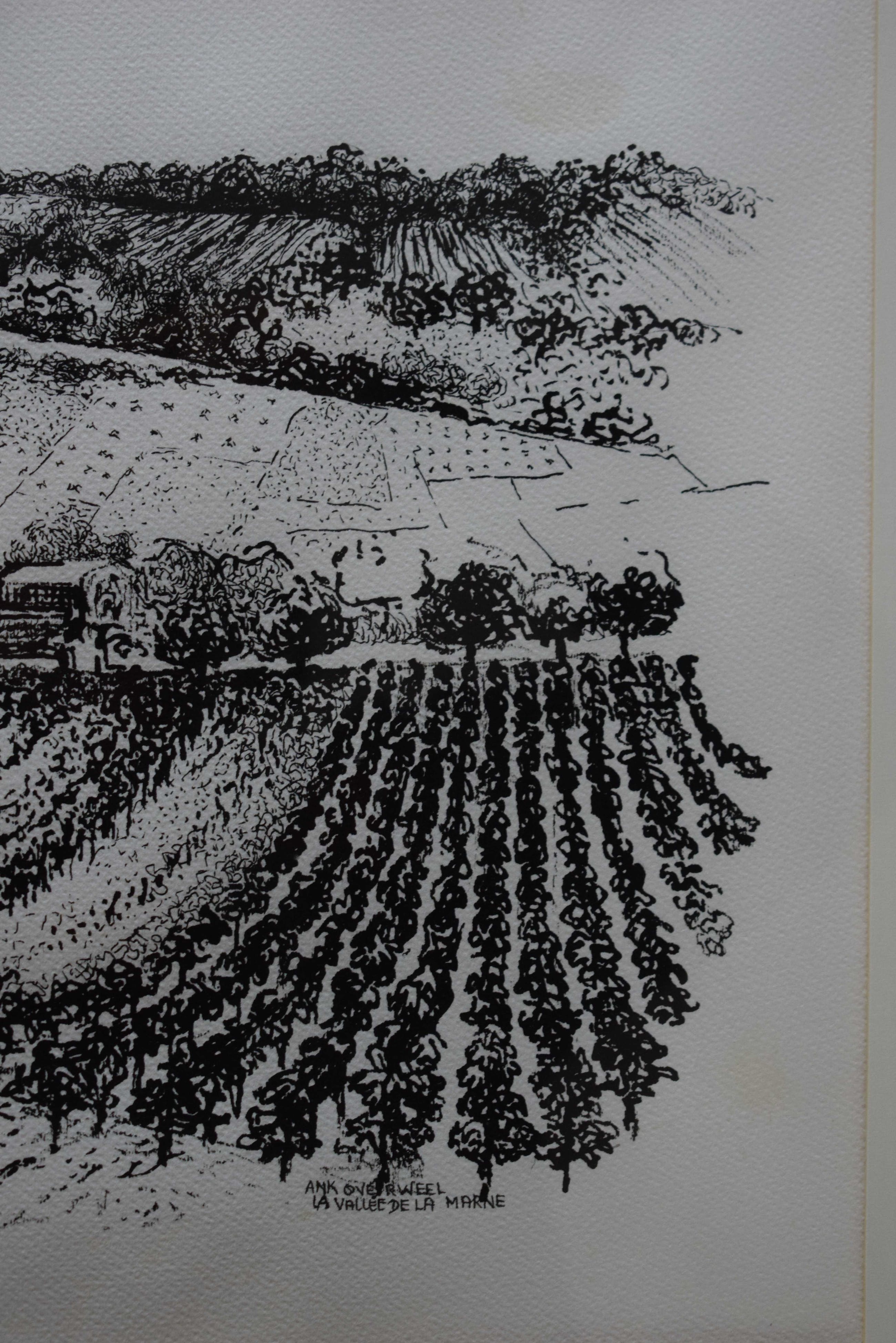 Mooie zwart wit litho van La Vallée de la Marne. Midden in de Champagne streek in Frankrijk ligt dit fraaie stukje land met wijnranken op de schuine hellingen.