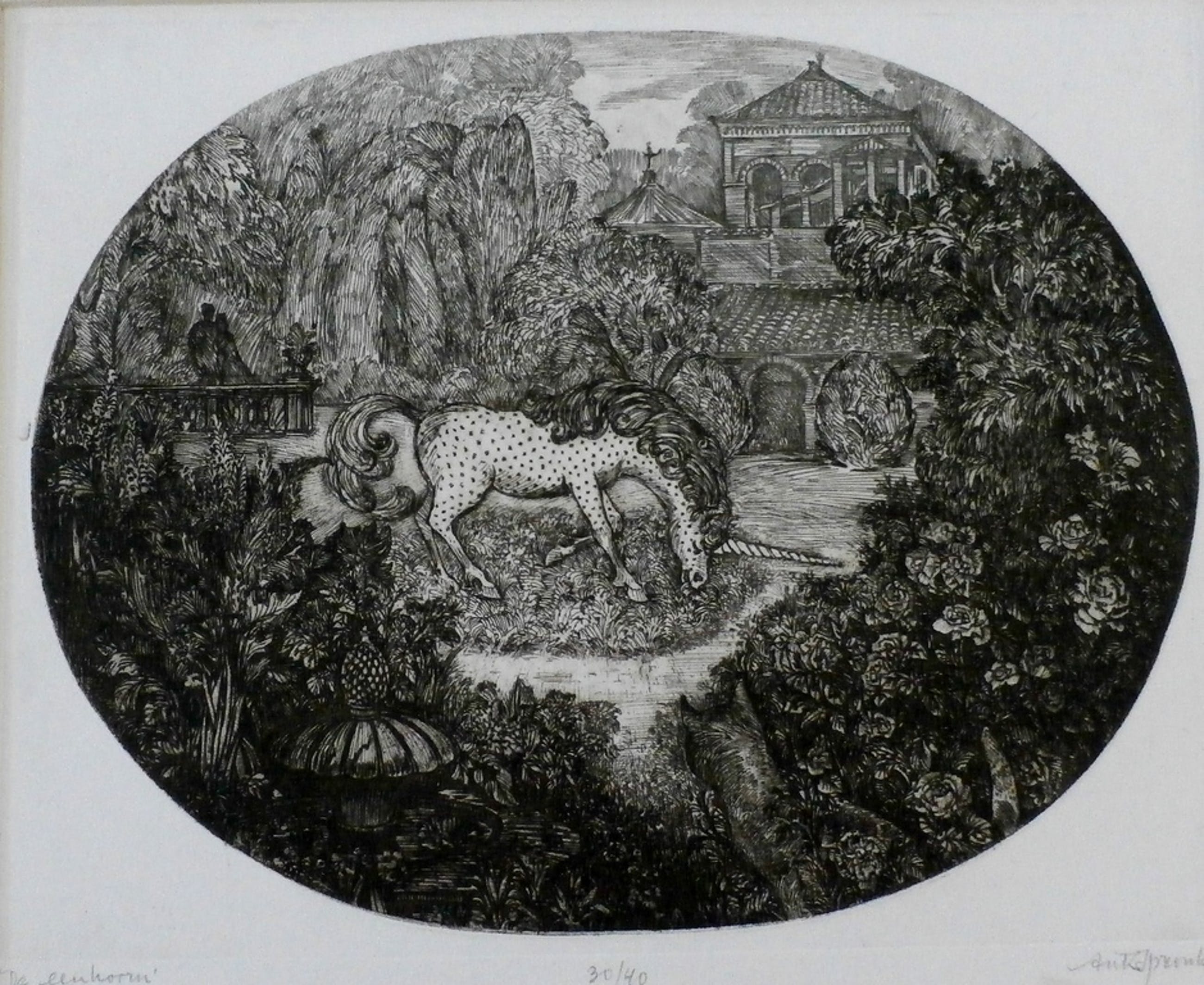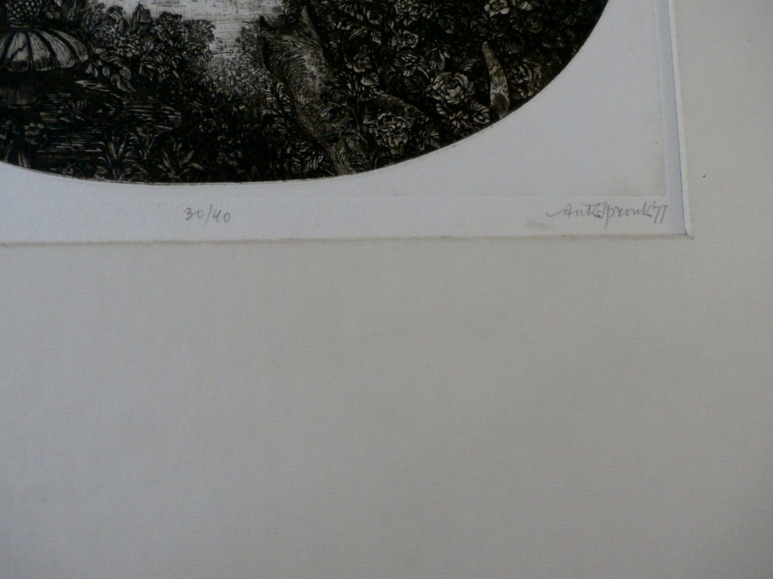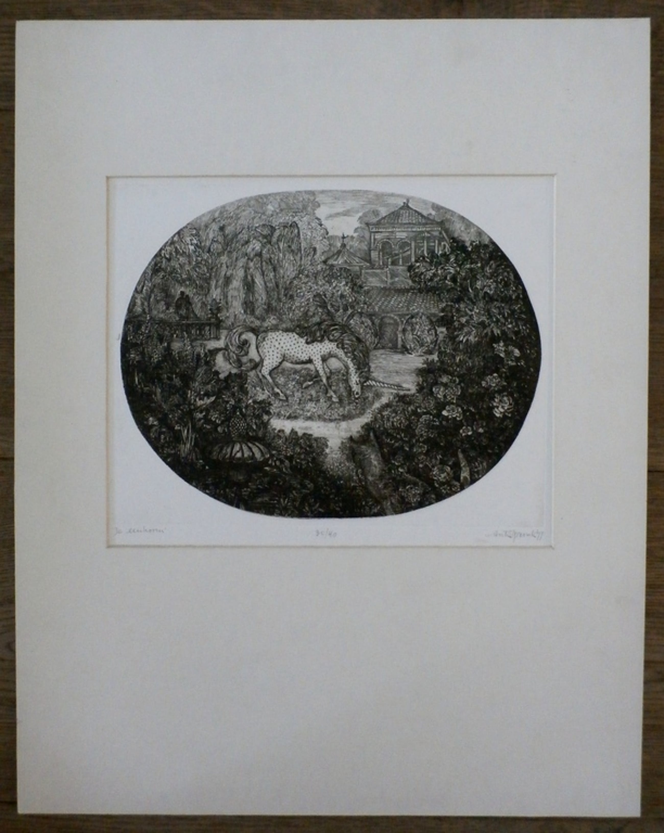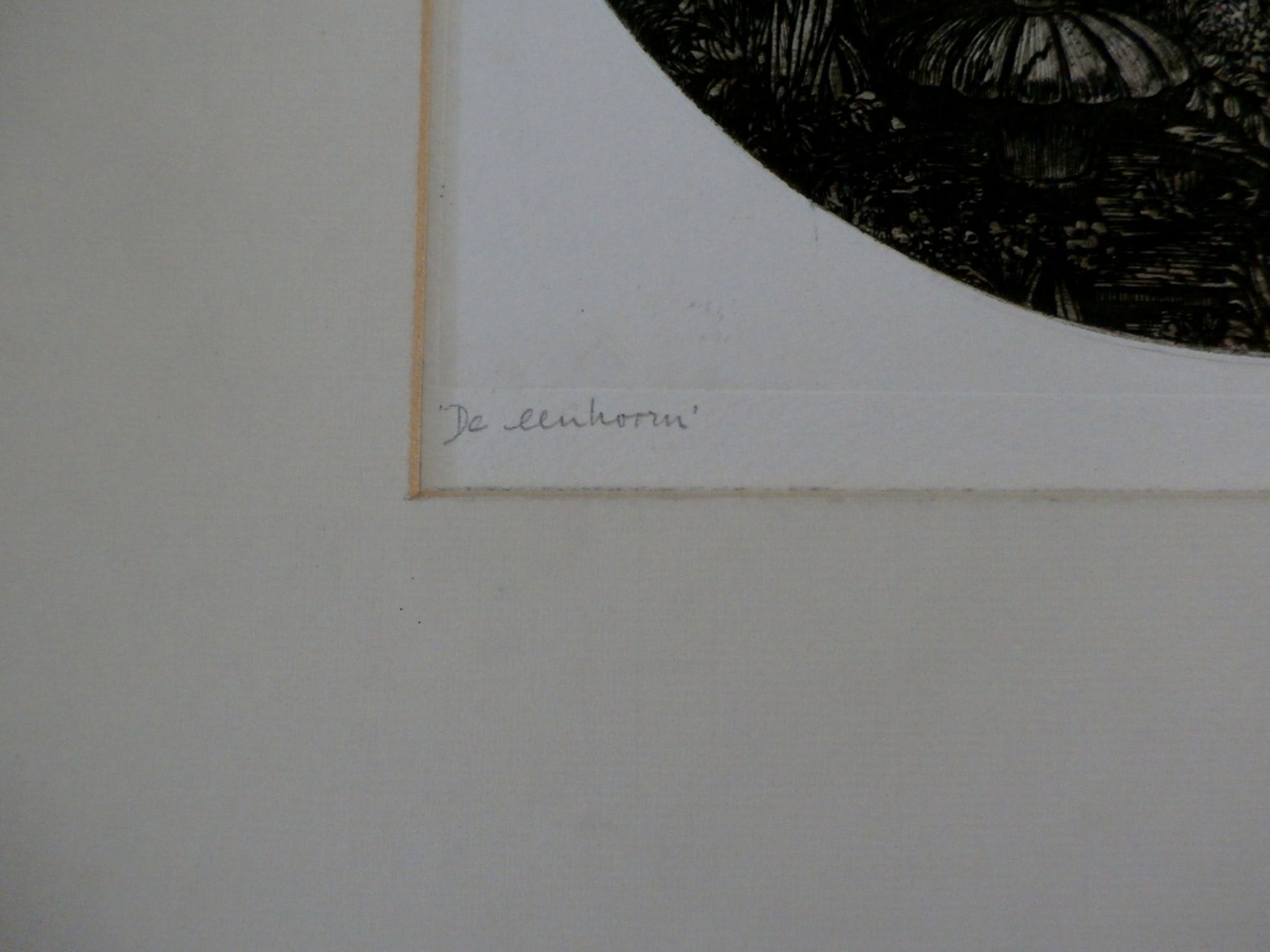 Ets van Ank Spronk uit 1977. Titel: De eenhoorn. Het werk is rechtsonder, met potlood, gesigneerd en gedateerd door de kunstenaar. Nummer: 30/40. Afmetingen incl. passe-partout: h50x b40 cm. Afmetingen werk: H20,5 x b26,5 cm. De authenciteit van dit werk wordt volledig gegarandeerd. Een certificaat van echtheid kan, op aanvraag, worden meegestuurd.