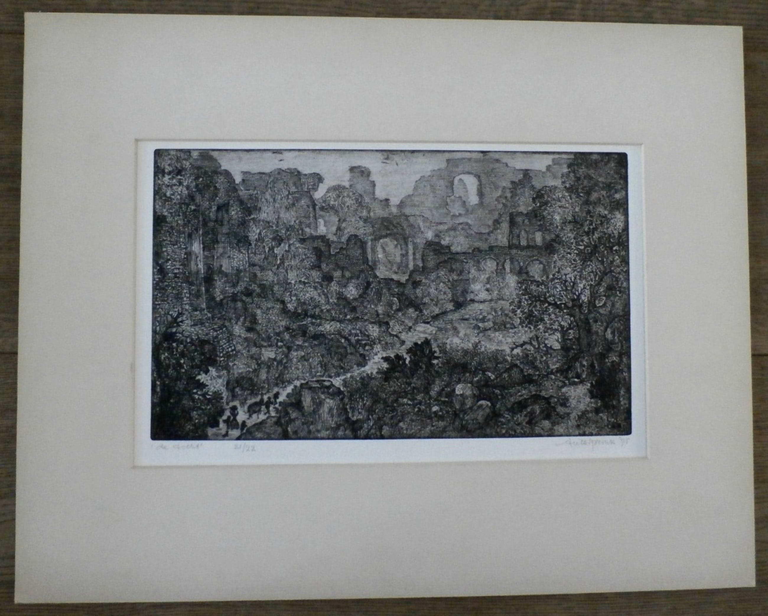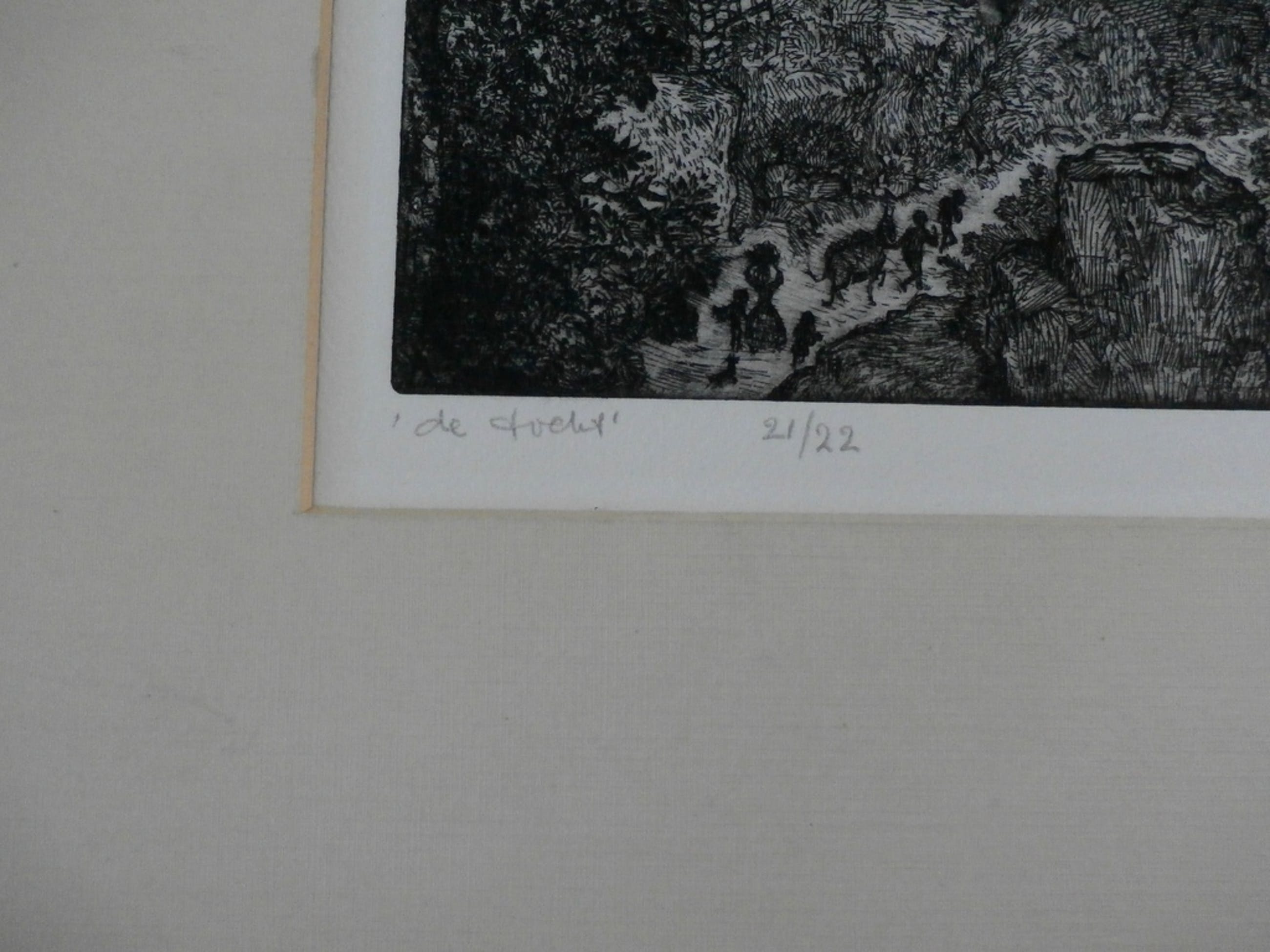 Ets van Ank Spronk uit 1975. Titel: De tocht. Het werk is rechtsonder, met potlood, gesigneerd en gedateerd door de kunstenaar. Nummer: 21/22. Afmetingen incl. passe-partout: h40x b50 cm. Afmetingen werk: H20 x b33 cm. De authenciteit van dit werk wordt volledig gegarandeerd. Een certificaat van echtheid kan, op aanvraag, worden meegestuurd.