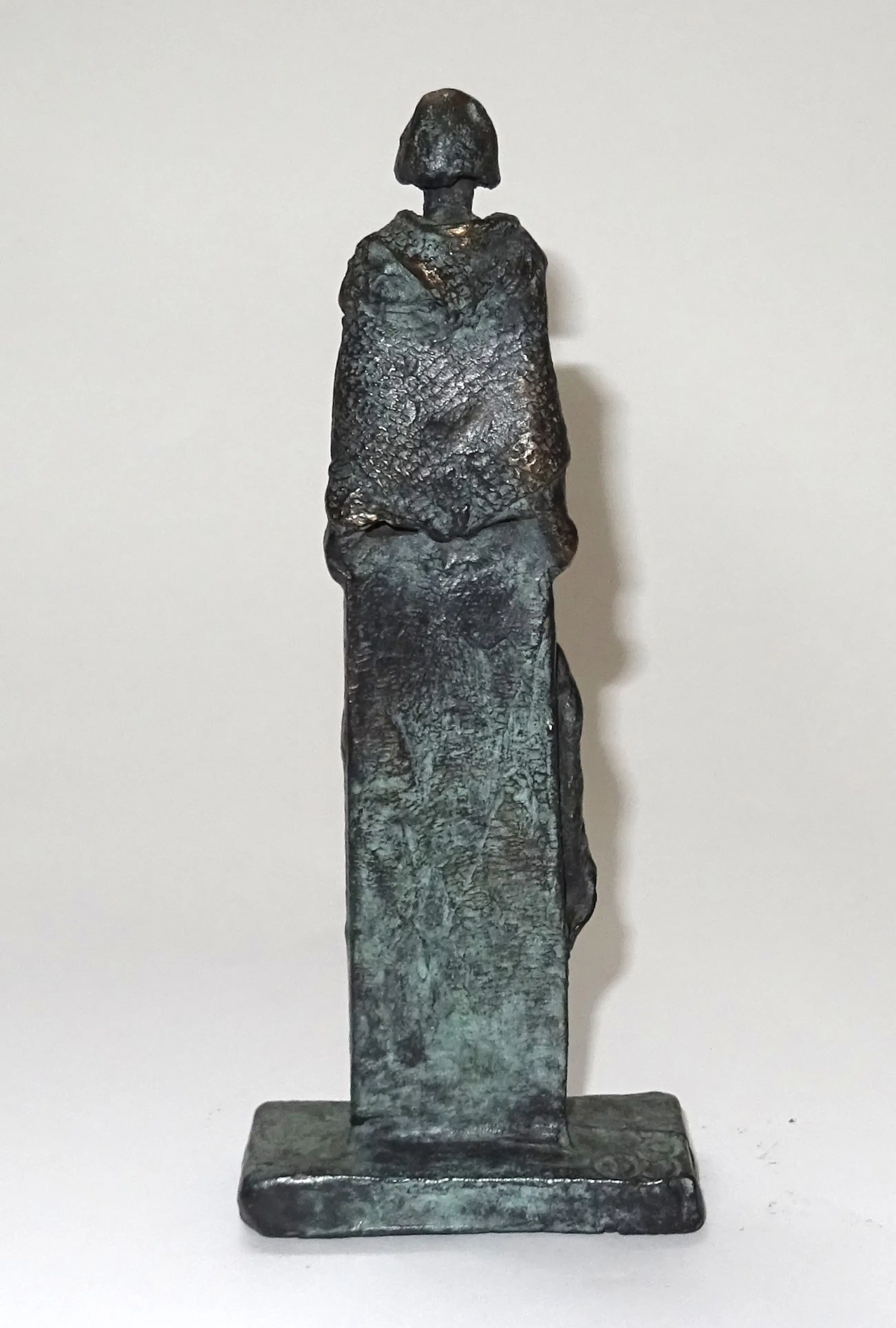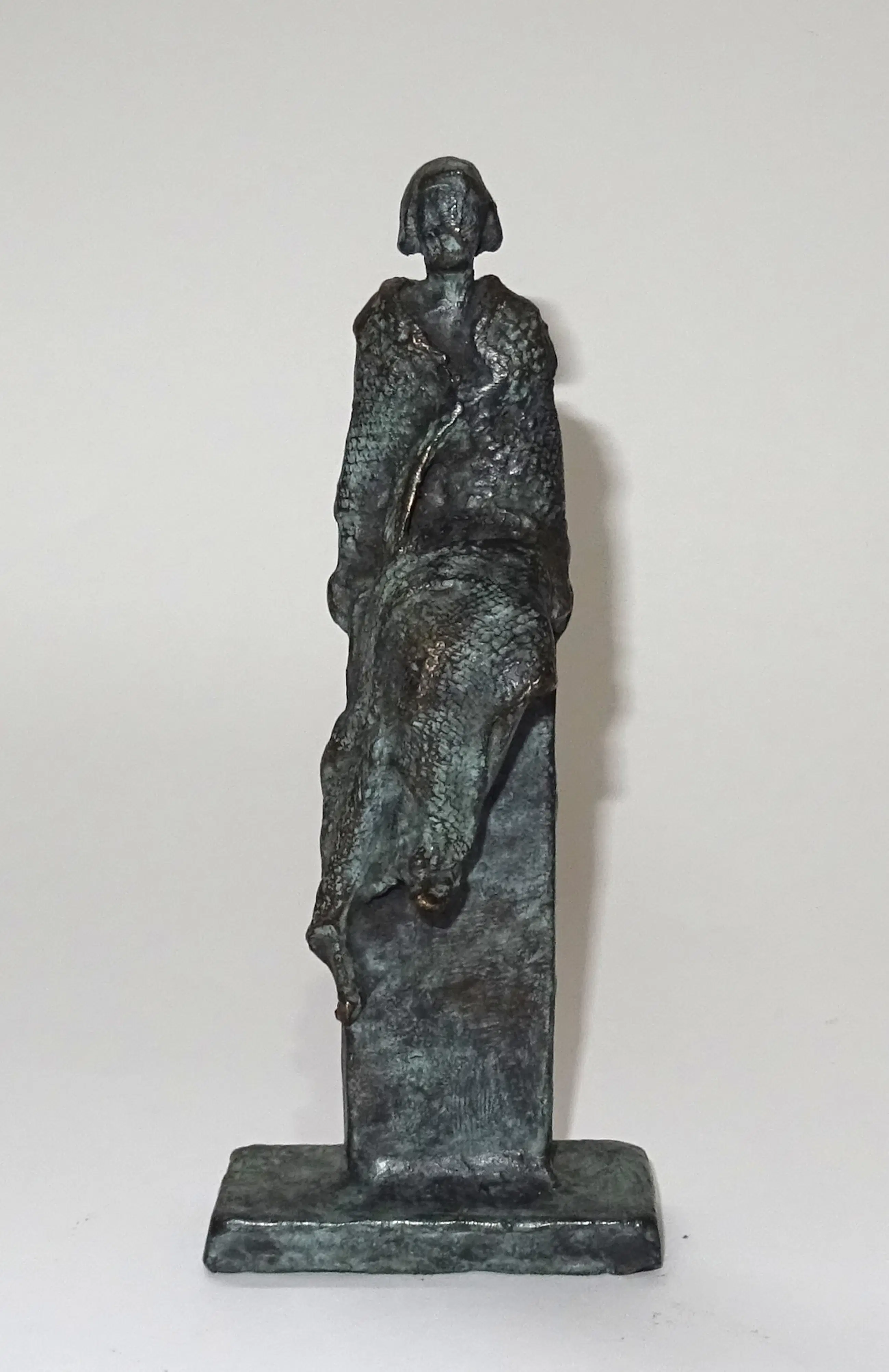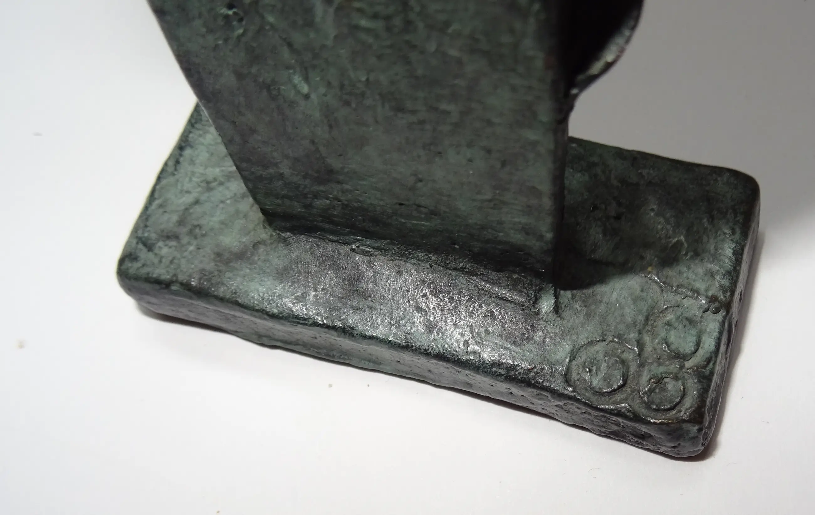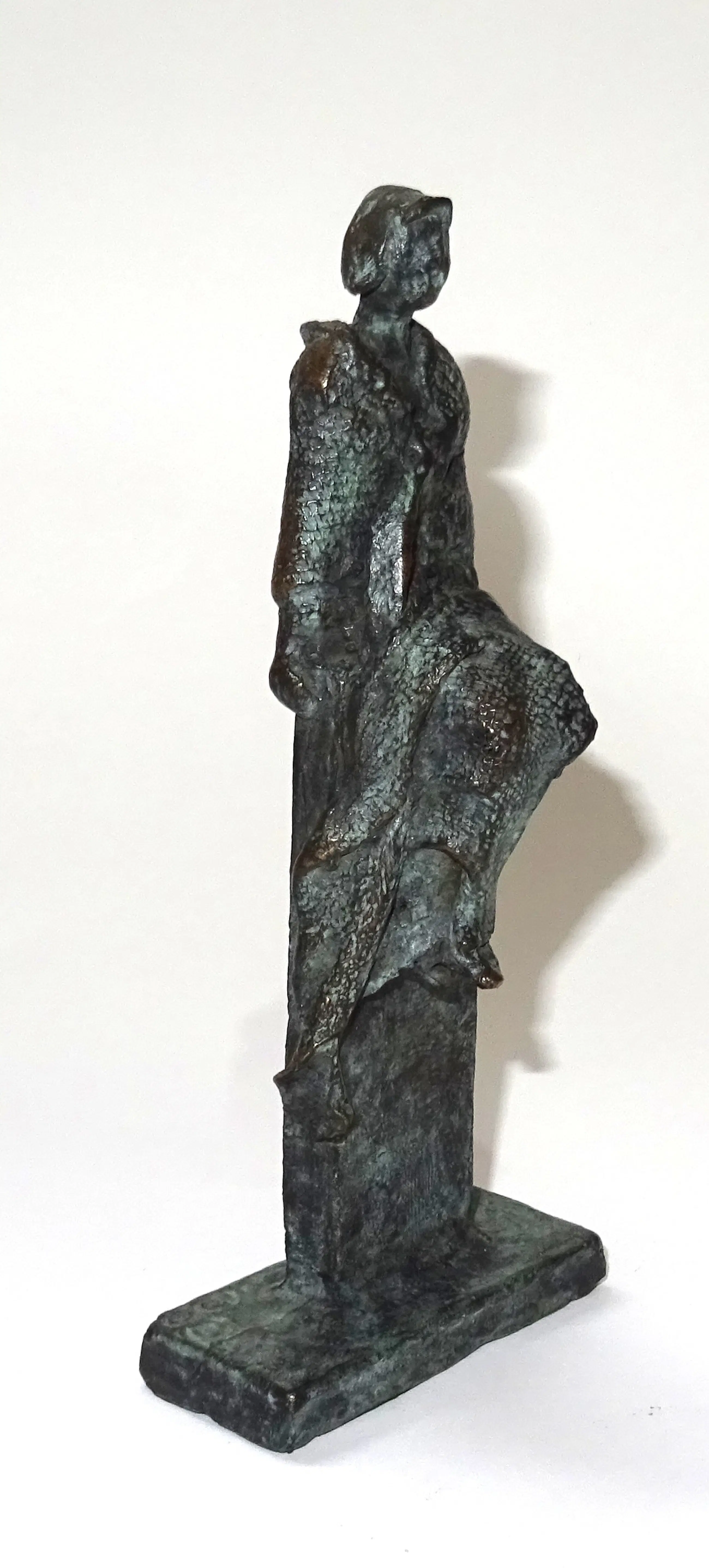 Een gepatineerd bronzen beeldje van een zittende vrouw op sokkel, ontwerp en uitvoering Anke Birnie. Met bronsgietersmerken en onderop gesigneerd en gedateerd.