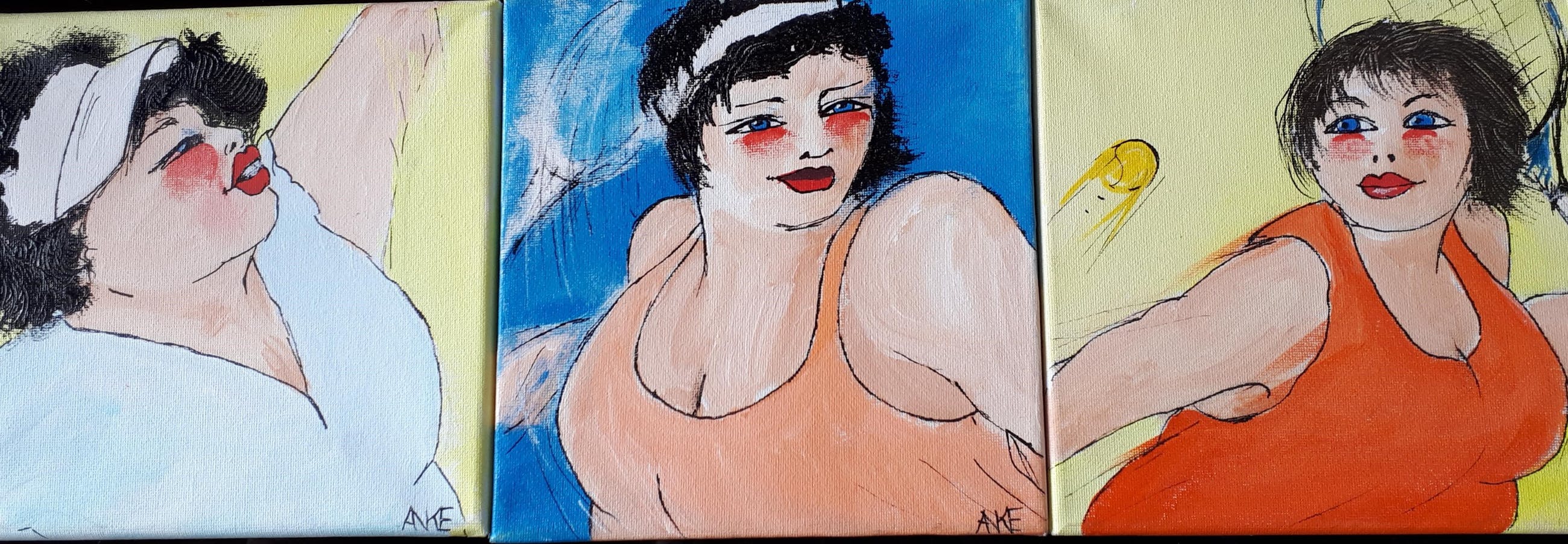 3 kleine schilderijtjes. Anke Peddemors geboren 1947 te Amsterdam. Werkt met acrylverf op doek. Onderwerpen; mensen, dieren en bloemen. Sinds 1975 professioneel kunstenaar. www.ankepeddemors.com