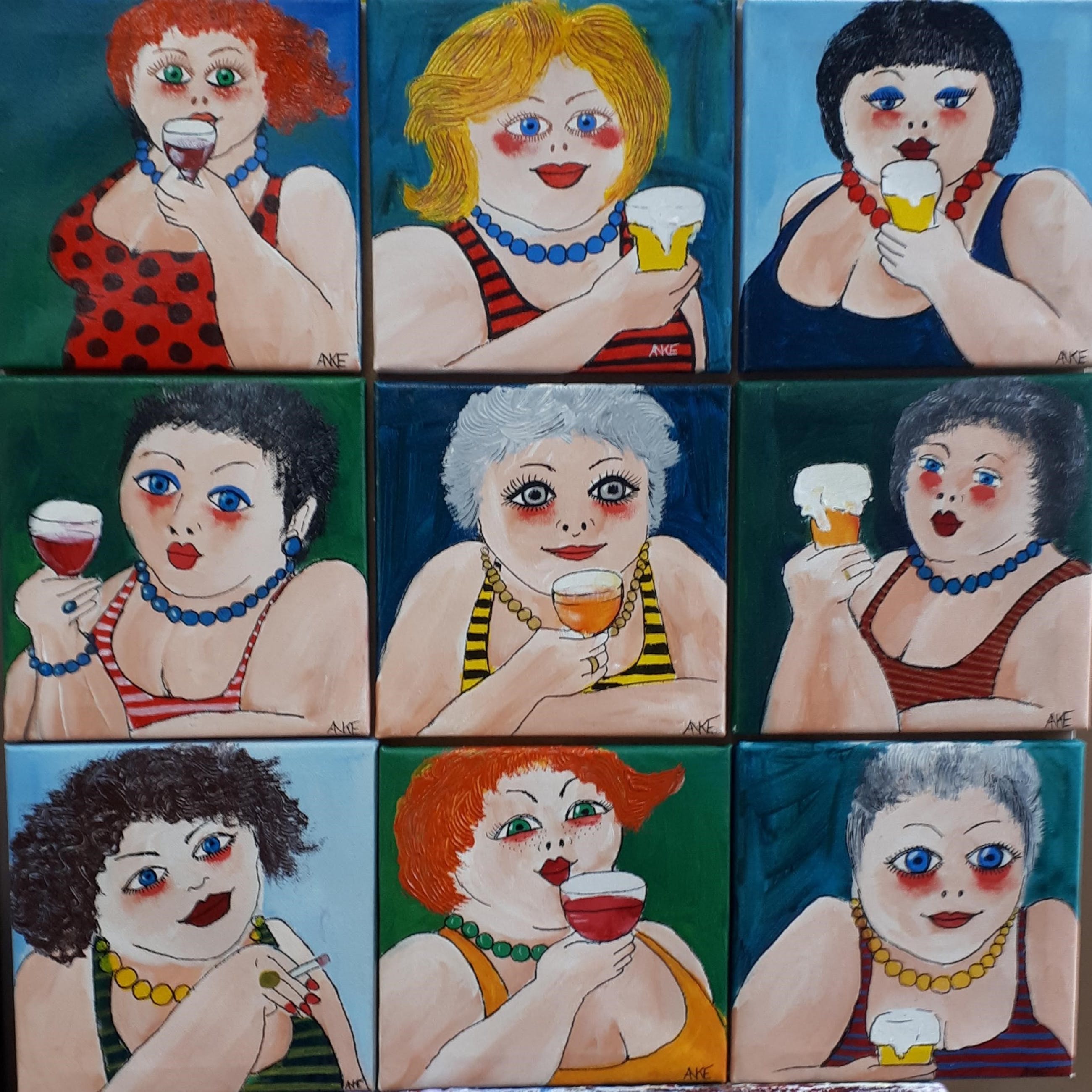 Collage van 9 kleine schilderijtjes.Anke Peddemors geboren 1947 te Amsterdam. Werkt met acrylverf op doek. Onderwerpen; mensen, dieren en bloemen. Sinds 1975 professioneel kunstenaar. www.ankepeddemors.com
