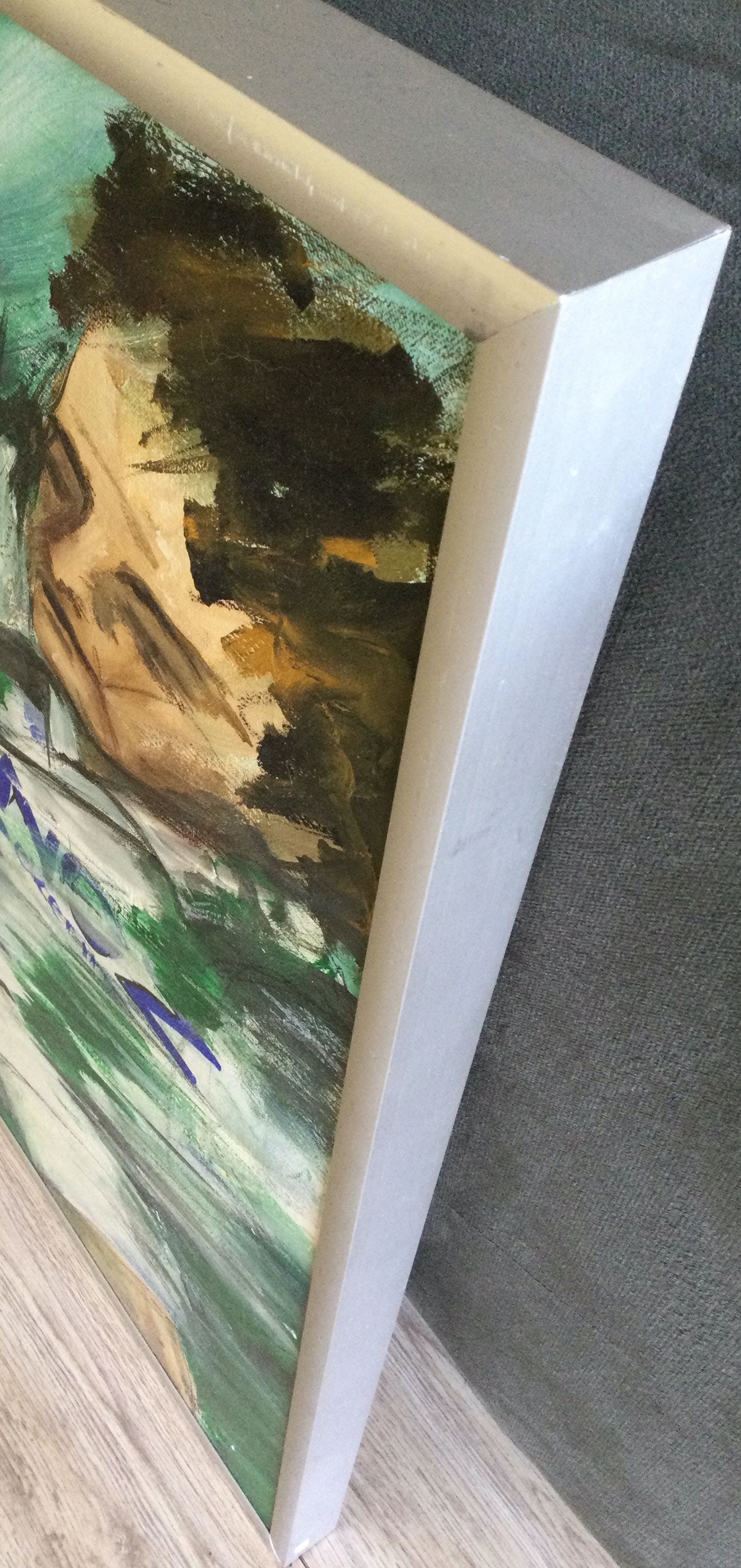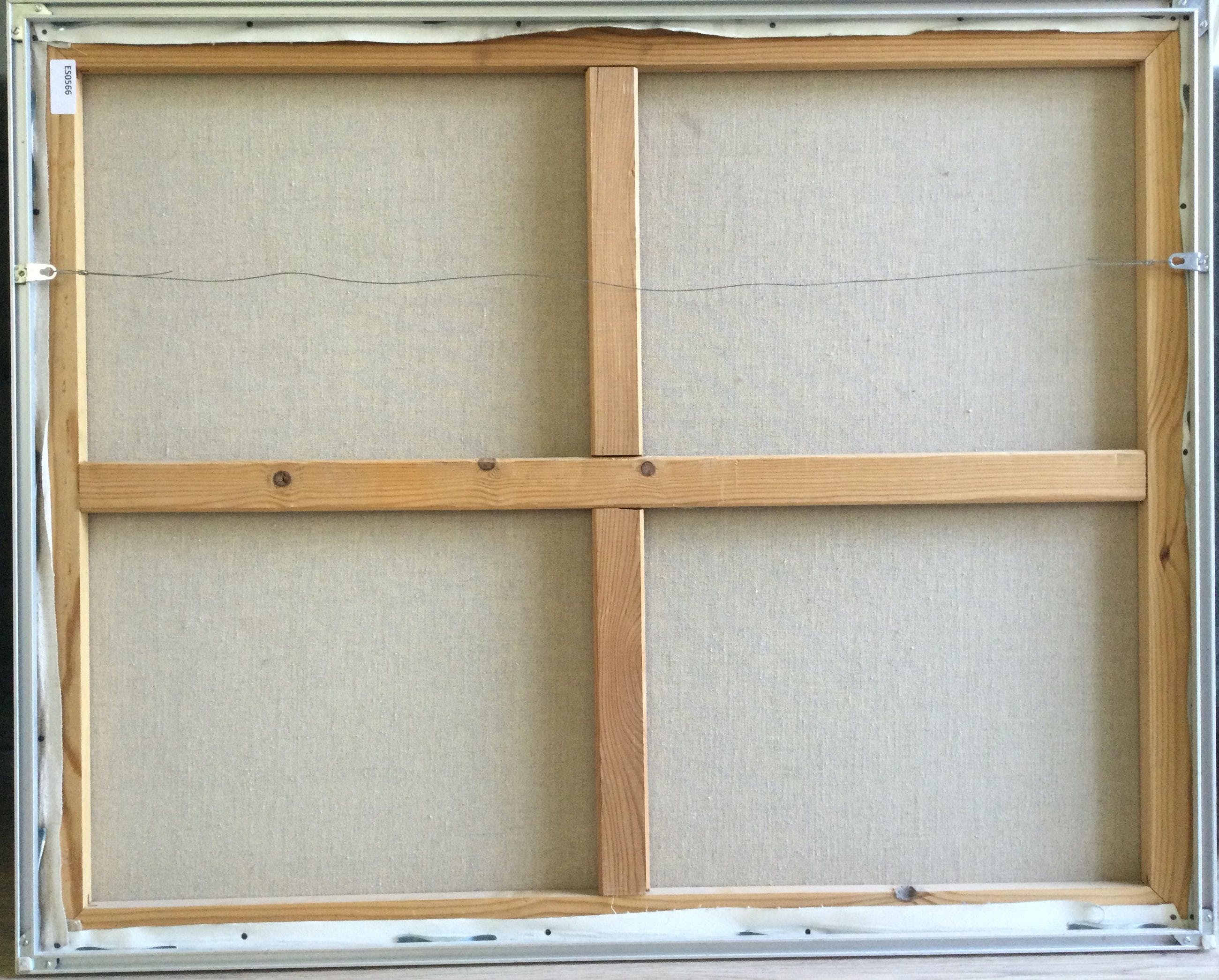 Het spieraam met doek is professioneel geplaatst in een aluminium lijst zonder glas. Op de aluminium lijst zijn enkele krasjes zichtbaar, passend bij de leeftijd van het werk. Met ophang draad.