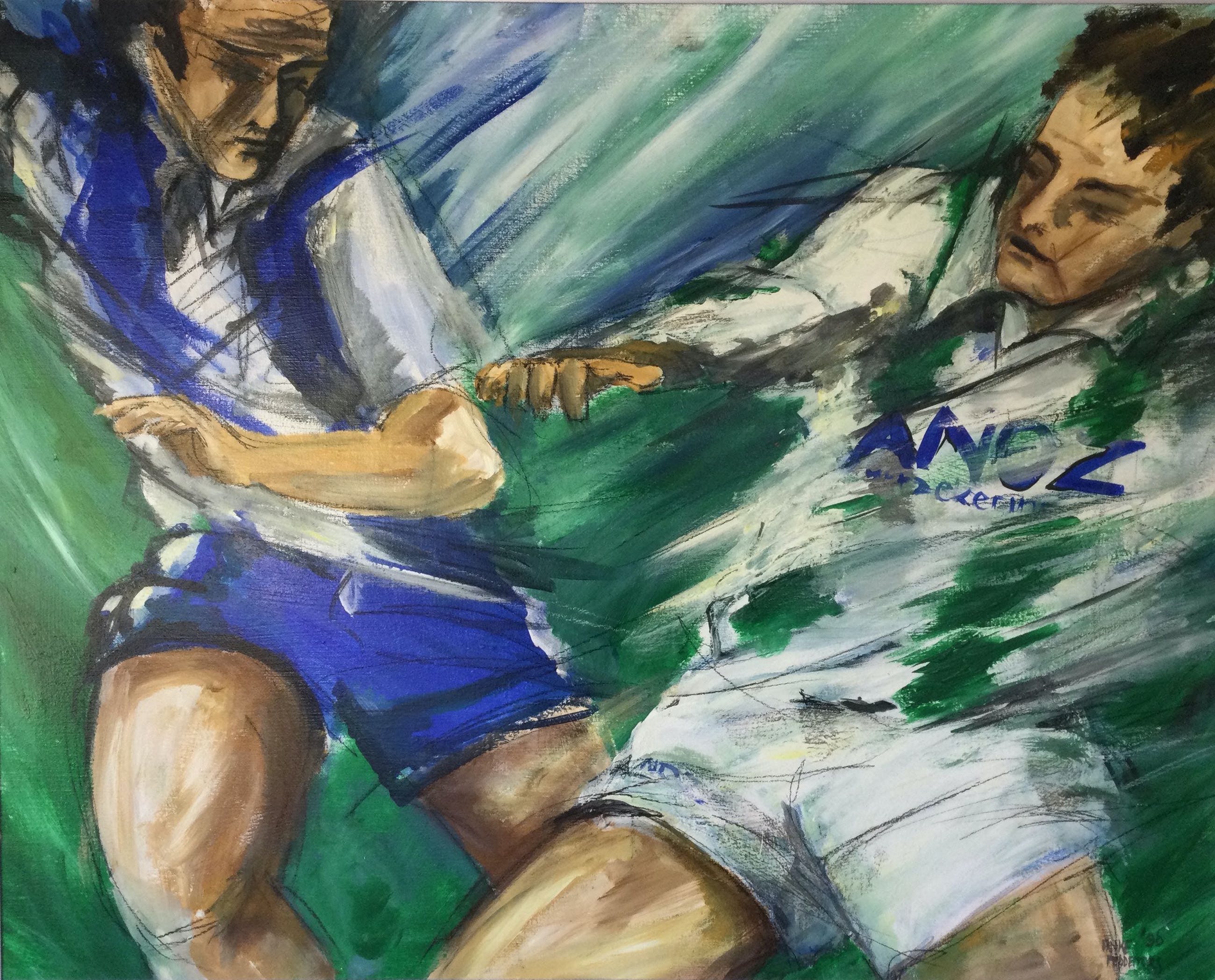 Kunstenaar Anke Peddemors is bekend van haar schilderijen van sporters in actie die zij vooral tot 1996 maakte. Zij is in staat om de dynamiek van de sport treffend uit te beelden. Zo ook met dit schilderij, gemaakt met acrylverf op doek.