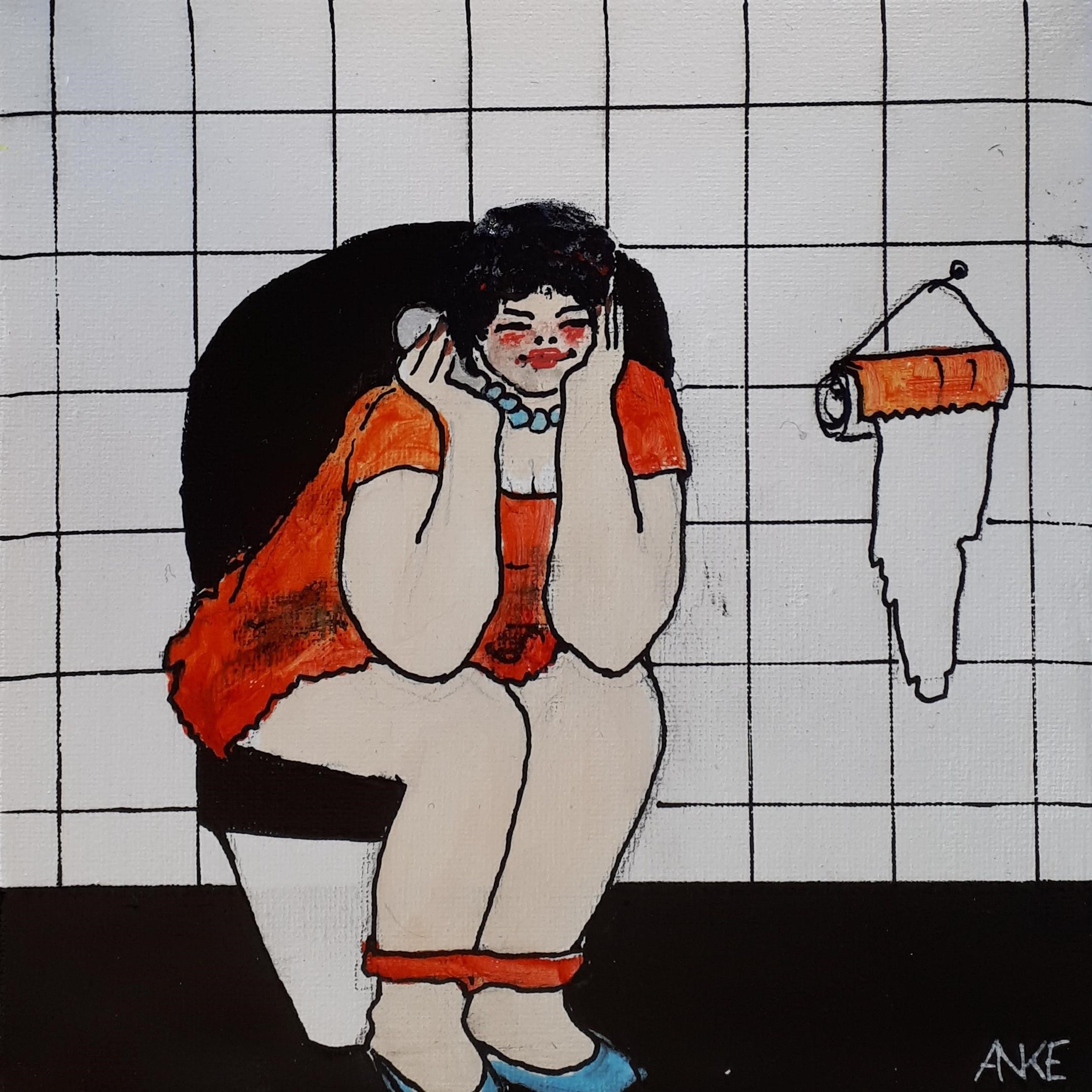 Maakt op verzoek schilderijtjes van mensen op de wc in gewenste kleuren enz.