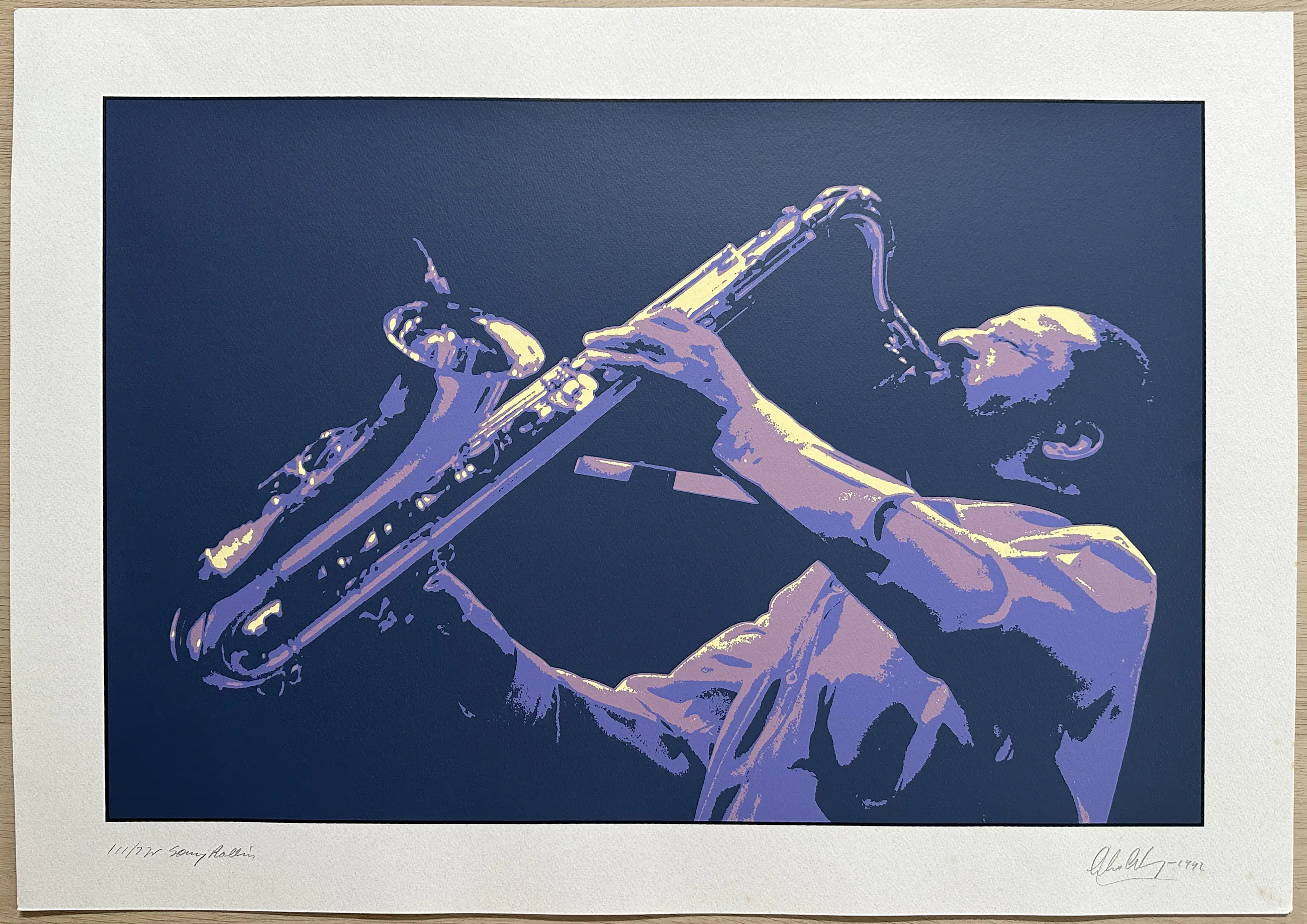 Zeefdruk uit 1992 van jazzmusicus Sonny Rollins, gemaakt door fotograaf Anko C. Wieringa. De zeefdruk is gemaakt in een oplage van 275. Dit betreft afdruk 111/275. Gedrukt op zuurvrij papier, papierformaat 50 x 70 cm, beeldformaat 40 x 60 cm. Handgesigneerd en genummerd door de kunstenaar. De zeefdruk is in uitstekende staat. Rechts naast de signatuur zijn een paar kleine vlekjes te zien.