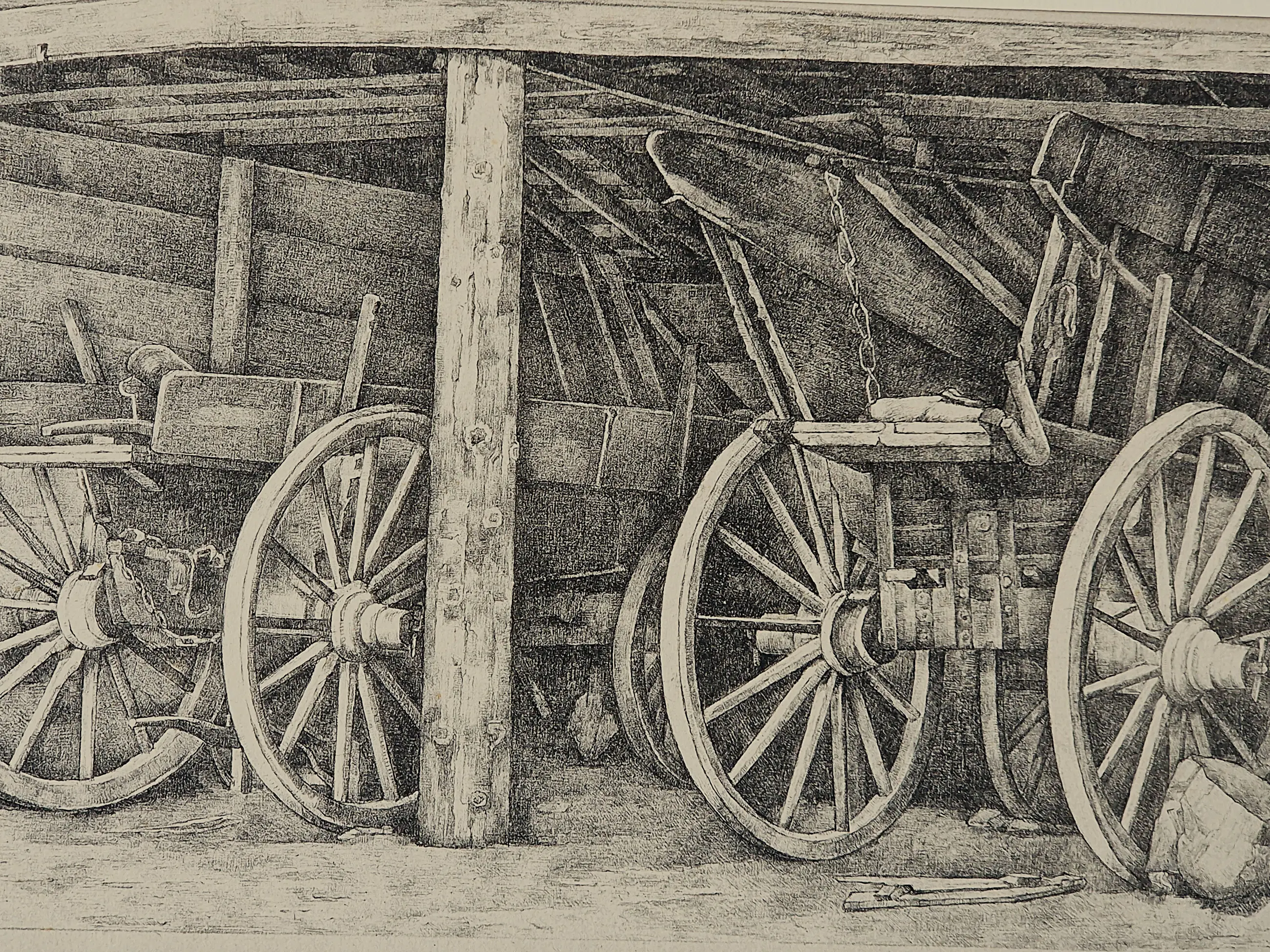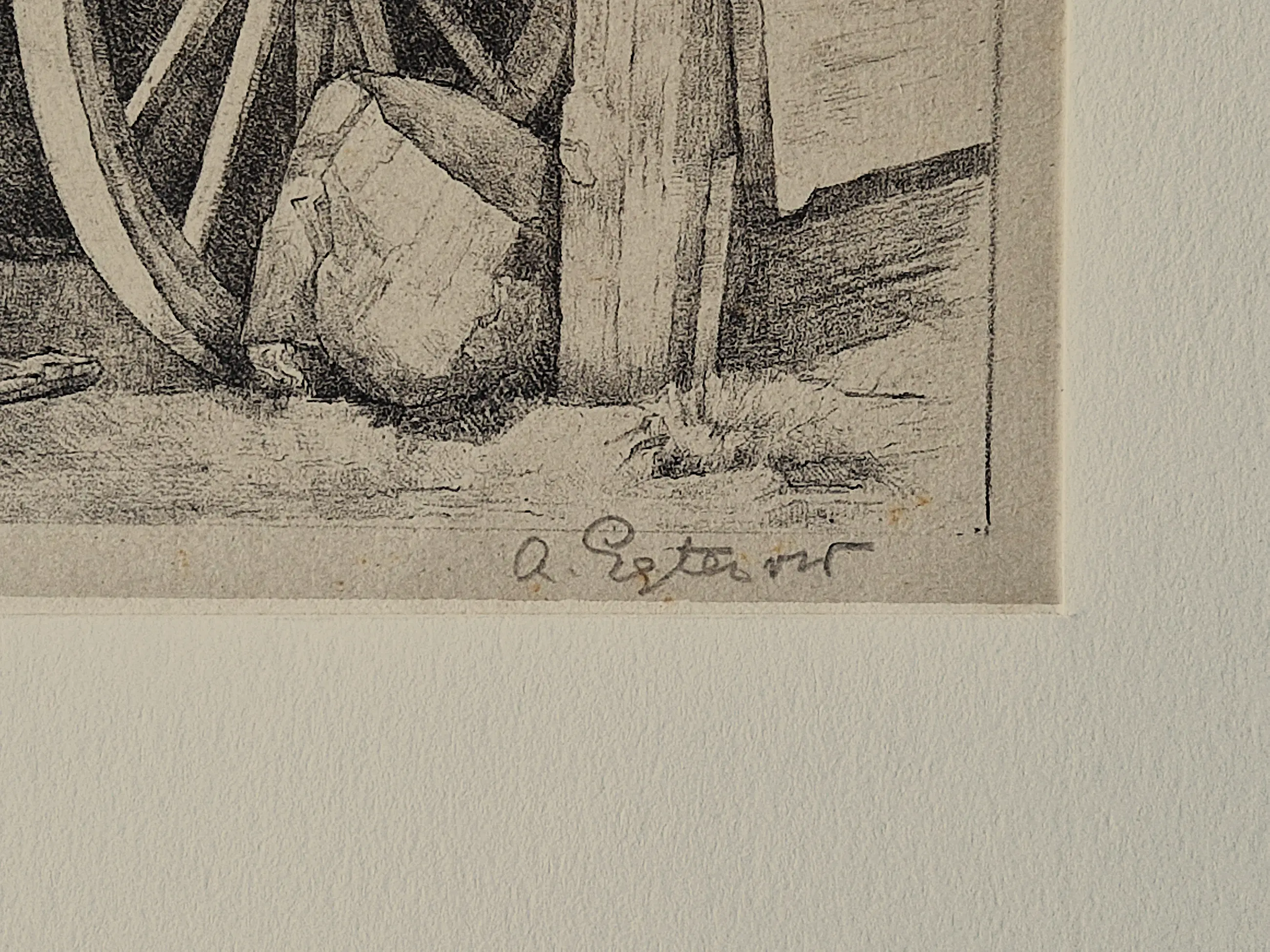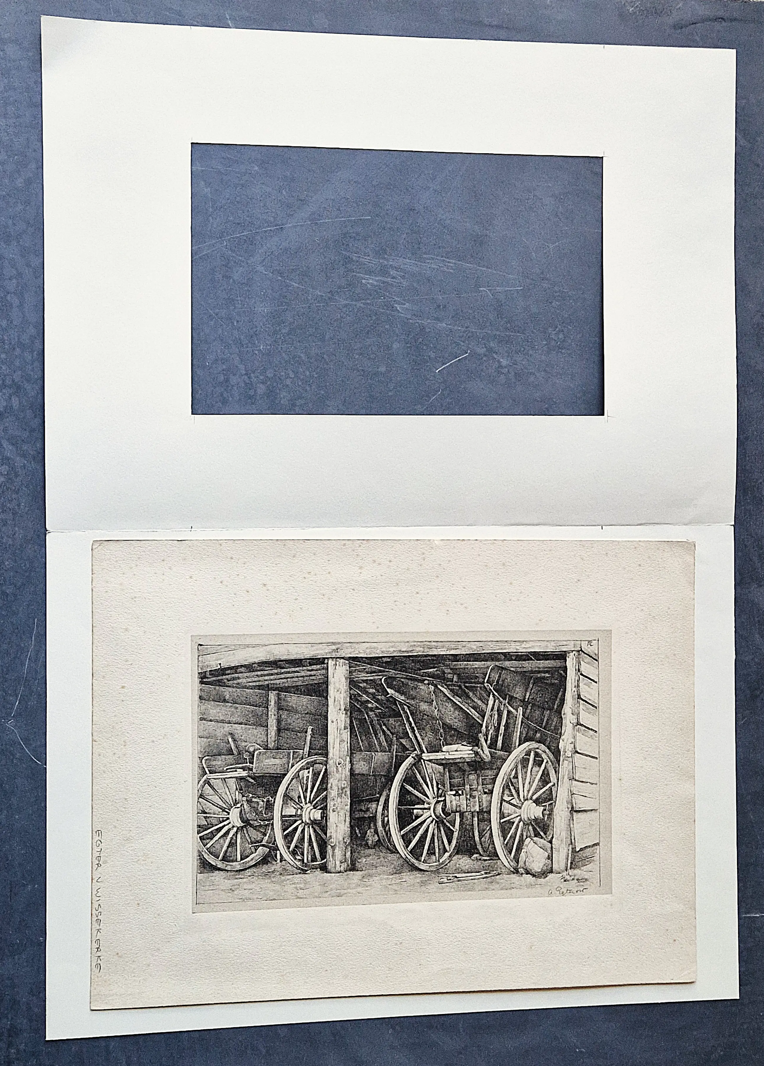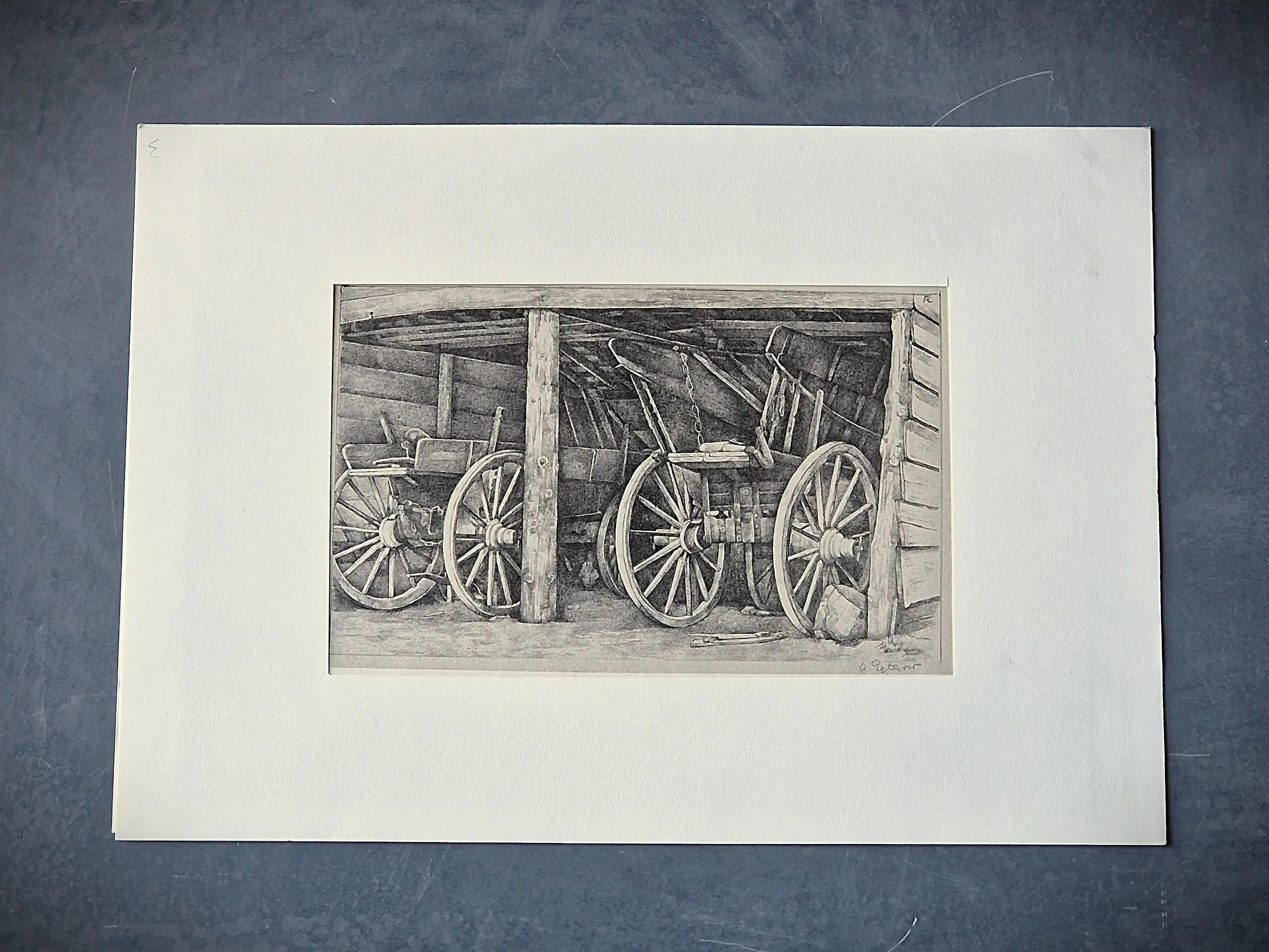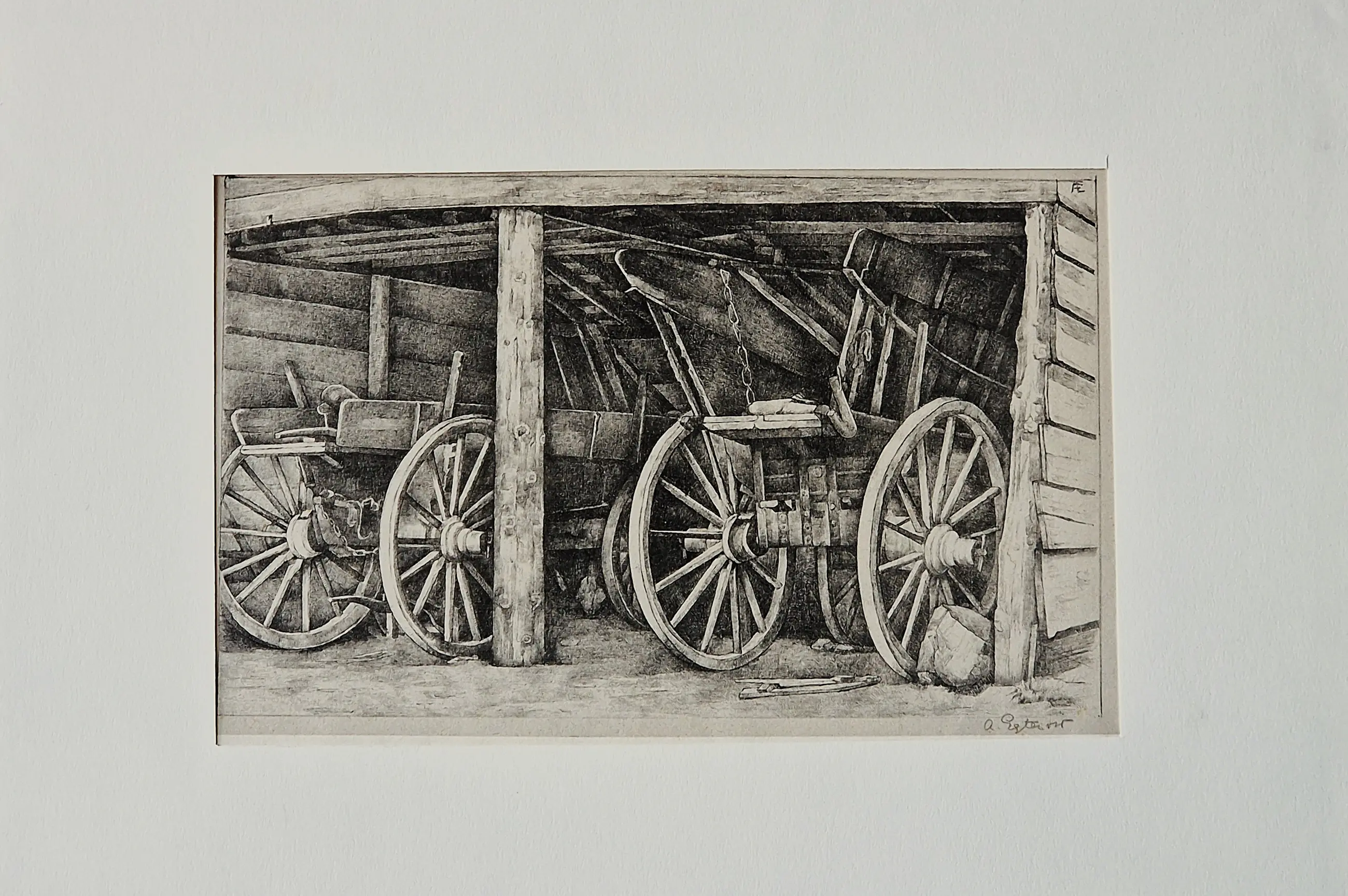 Anna Egter van Wissekerke - fraaie realistische jaren 30 Ets - karren in schuur - potlood gesigneerd