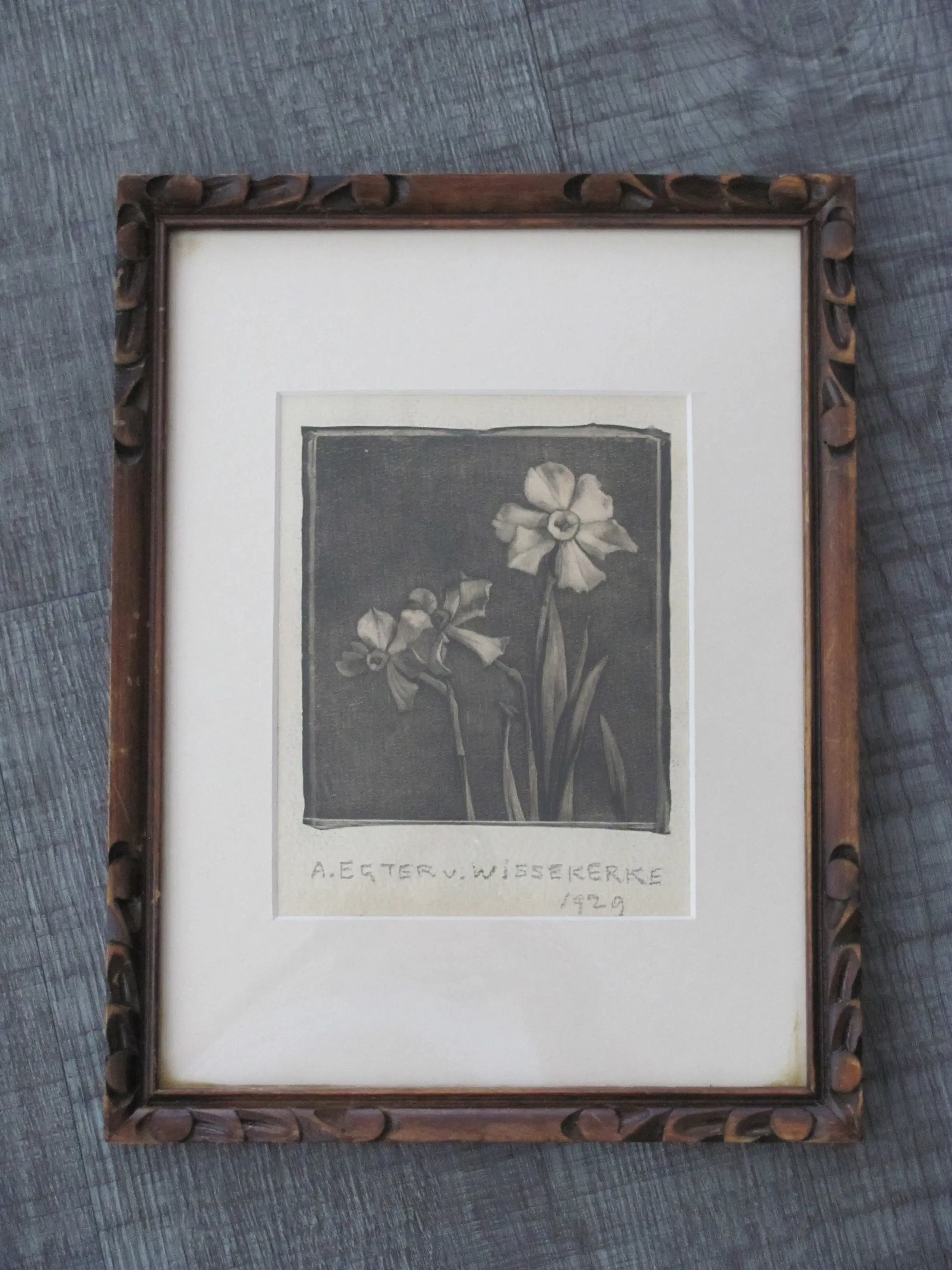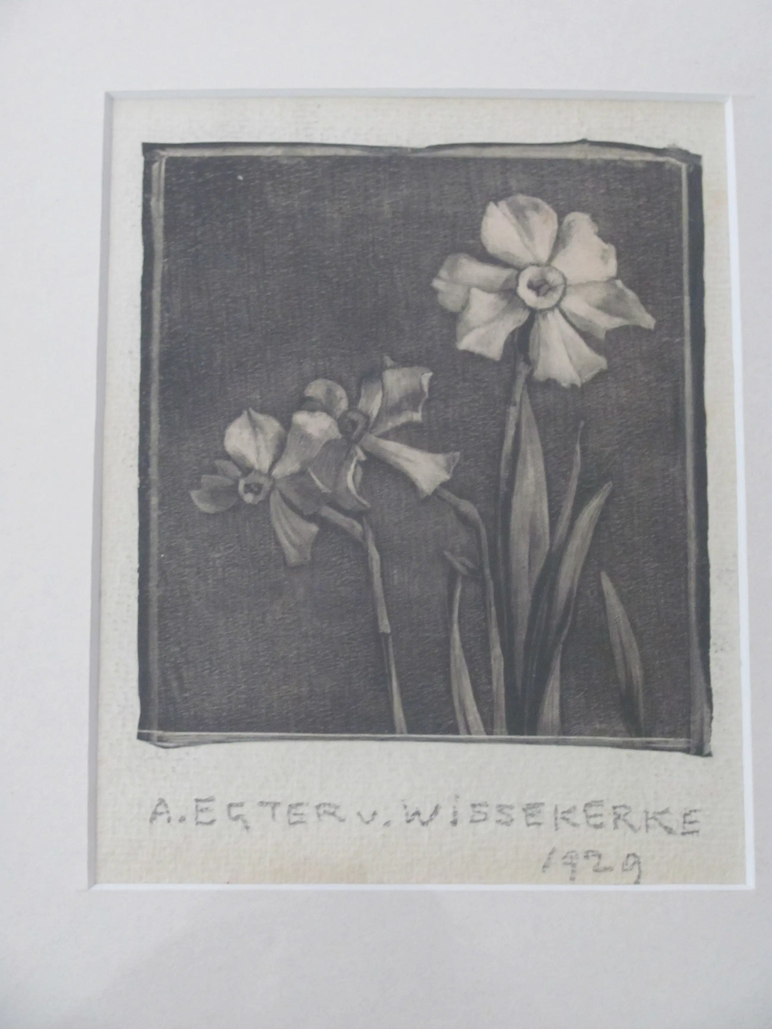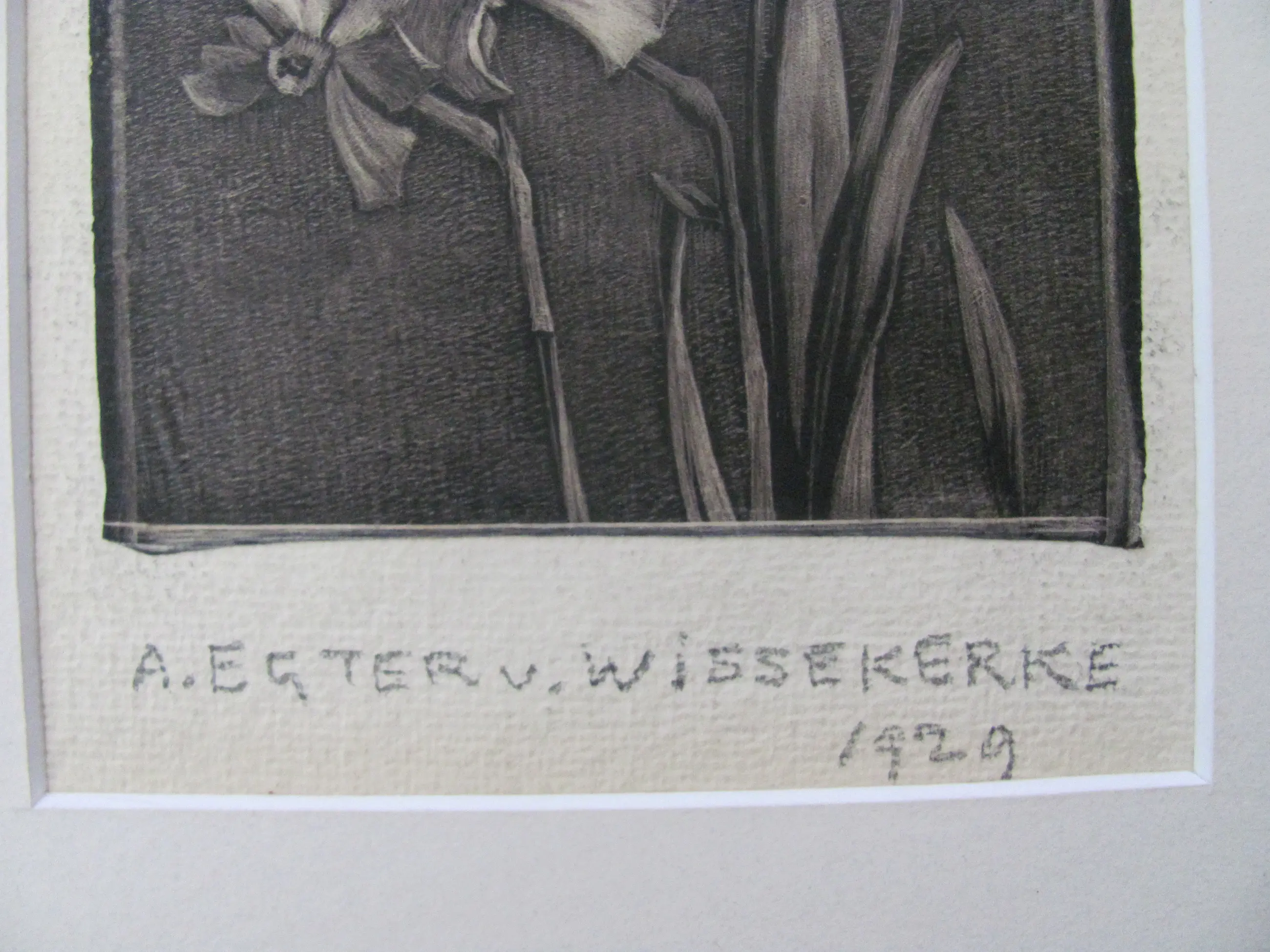 Houtsnede op dun rijstpapier van A. Egter v. Wissekerke. Onder de ets/houtsnede is met potlood de naam geschreven en tevens gedateerd (1929). Ondanks de ouderdom in mooie staat.
