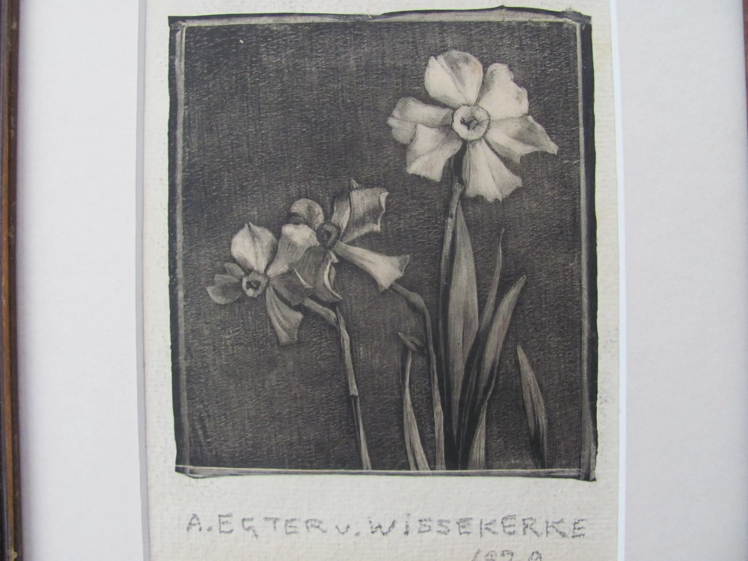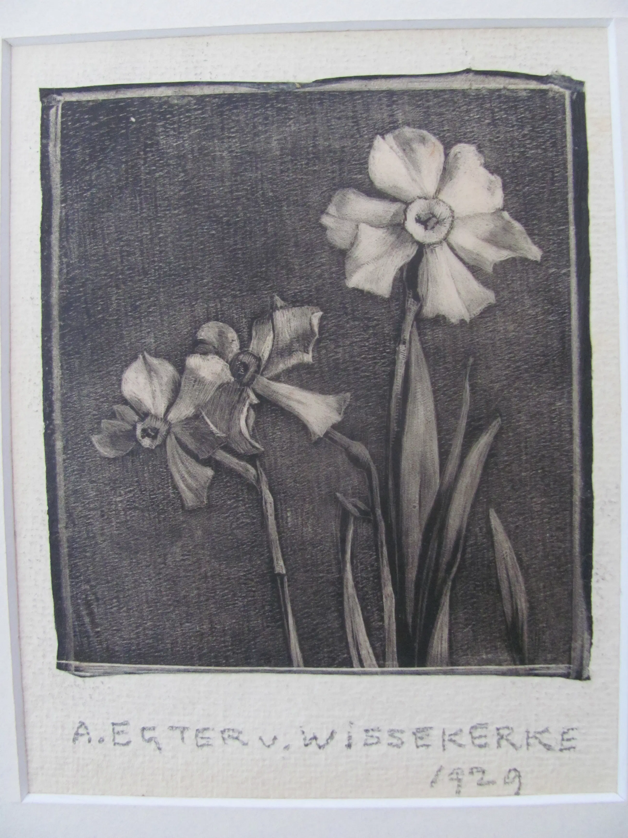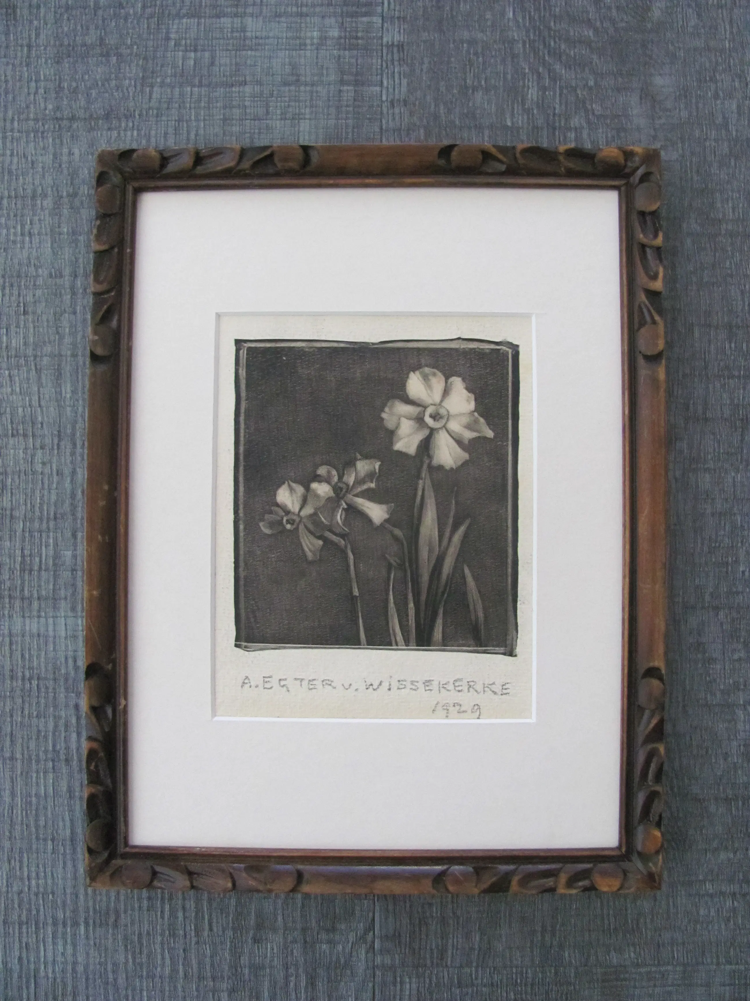 Houtsnede op dun rijstpapier van A. Egter v. Wissekerke. Onder de ets/houtsnede is met potlood de naam geschreven en tevens gedateerd (1929). Ondanks de ouderdom in mooie staat.
