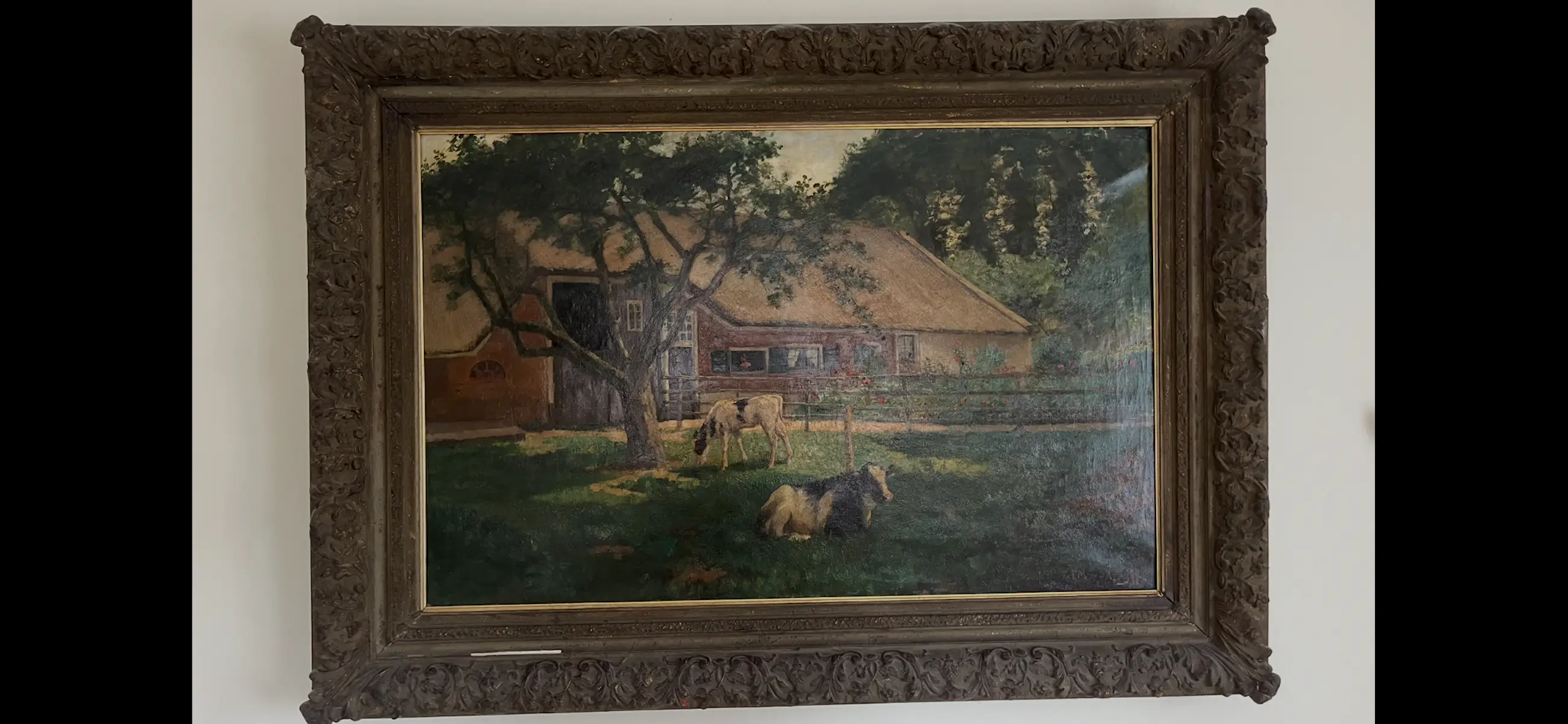 Anna Maria Stork-Kruijff - Gezicht op boerderij, op de voorgrond 2 kalfjes bij boom