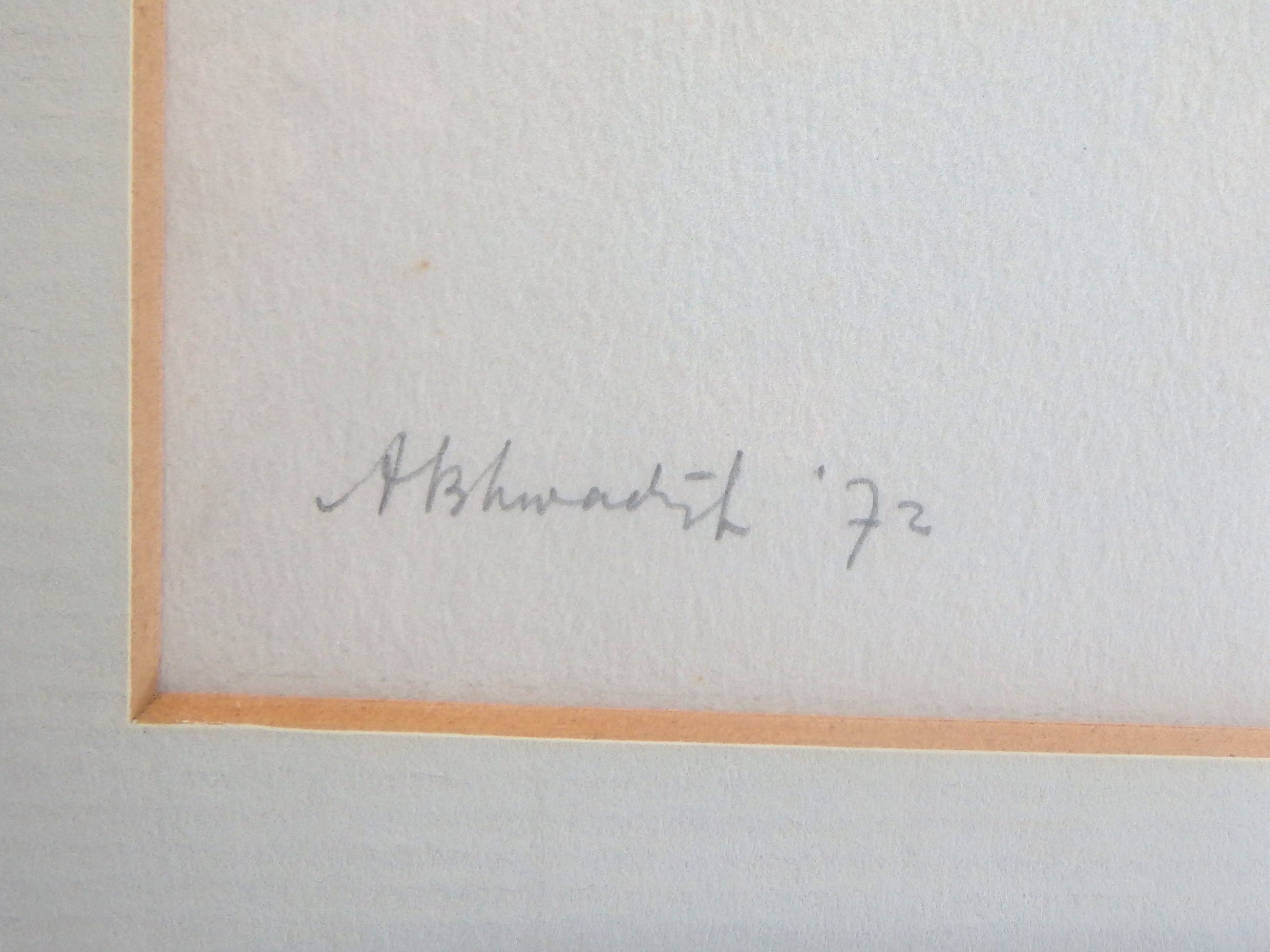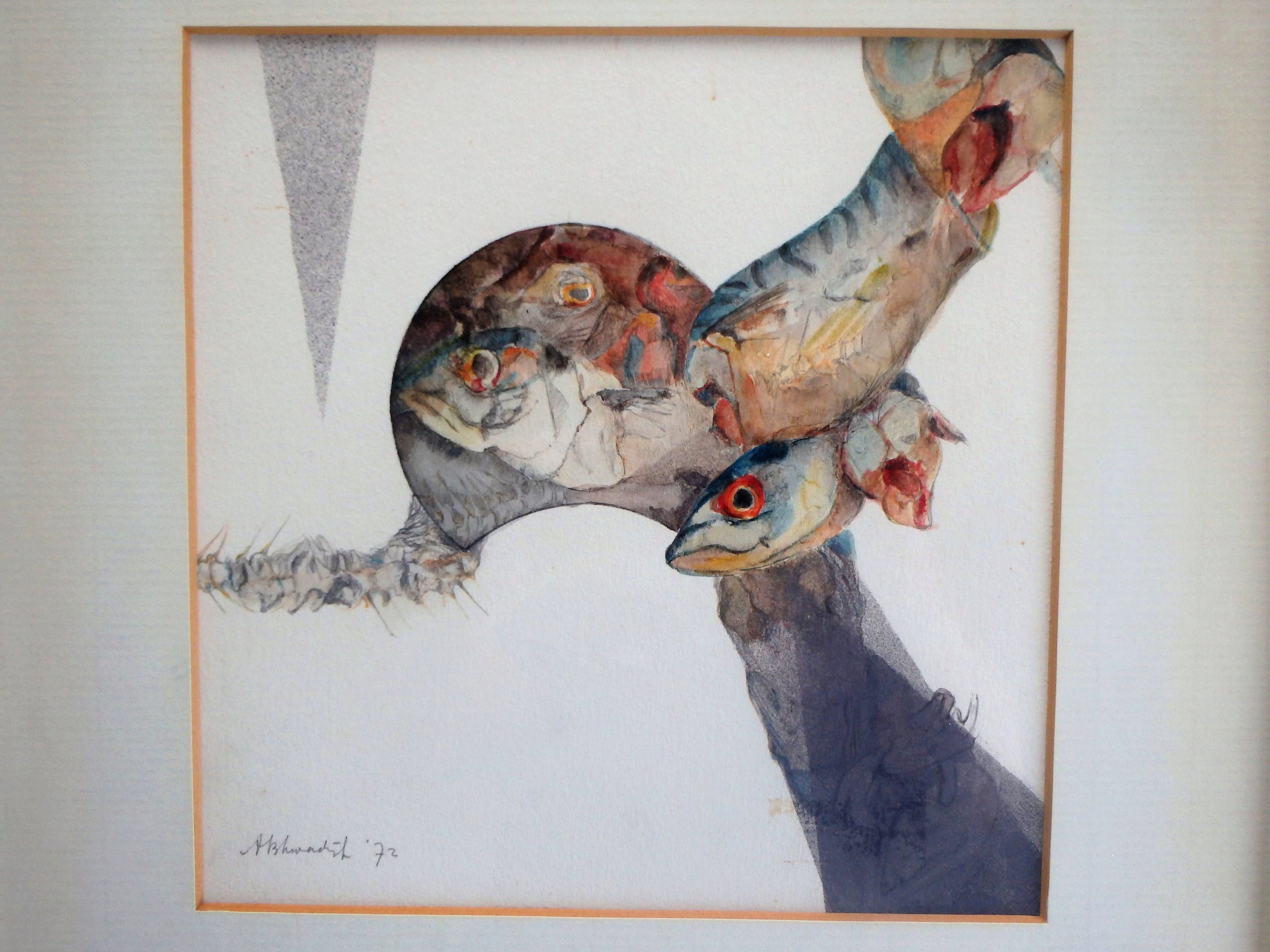 "bijzondere" aquarel, linksonder met potlood gesigneerd A.B. Kwadijk en gedateerd '72, mooi ingelijst in passe-partout en achter glas.
