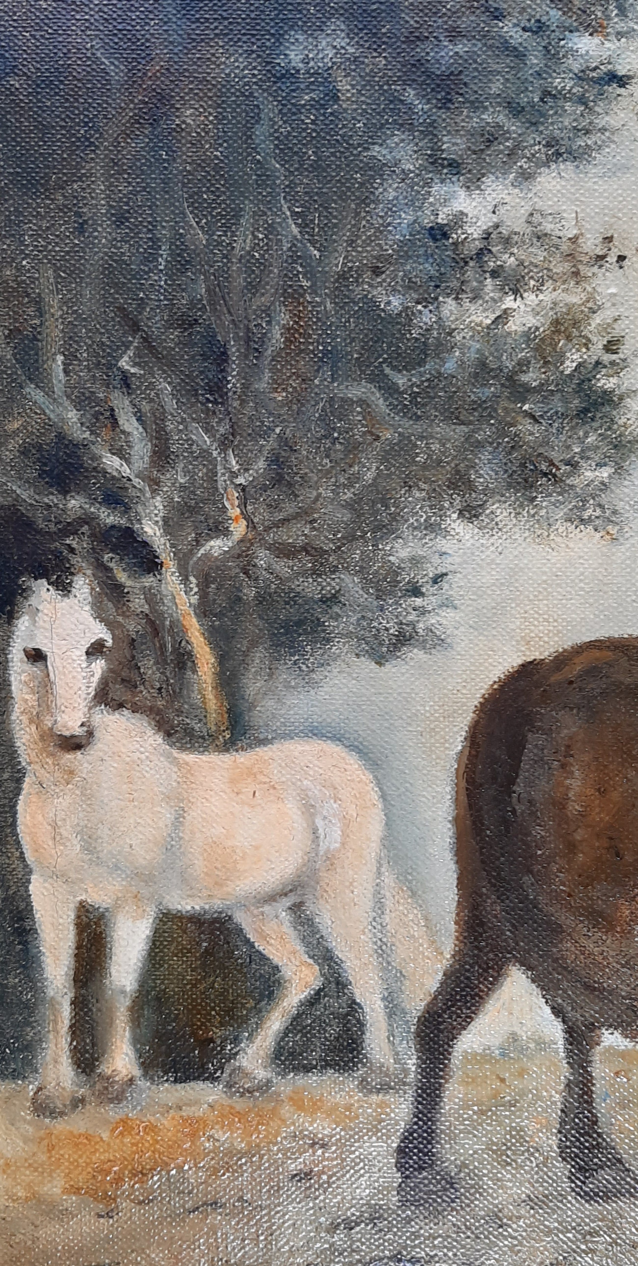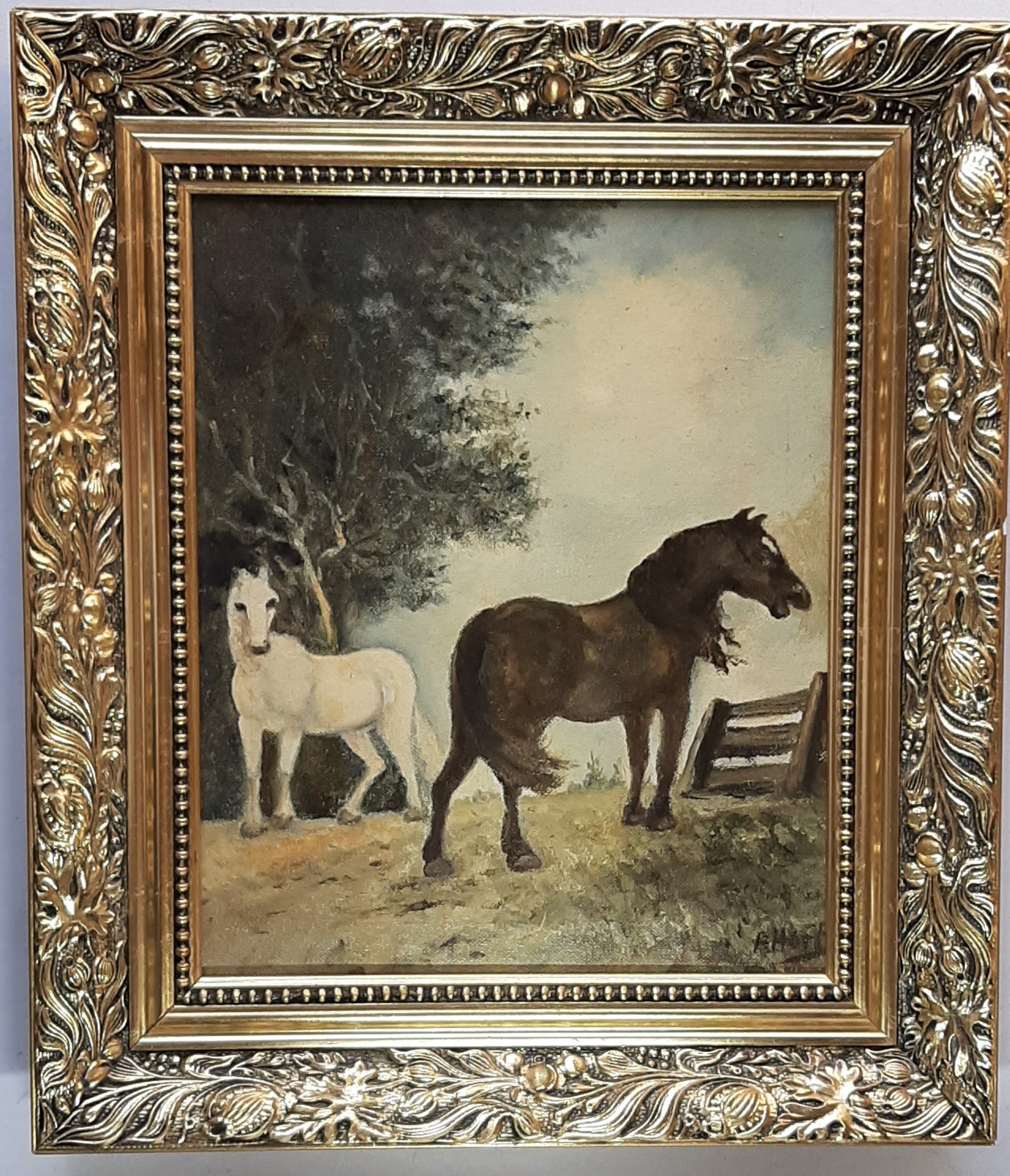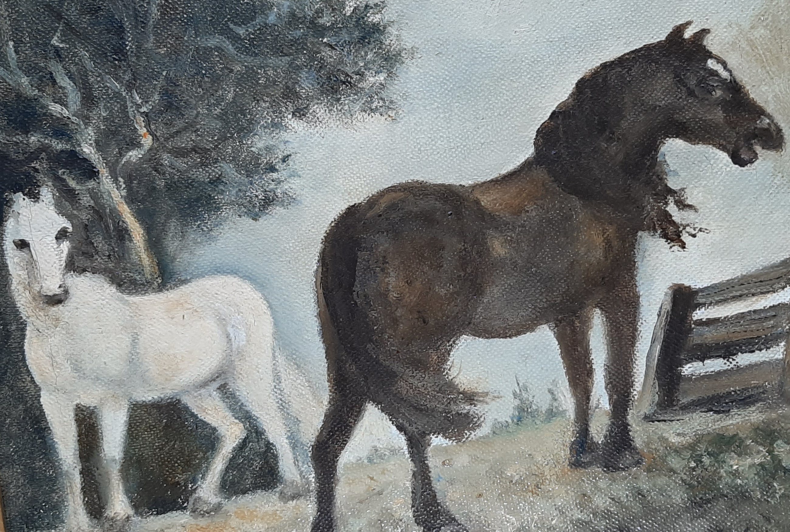 Hoff schilderde vooral Zuiderzeegezichten. Met deze mooie voorstelling van paarden op de dijk heeft hij voor een ander onderwerp gekozen. Naar het bekende werk van Paulus Potter: Twee paarden bij het hek.