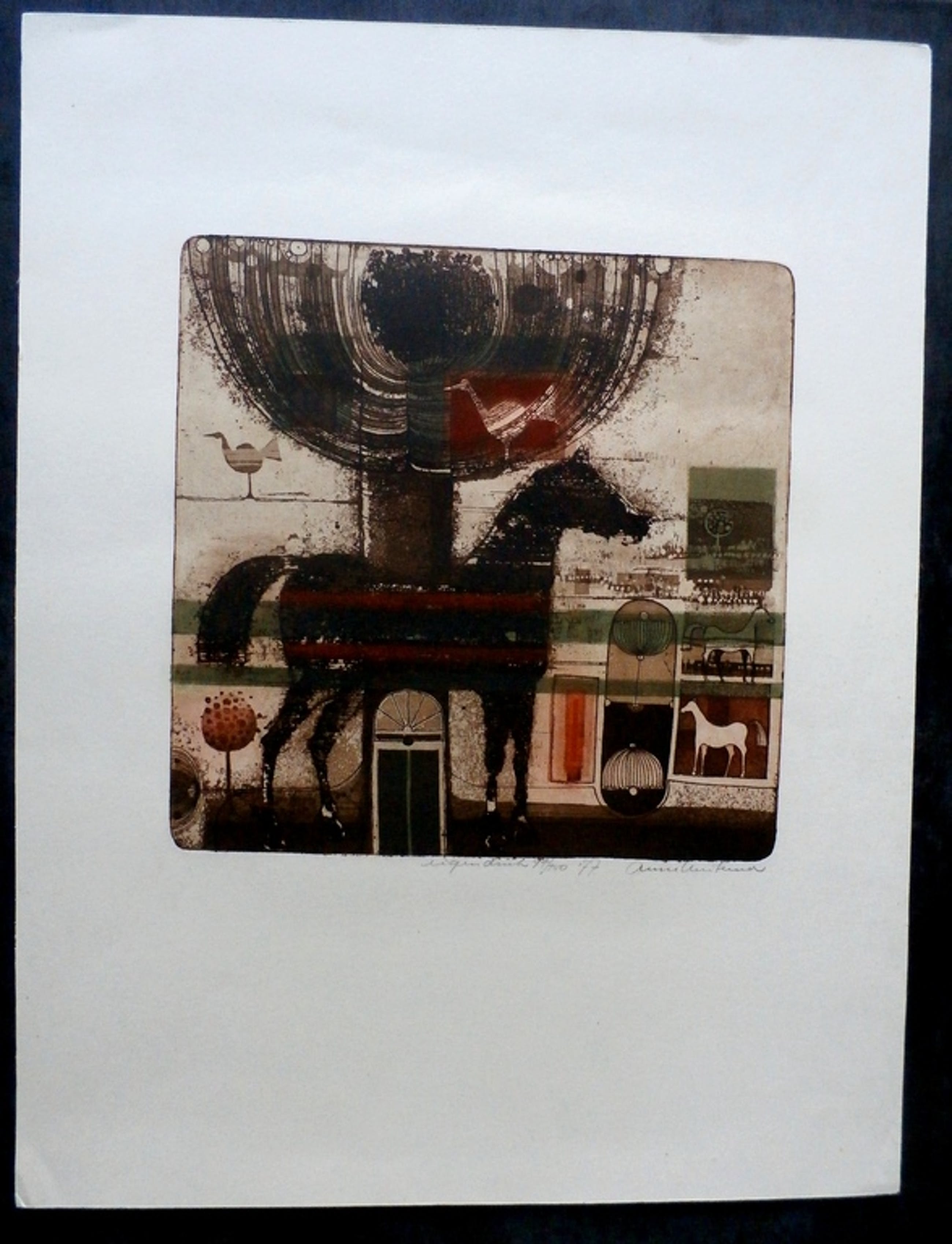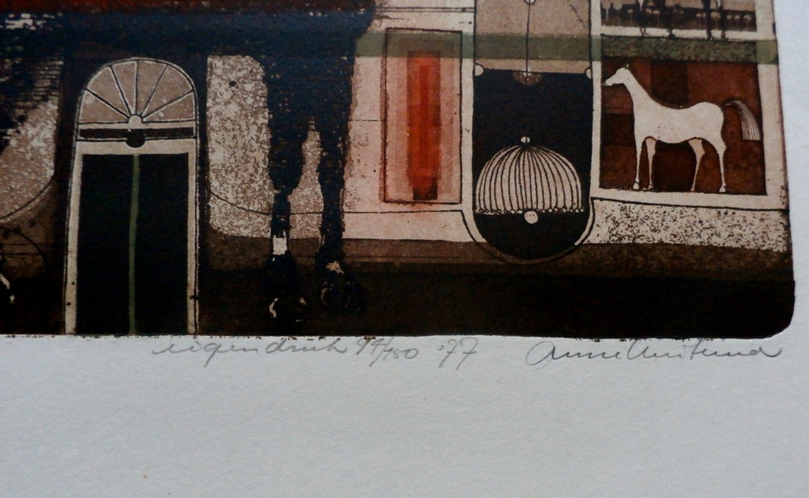 Ets van Anne Huitema. Jaar: 1977. Afmetingen blad: H46,5 x b36,5 cm; Afmetingen voorstelling: H24,5 x b24,5 cm; Gesigneerd, rechtsonder, door de kunstenaar met potlood. Nummer: 94/150.