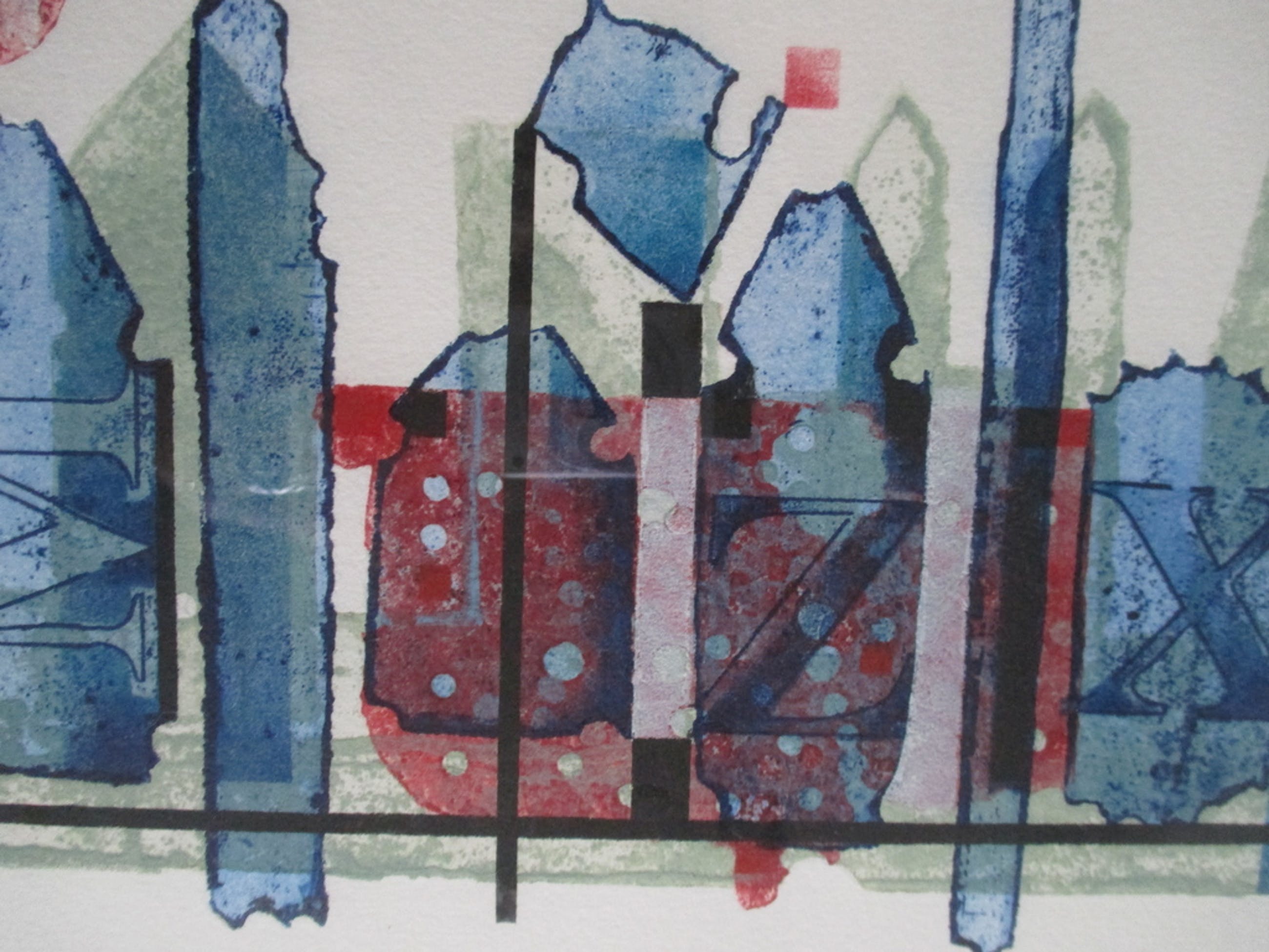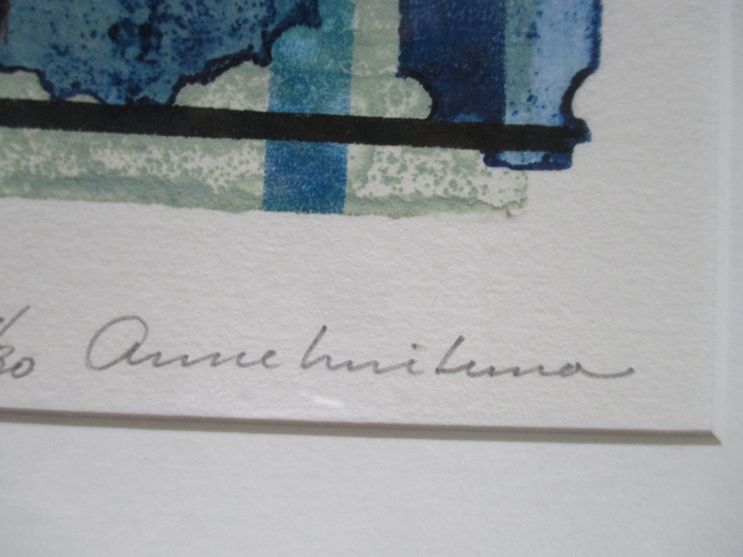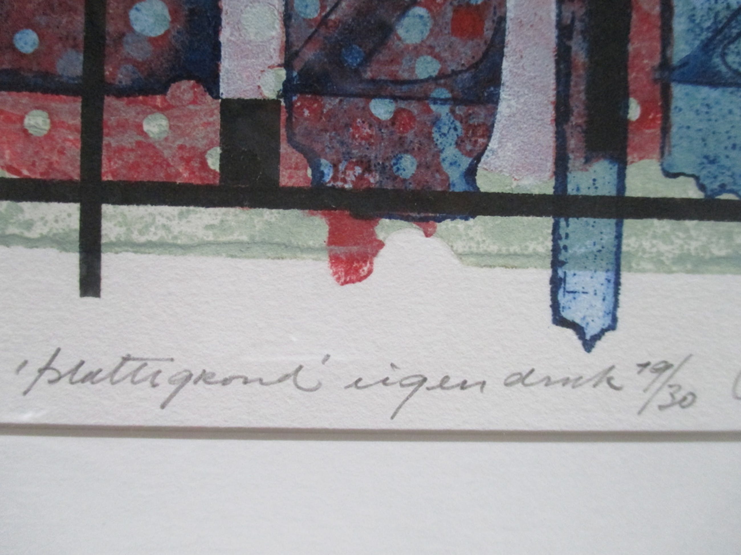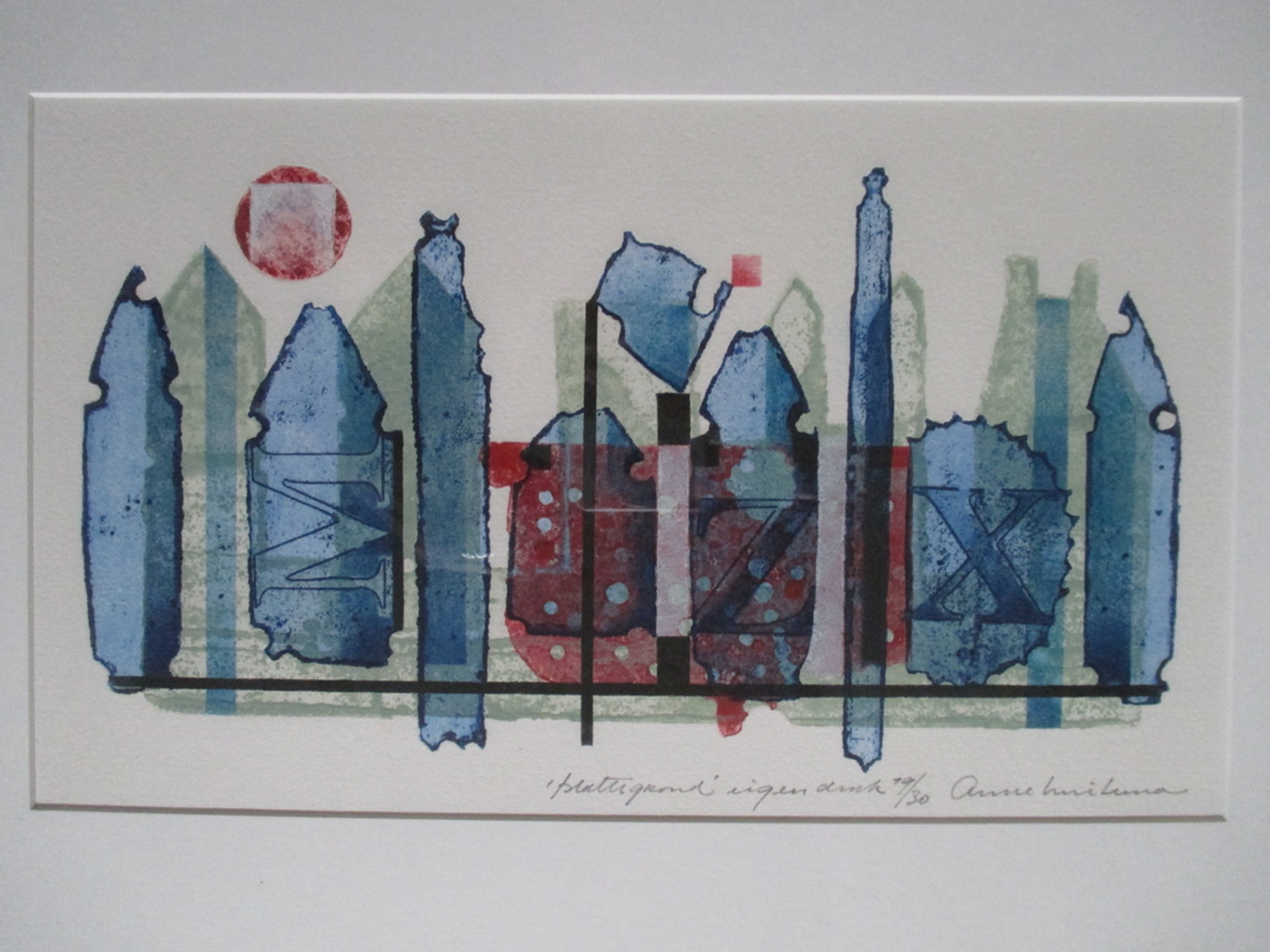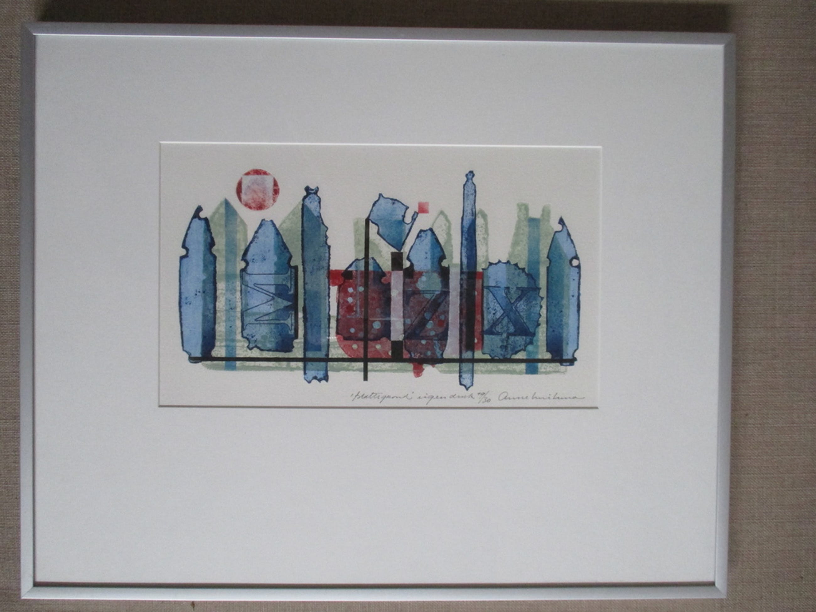 Kleurenets van Anne Huitema, genummerd 19/30, eigen druk, getiteld "Plattegrond", gesigneerd in potlood. Ingelijst achter glas, 51x41 cm, beeld 31x19 cm.