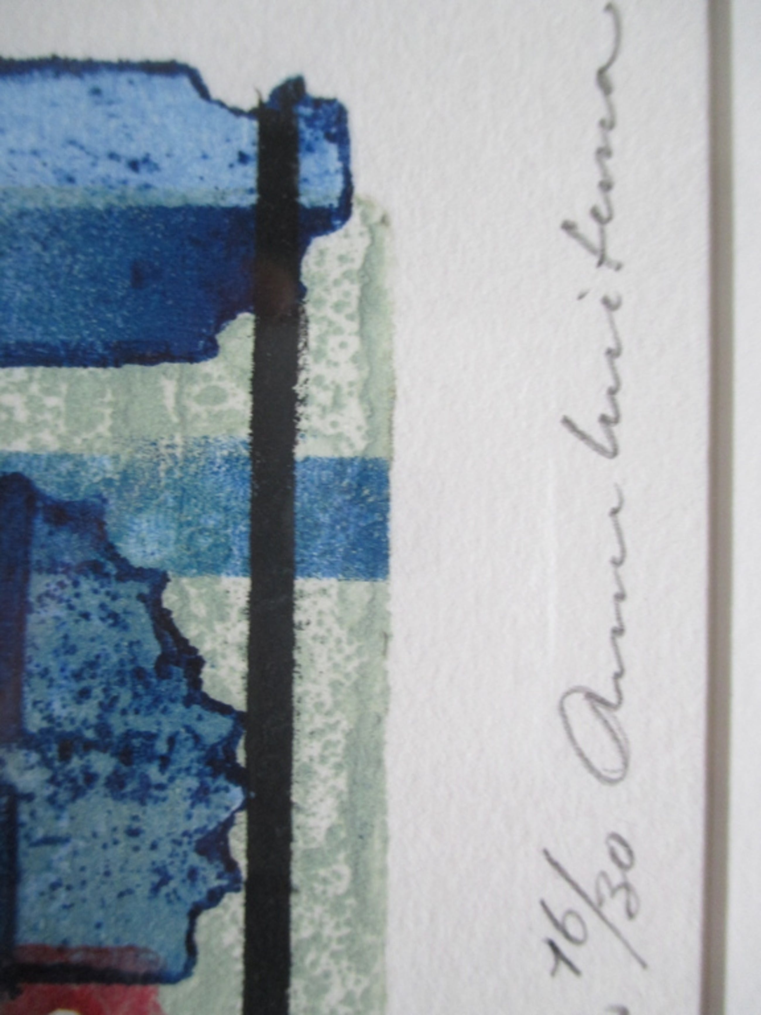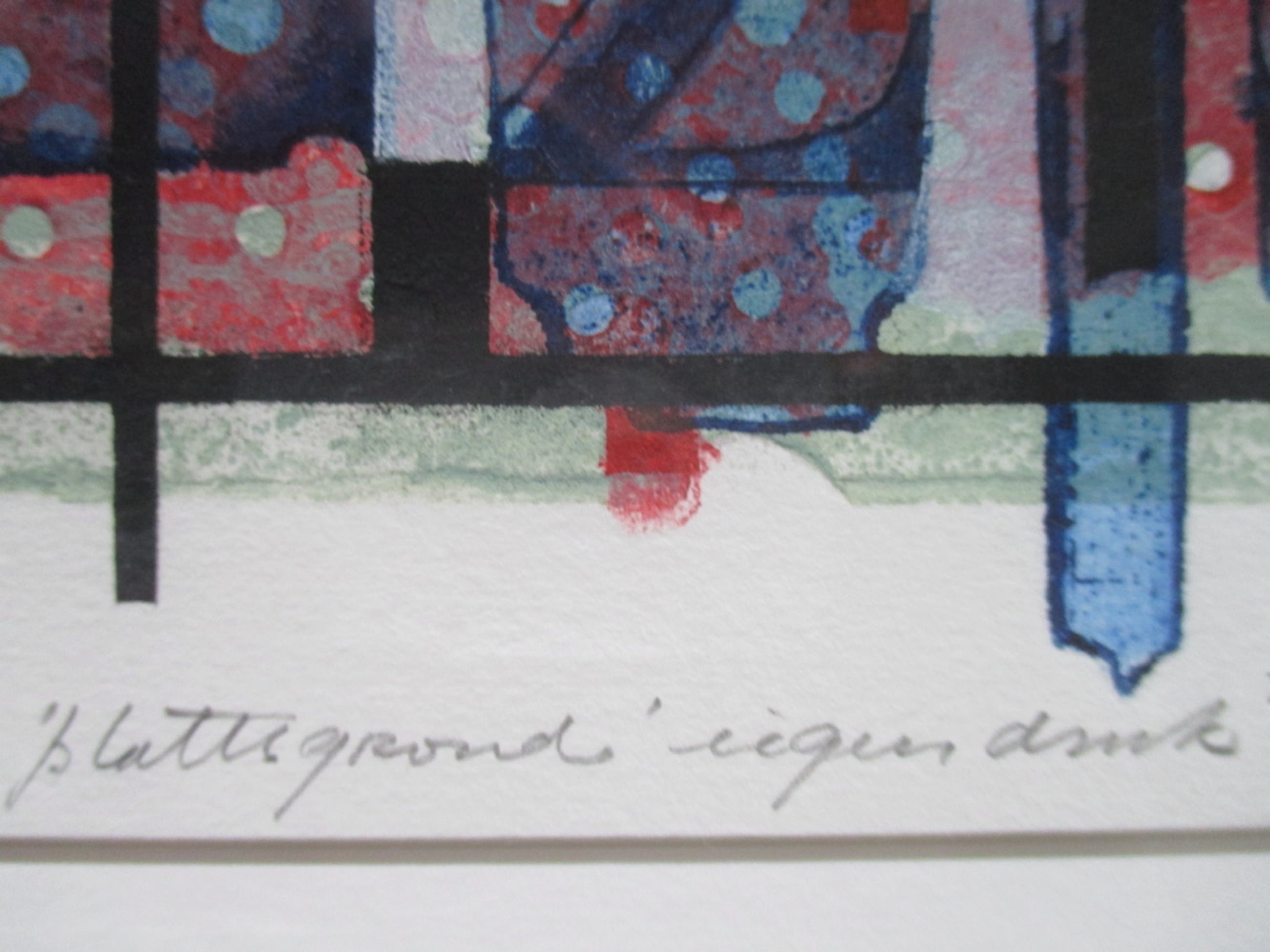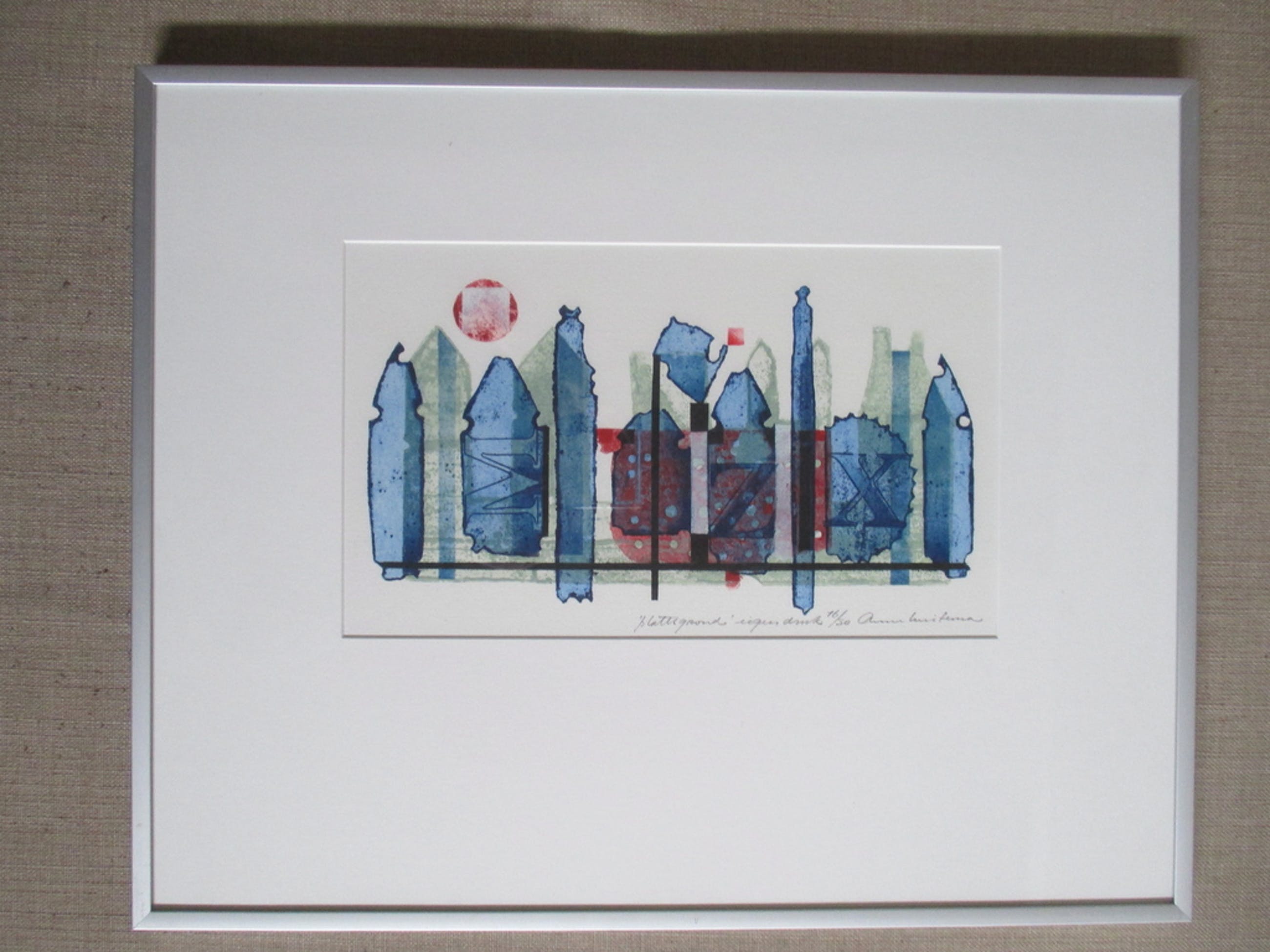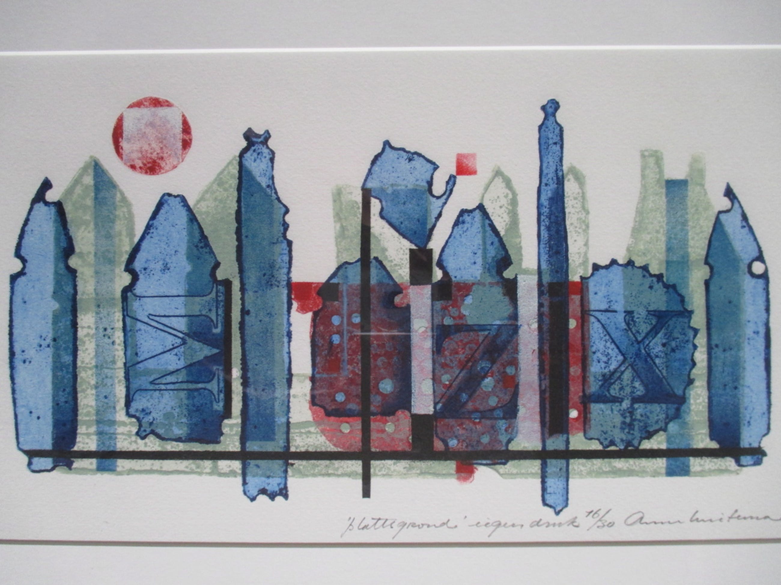 Kleurenets van Anne Huitema, genummerd 16/30, eigen druk, getiteld "Plattegrond", gesigneerd in potlood. Ingelijst achter glas, 51x41 cm, beeld 31x19 cm. In perfecte staat.