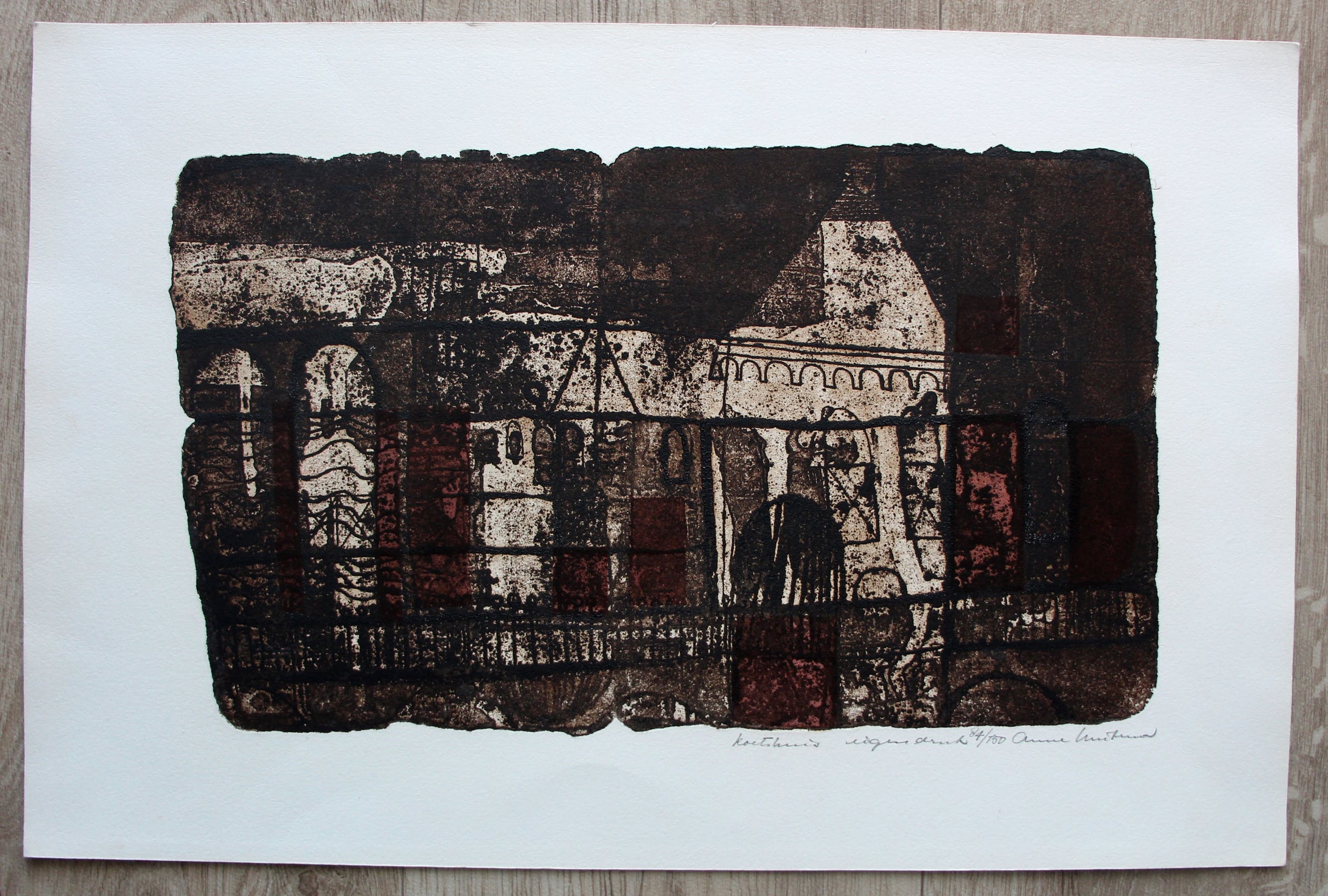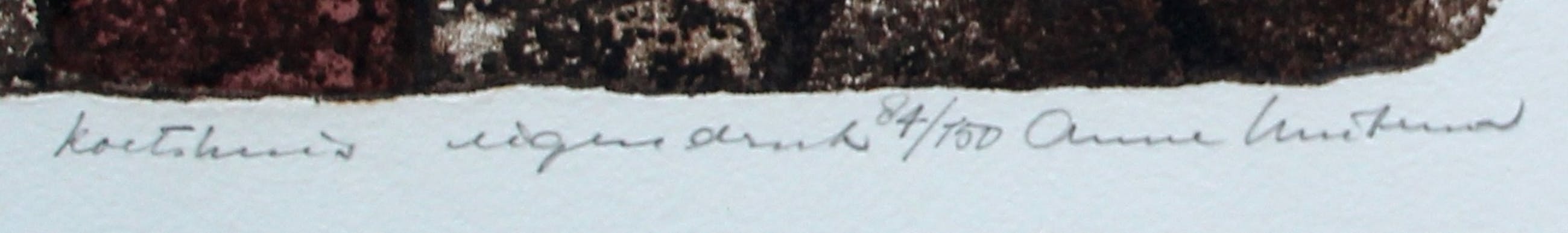 Kleuren ets van Anne Huitema. Titel: Koetshuis. Nummer: 84/150. Het werk is rechtsonder gesigneerd met potlood. Afmetingen blad: H32.5 x b49.5 cm. Afmetingen voorstelling: H22 x b36 cm. Het werk is rechtonderaan gesigneerd door de kunstenares. De authenticiteit van dit werk wordt volledig gegarandeerd. Een certificaat van echtheid kan, op verzoek, worden gemaild.