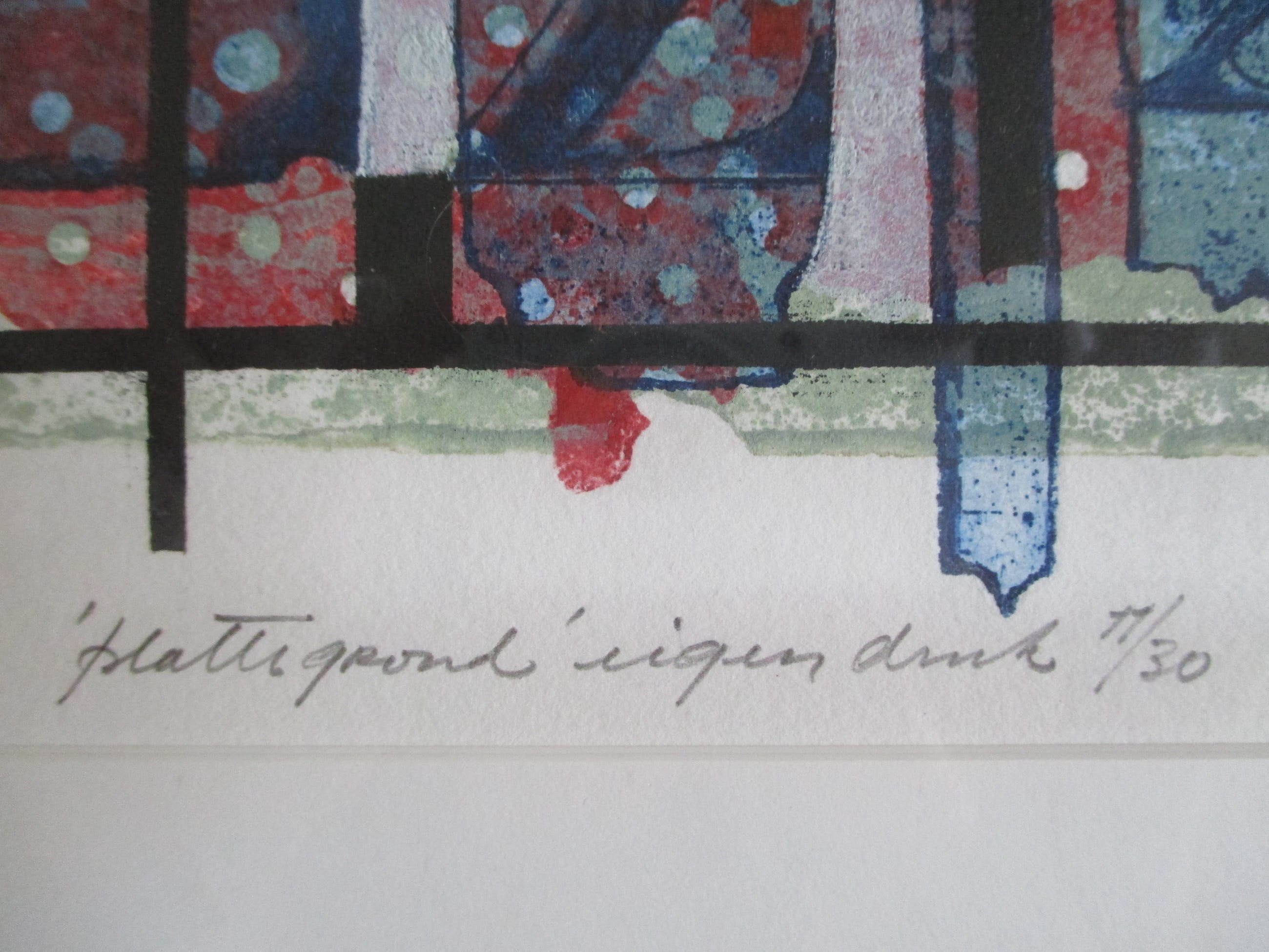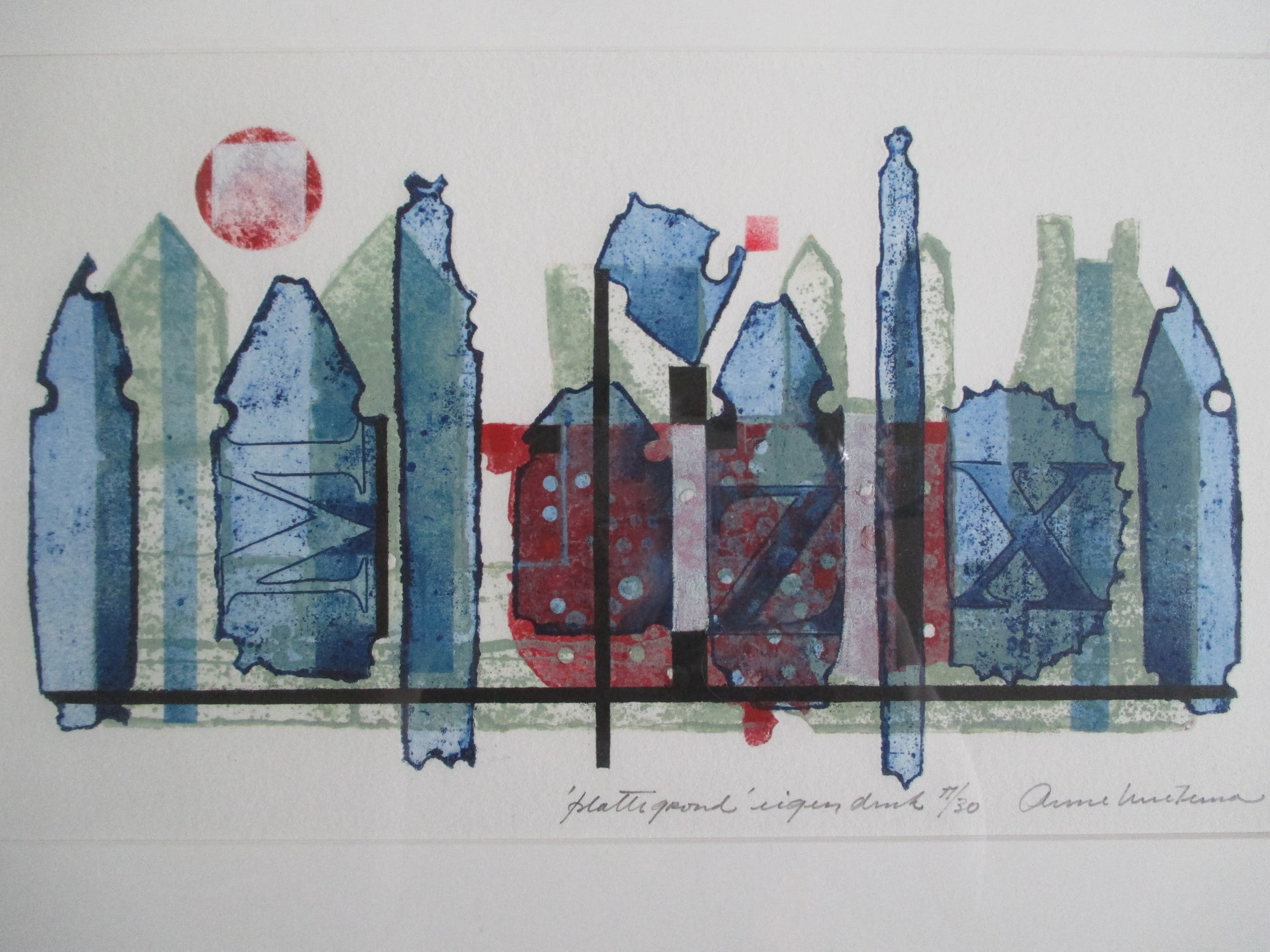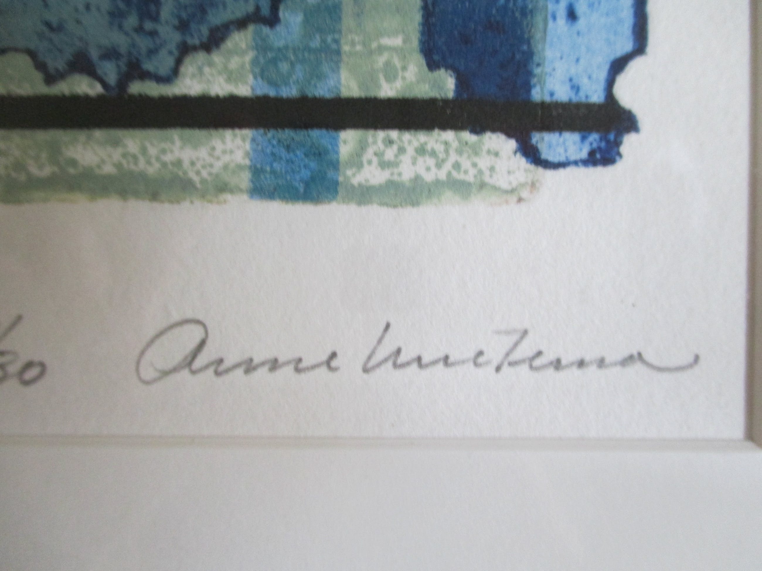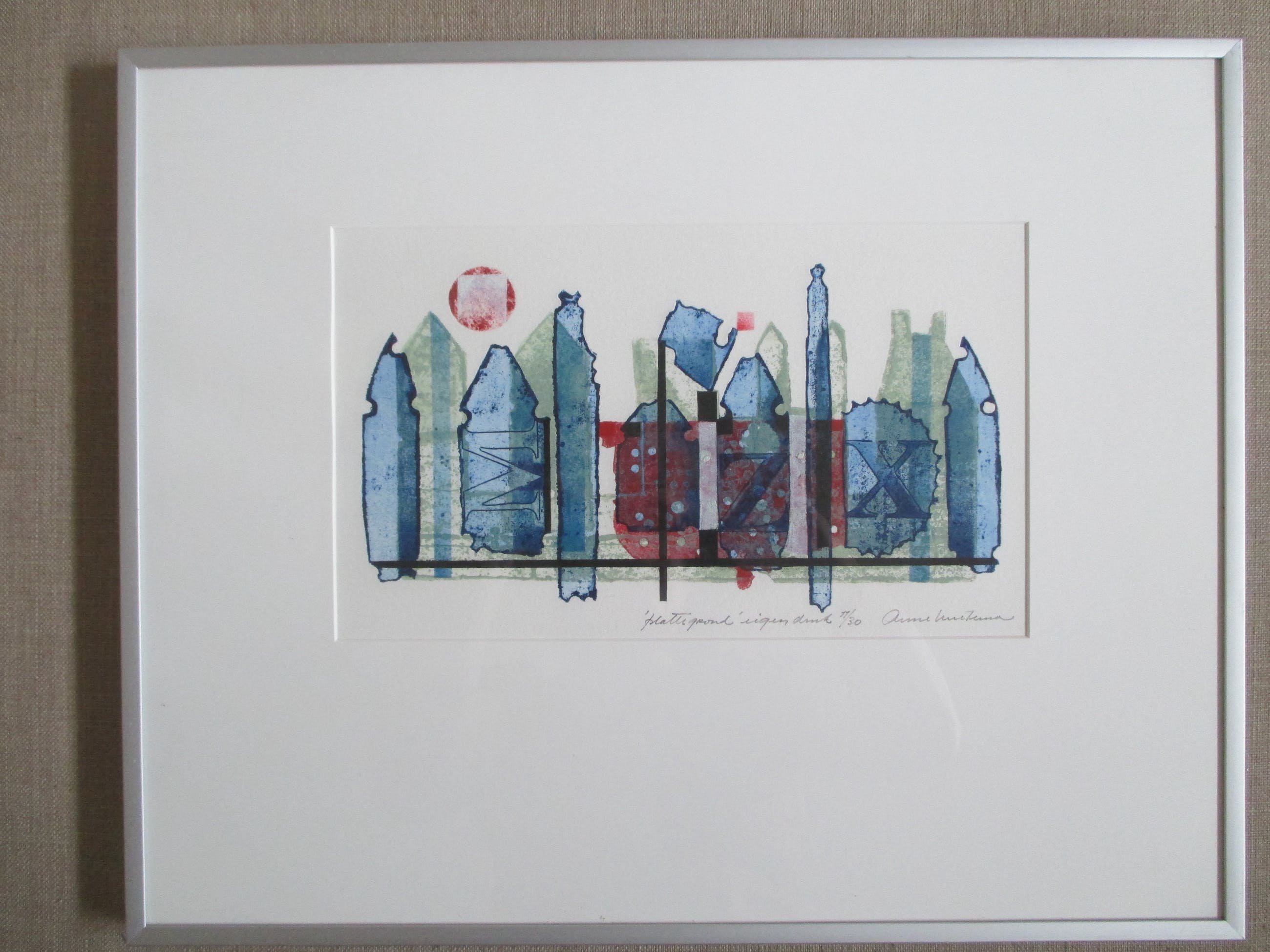 Kleurenets van Anne Huitema, gesigneer, getiteld en genummerd in potlood. Ingelijst met passe-partout in aluminiumlijst. Verzending 8 euro, aangetekend 9,65