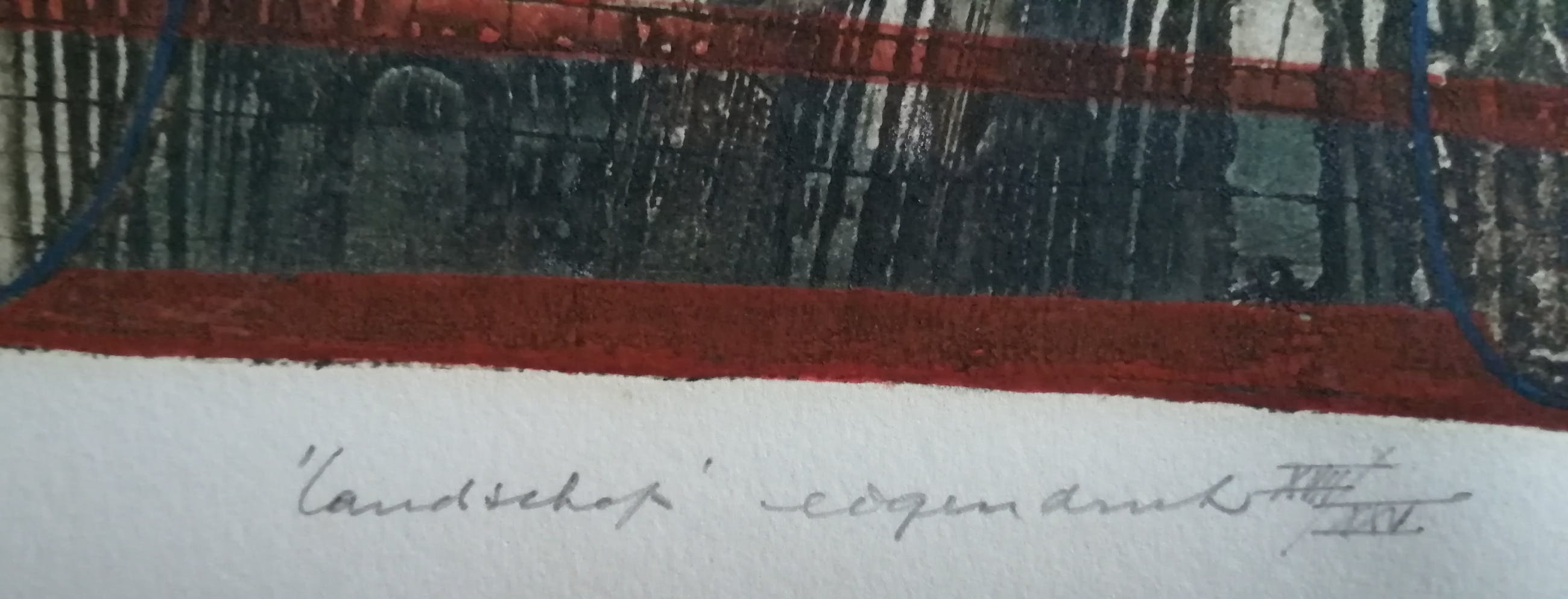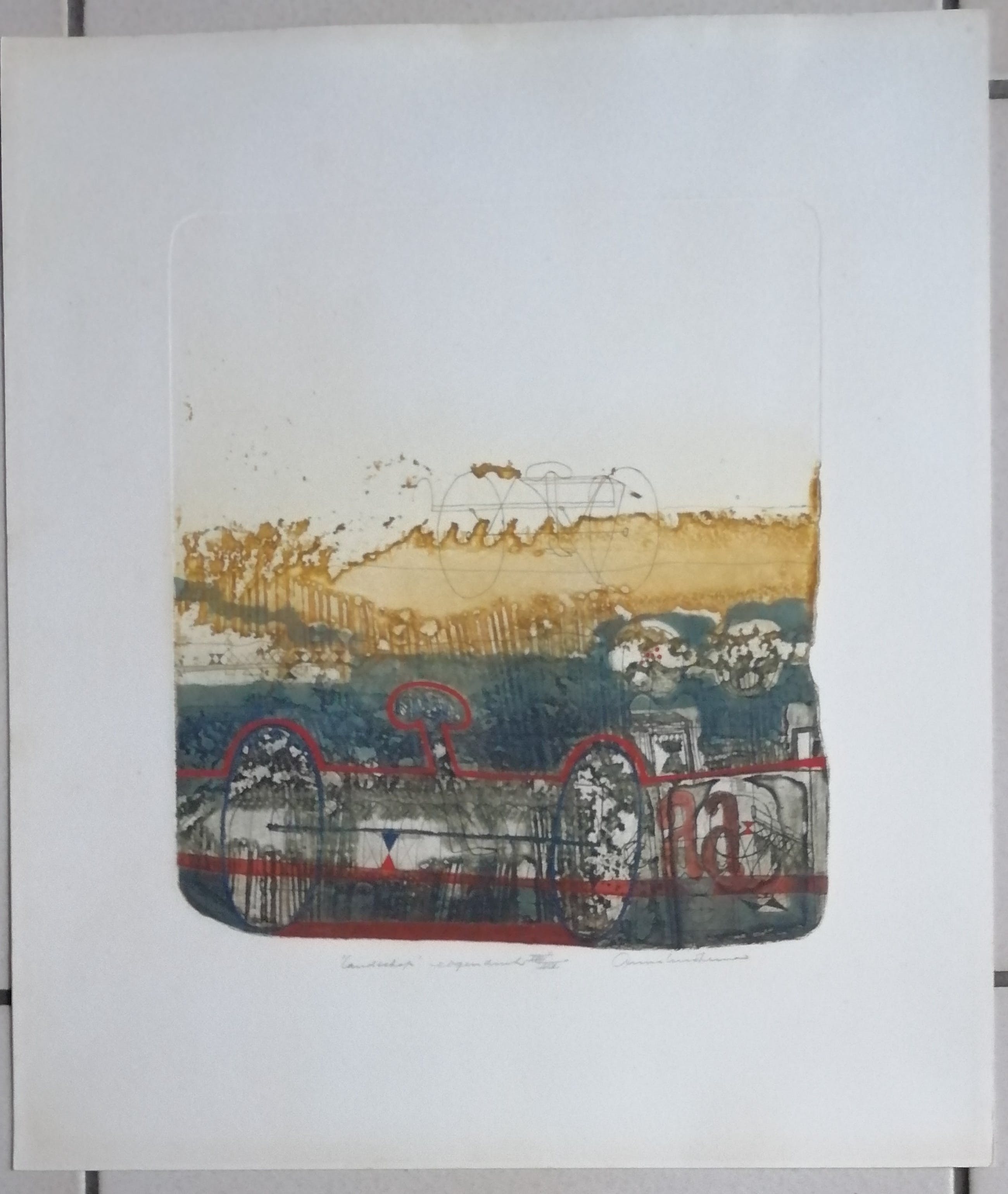 Ets in kleuren. Potlood gesigneerd rechtsonder. Getiteld, "eigen druk" en genummerd XVII/XV linksonder. Beeldmaat 28x25 cm. Bladmaat 44x38 cm. Losbladig. Anne Huitema werd geboren te Lange Zwaag op 9 augustus 1941. Opgeleid aan de Academie Minerva te Groningen. Lid van de Boan fan Fryske Kunstners.