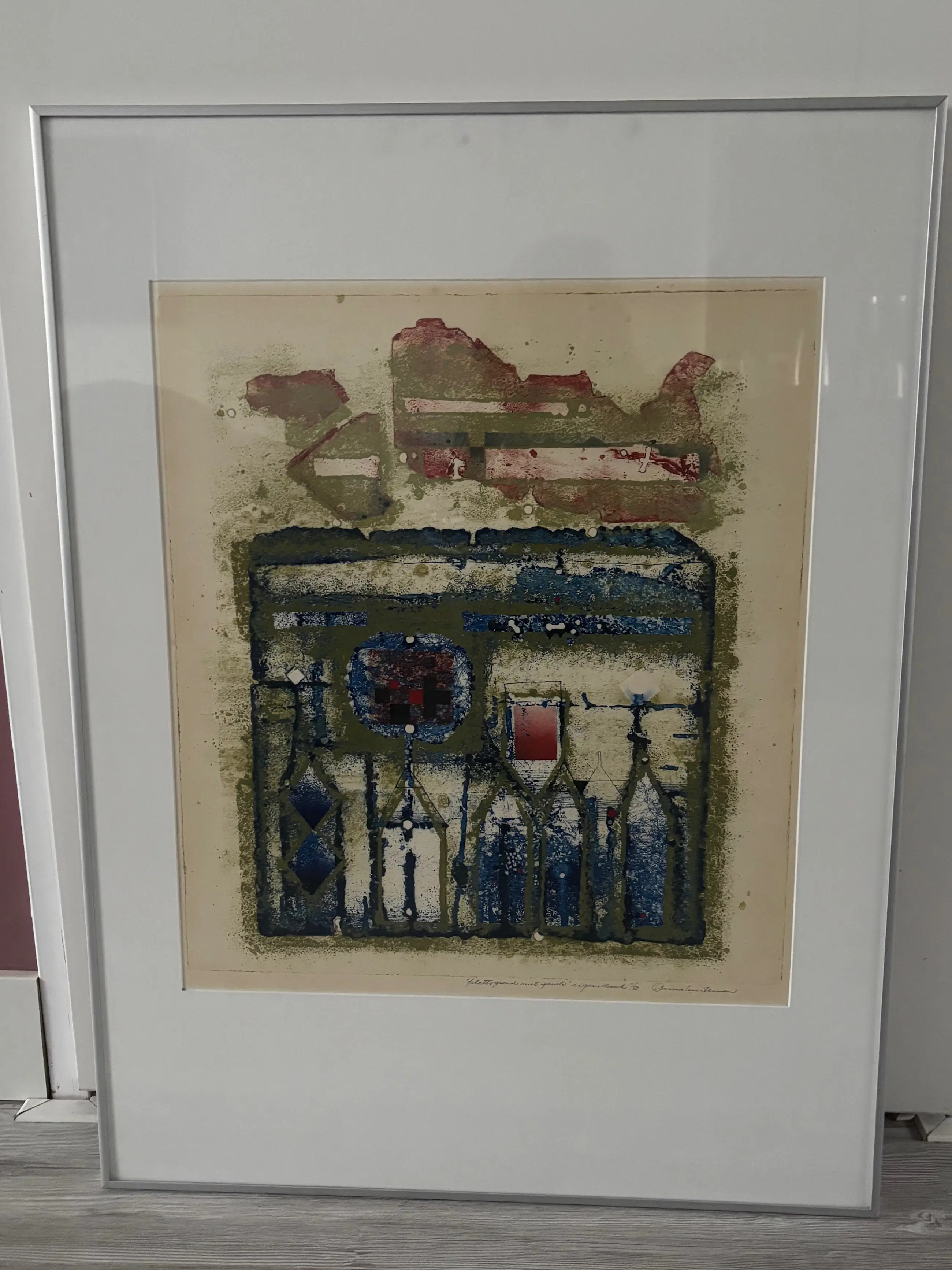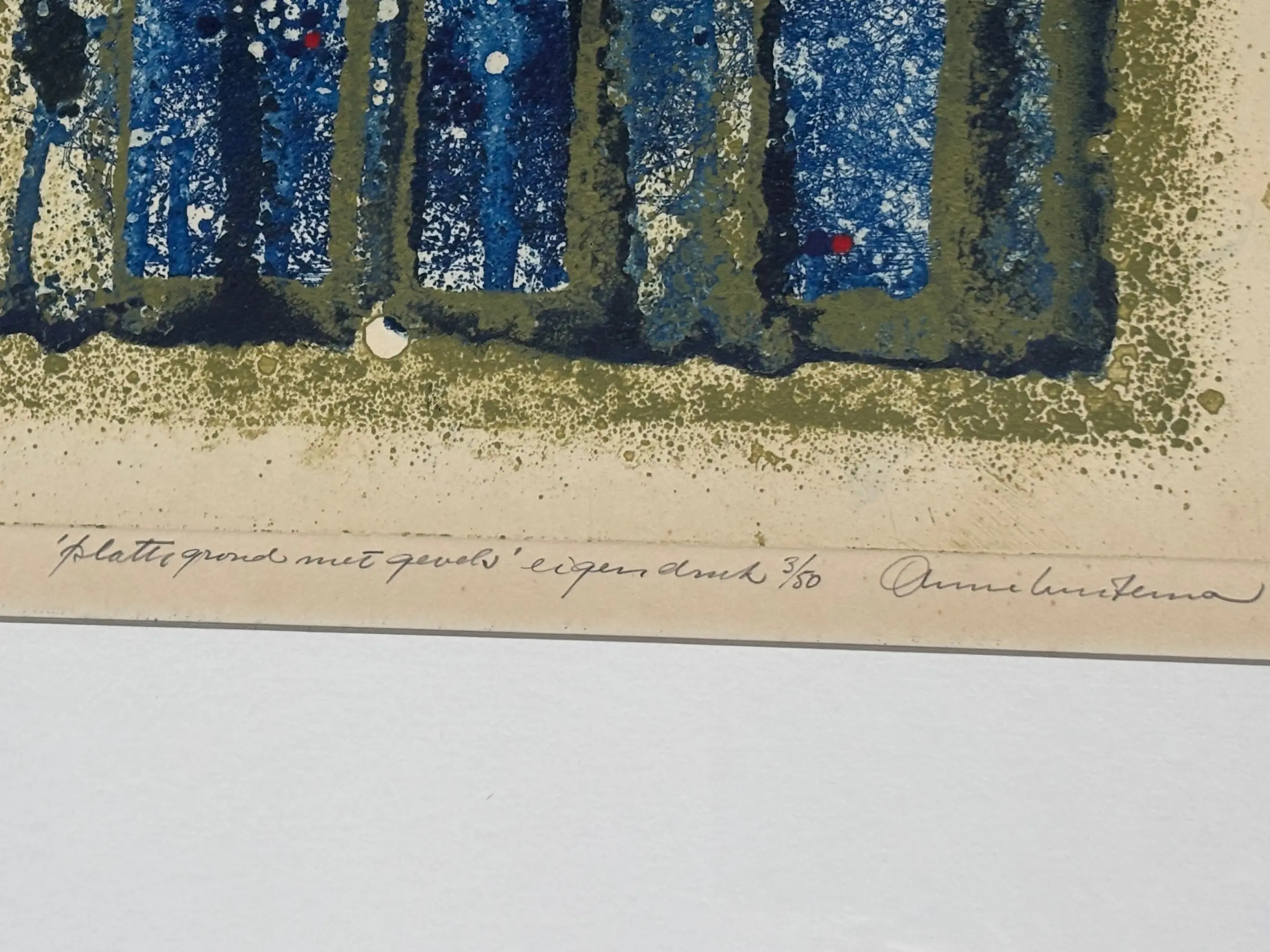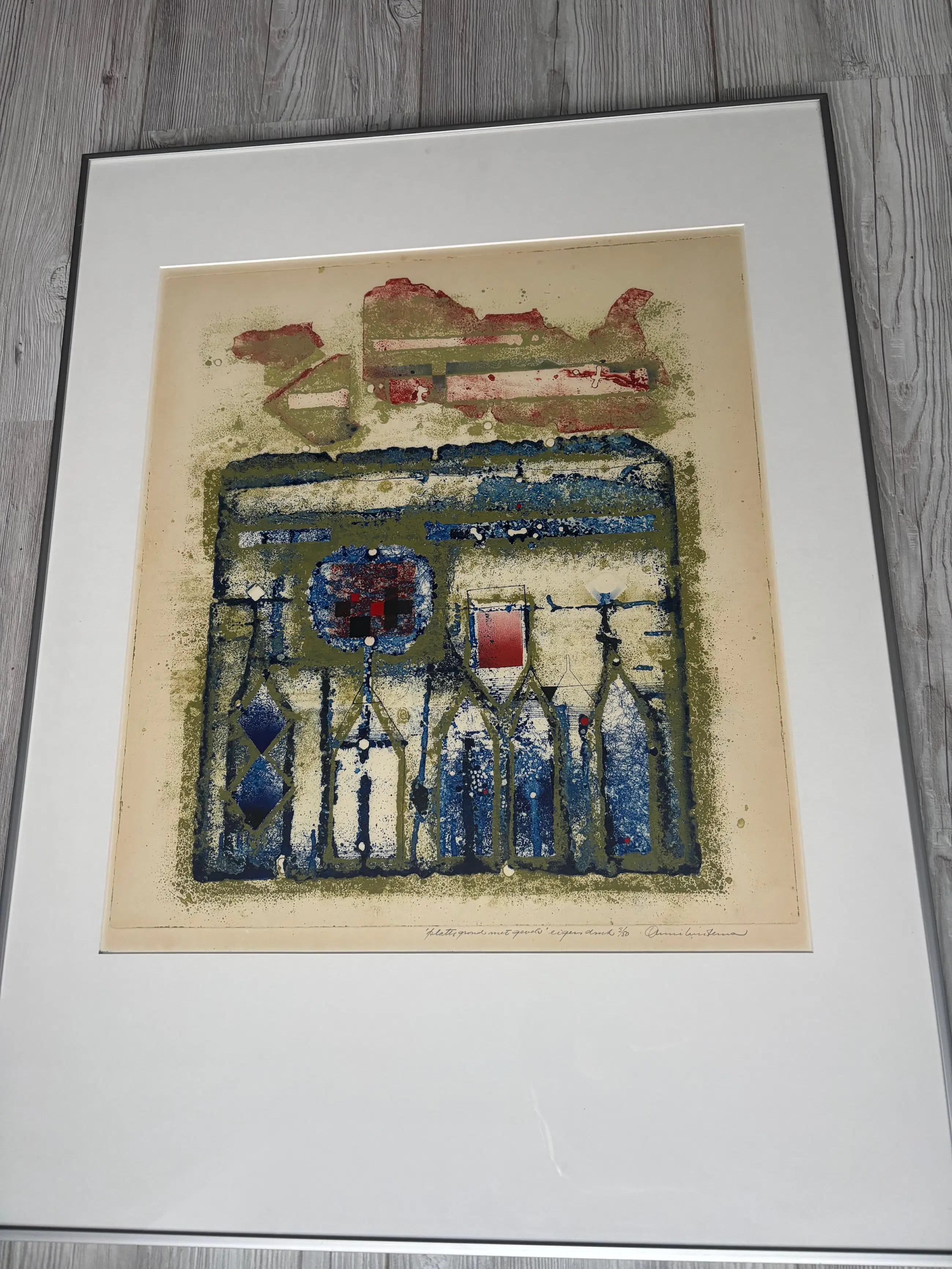 Mooi kleurrijke ets, potlood gesigneerd (3/50), getiteld (plattegrond met gevels). Is ingelijst in een zilverkleurige lijst.