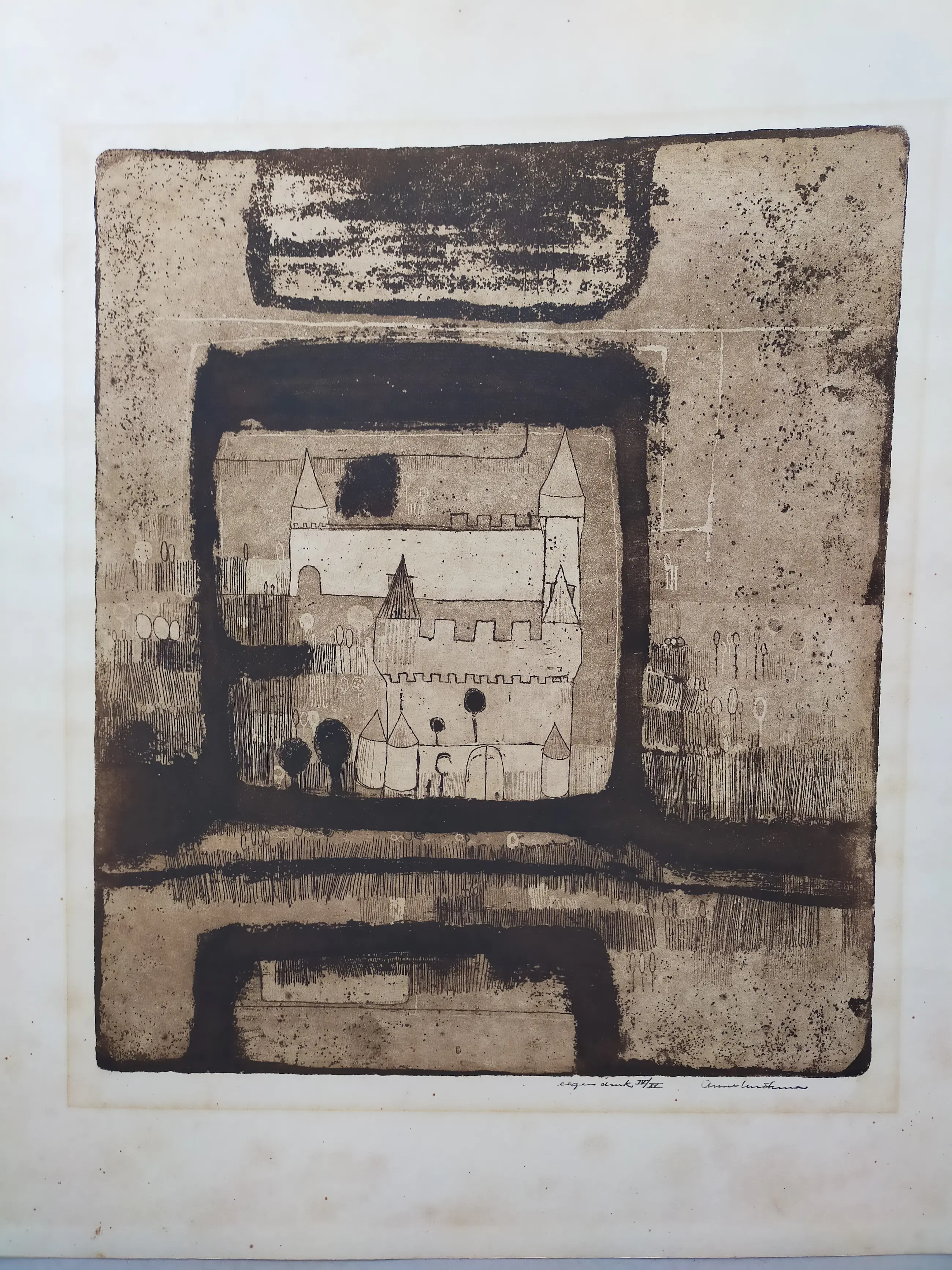 Waarschijnlijk een vroege ets. Papier heeft lichte verkleuring. Is ingelijst geweest' De ets is plus minus 30-30 cm