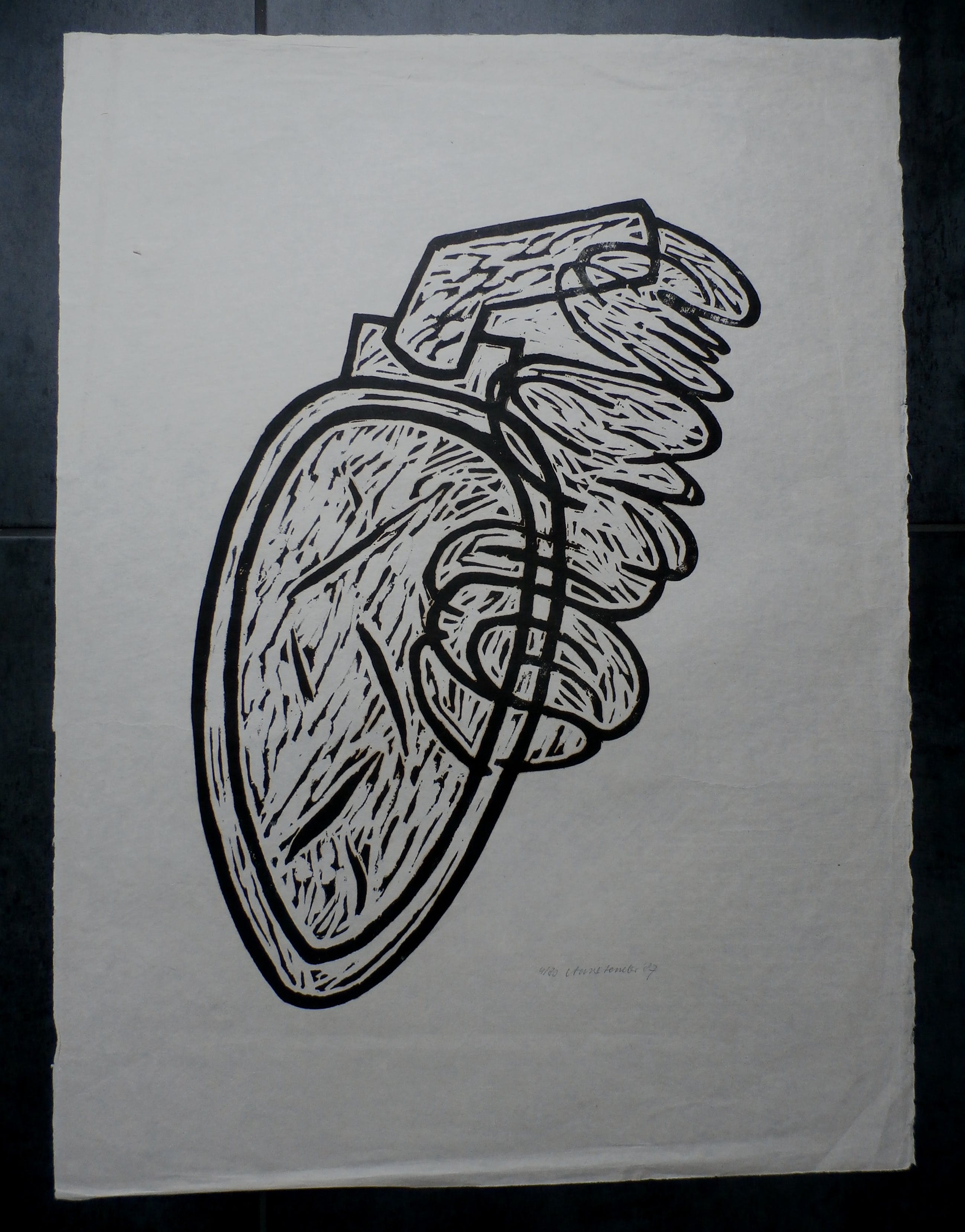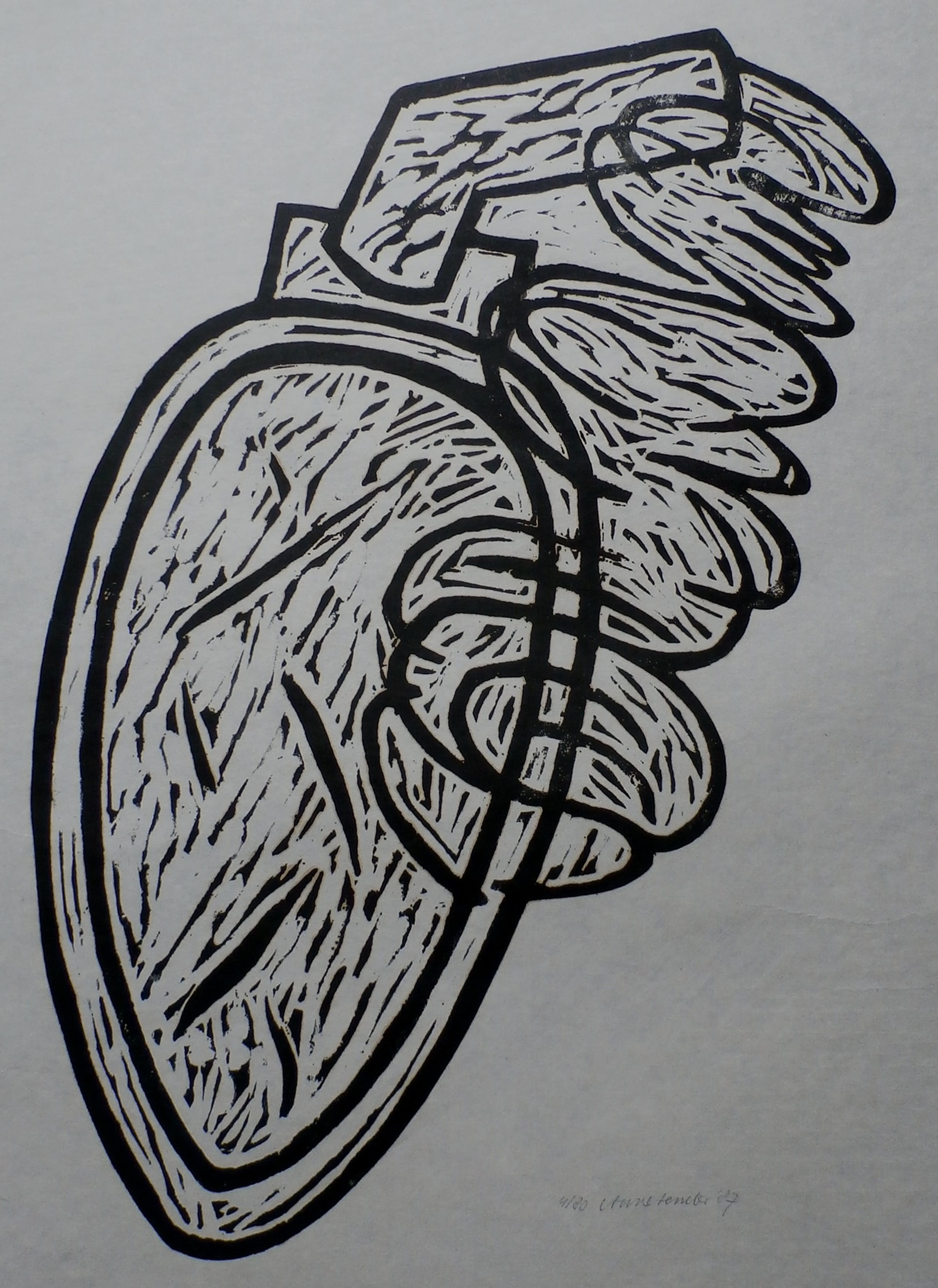 Linosnede van Anne Semler uit 1987. Nummer 4/80. Afmetingen blad: H80 x b60 cm. Afmetingen voorstelling: H60 x b40. Het werk is rechtsonder gesigneerd door de kunstenaar.