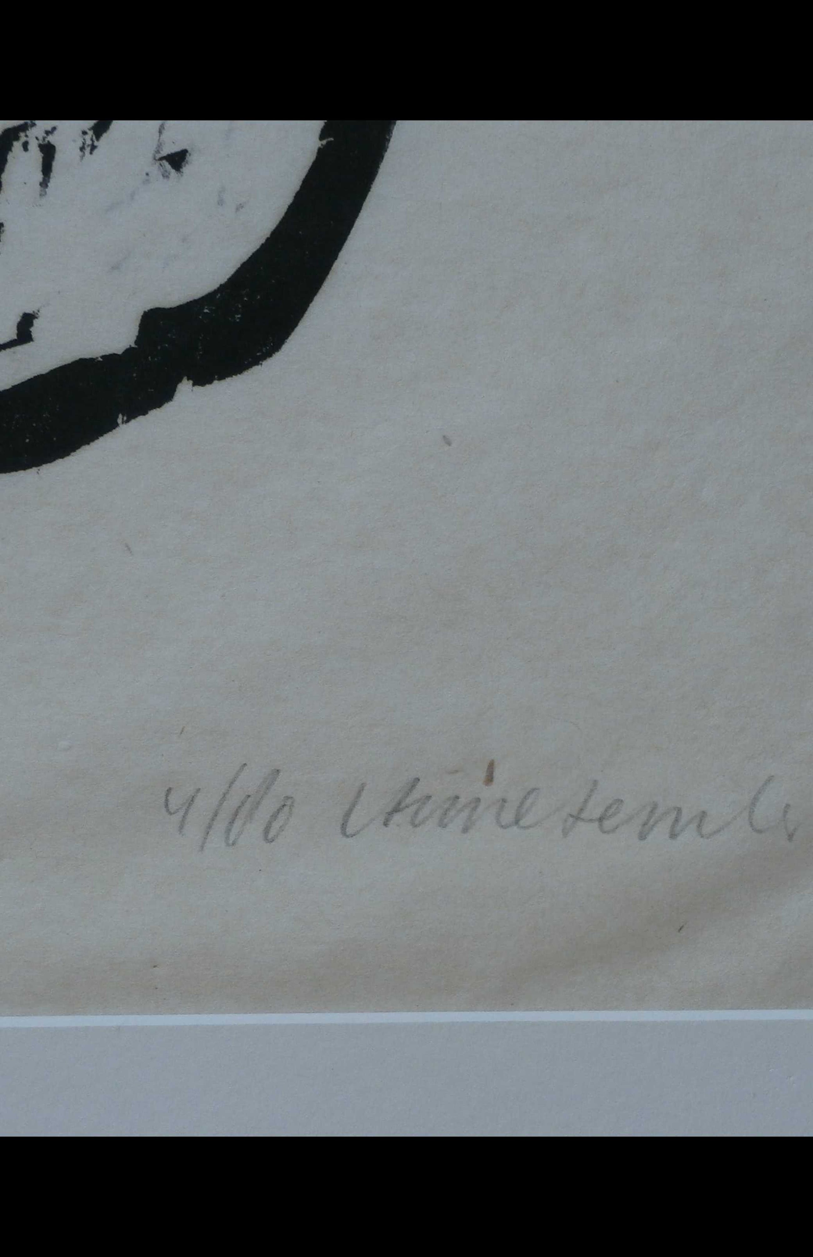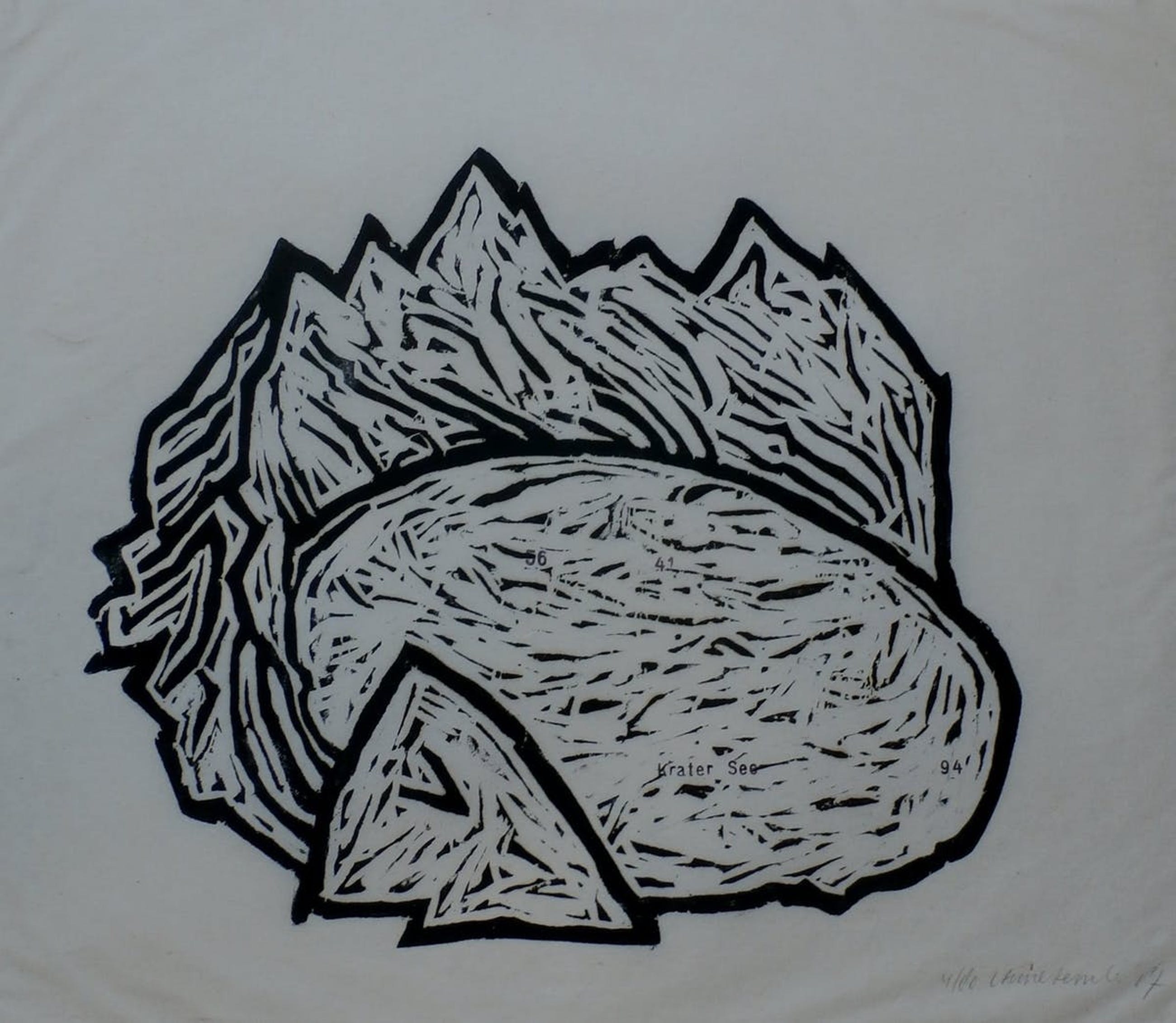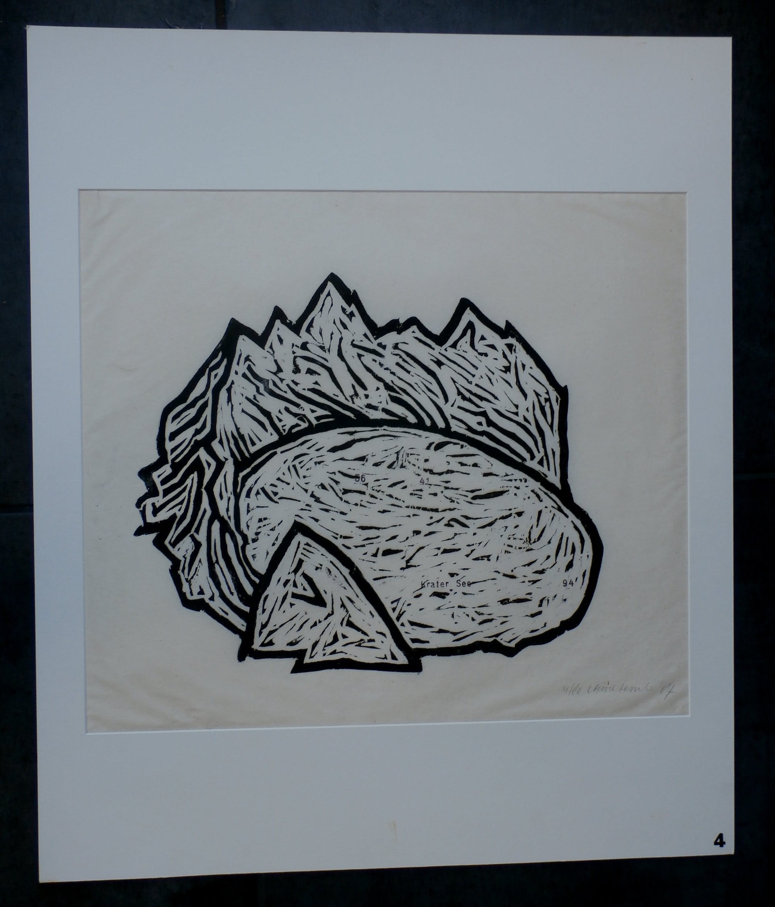 Linosnede op rijstpapier van Anne Semler. Titel: Kratersee. Nummer 4/80. Afmetingen blad incl passepaprtout: H71 x b59.5 cm. Afmetingen voorstelling: H45 x b51.5. Het werk is rechtsonder gesigneerd door de kunstenaar. De authenticiteit van het aangeboden werk wordt volledig gegarandeerd. Een certificaat van echtheid kan, op aanvraag, worden gegarandeerd.