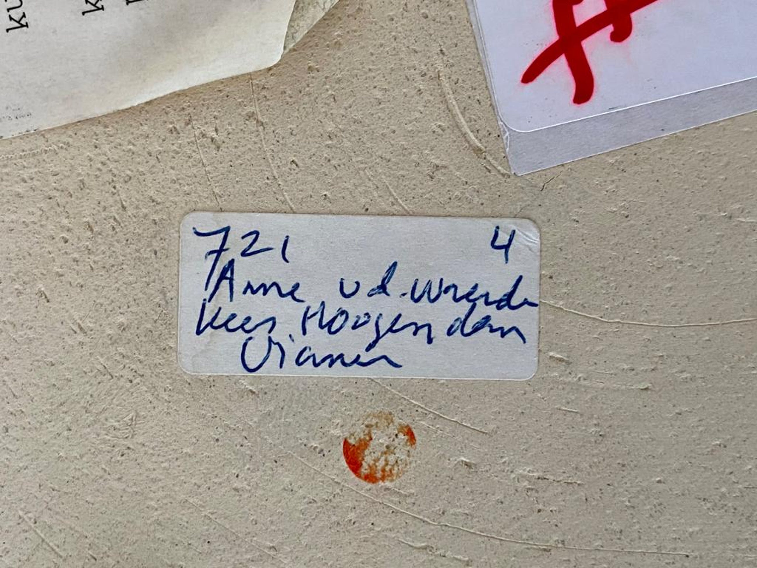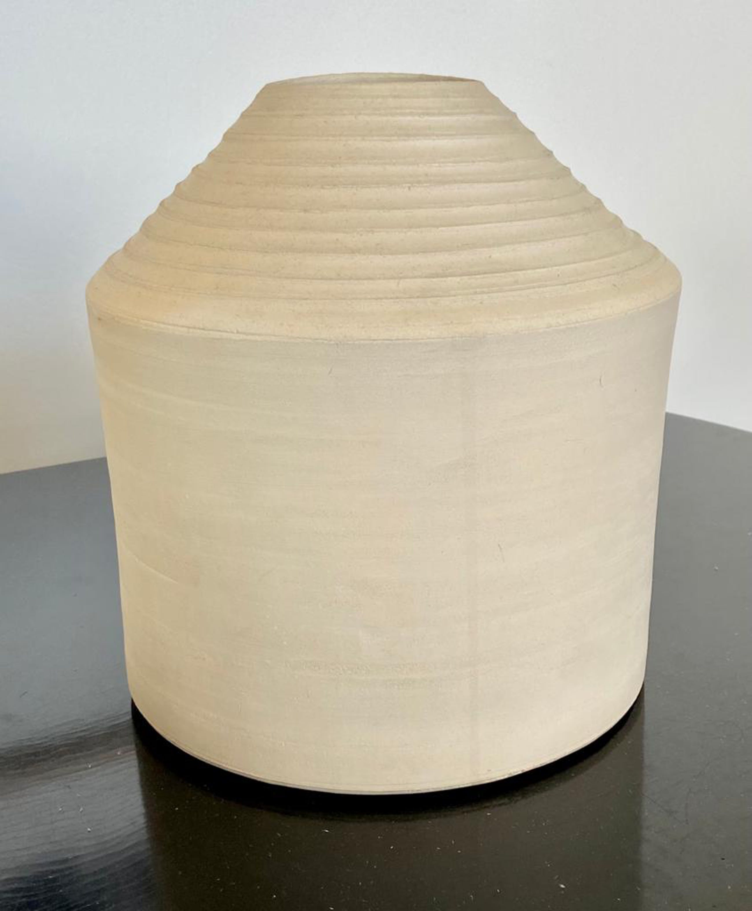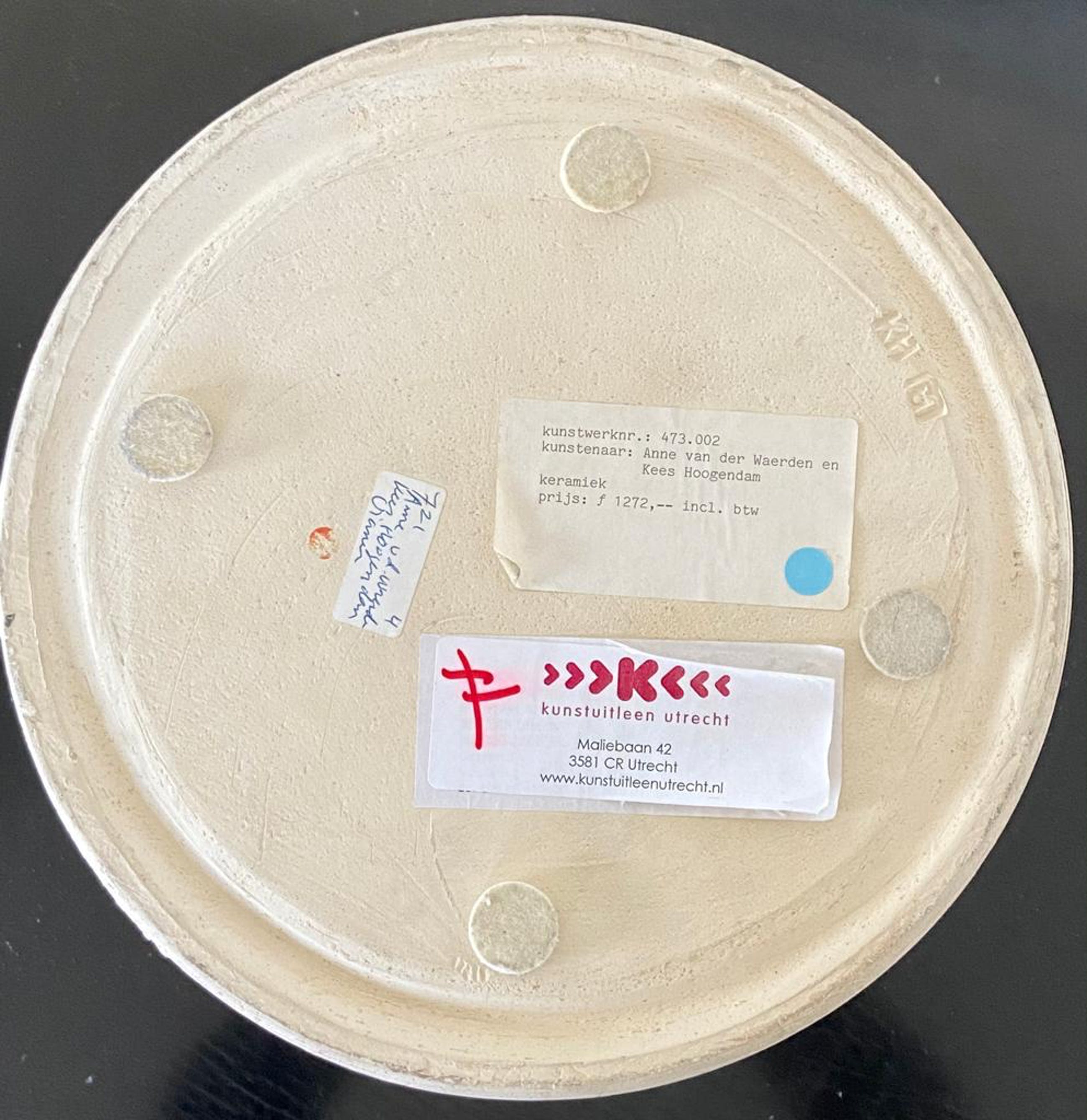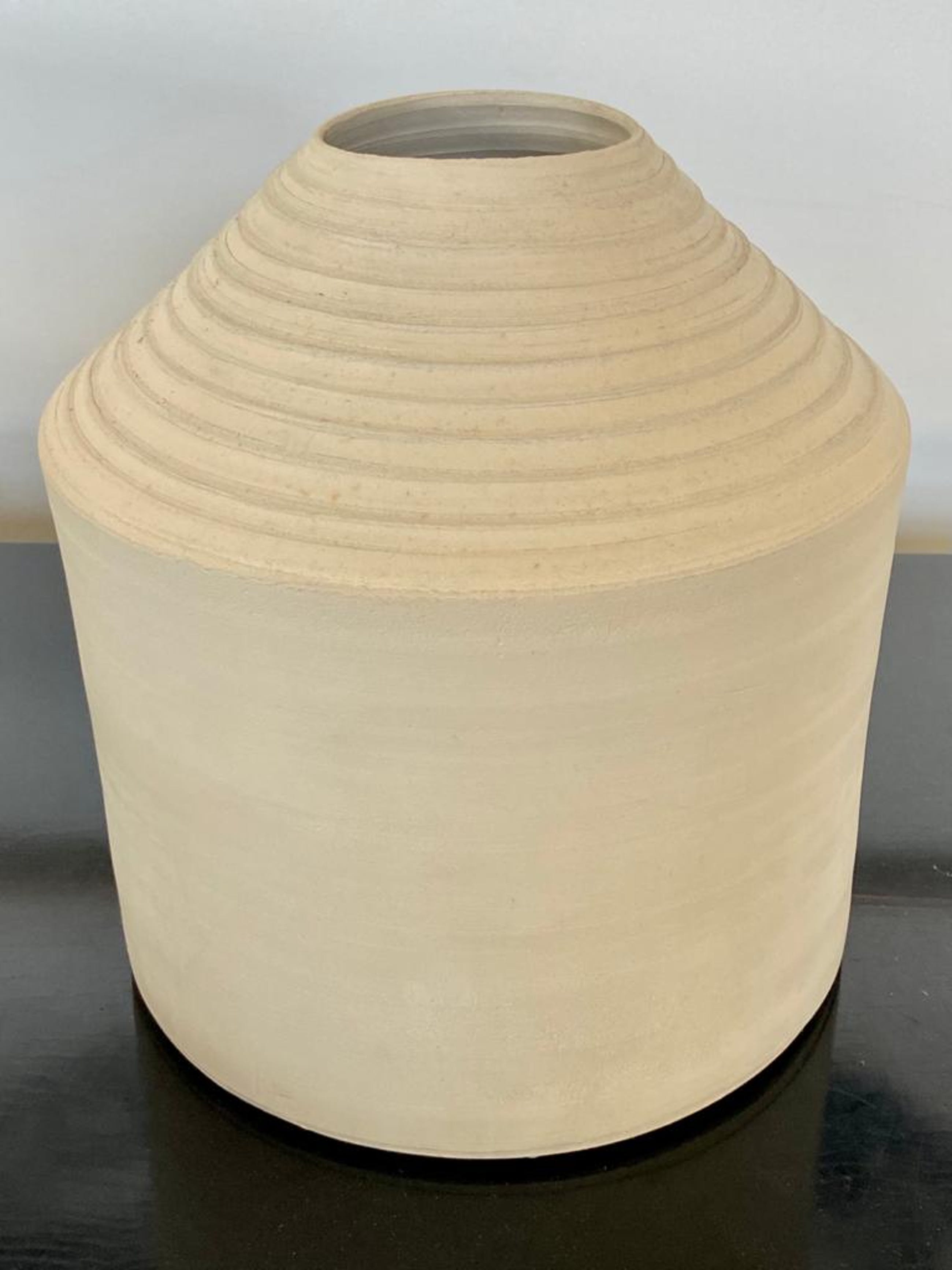Een grote crèmekleurige vaasvorm van Anne van der Waerden. Rond 1986 gemaakt in samenwerking met de keramist Kees Hoogendam. Werk is tentoongesteld in het Schiedams Museum. Aangekocht door de Utrechtse Kunstuitleen. Mooi monumentaal object voortgekomen uit deze bijzondere samenwerking. werk van Anne van der Waerden bevindt zich o.a in Stedelijk Museum Amsterdam, Boijmans van Beuningen Rotterdam, CODA Apeldoorn, Kunstmuseum Den Haag en museum Het Princessehof Leeuwarden. De vaas is gemerkt met het monogram van Anne van der Waerden en Kees Hoogendam.