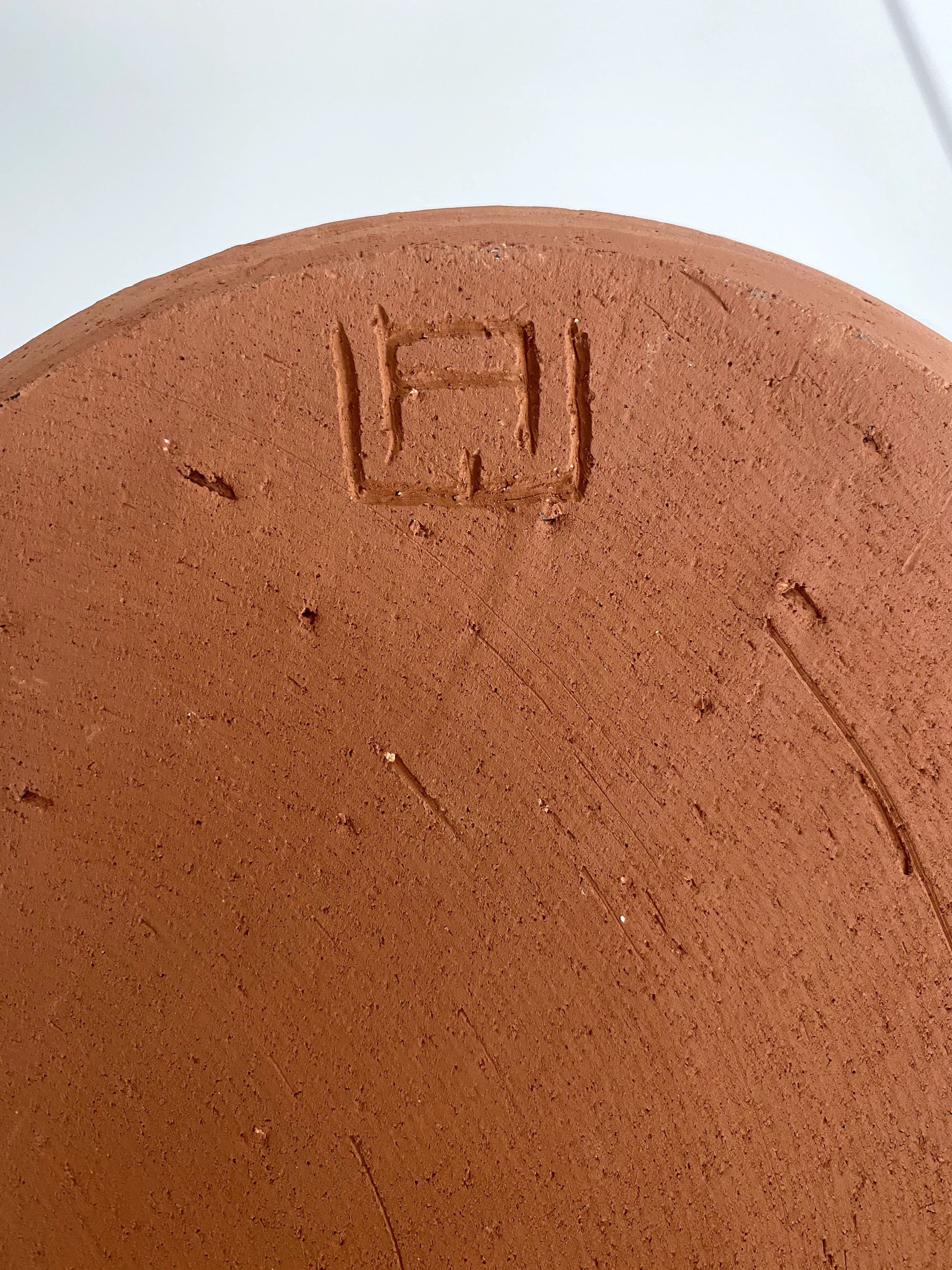 Een flinke terracotta potvorm met prachtige hals en verdiepte halsmond. Ontworpen en uitgevoerd door Anne van der Waerden in haar eigen atelier. gemerkt met monogram.