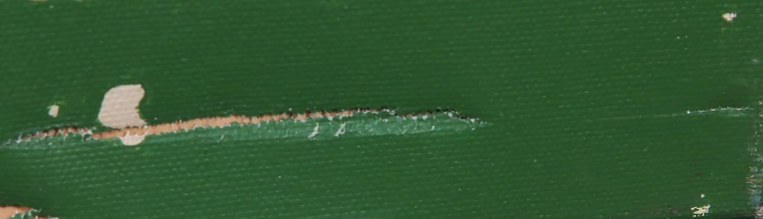 Het werk is met name aan de randen van het canvas beschadigd. Aan de onderzijde rechts van het midden zitten twee scheuren in het doek. (zie detailfoto's) | |