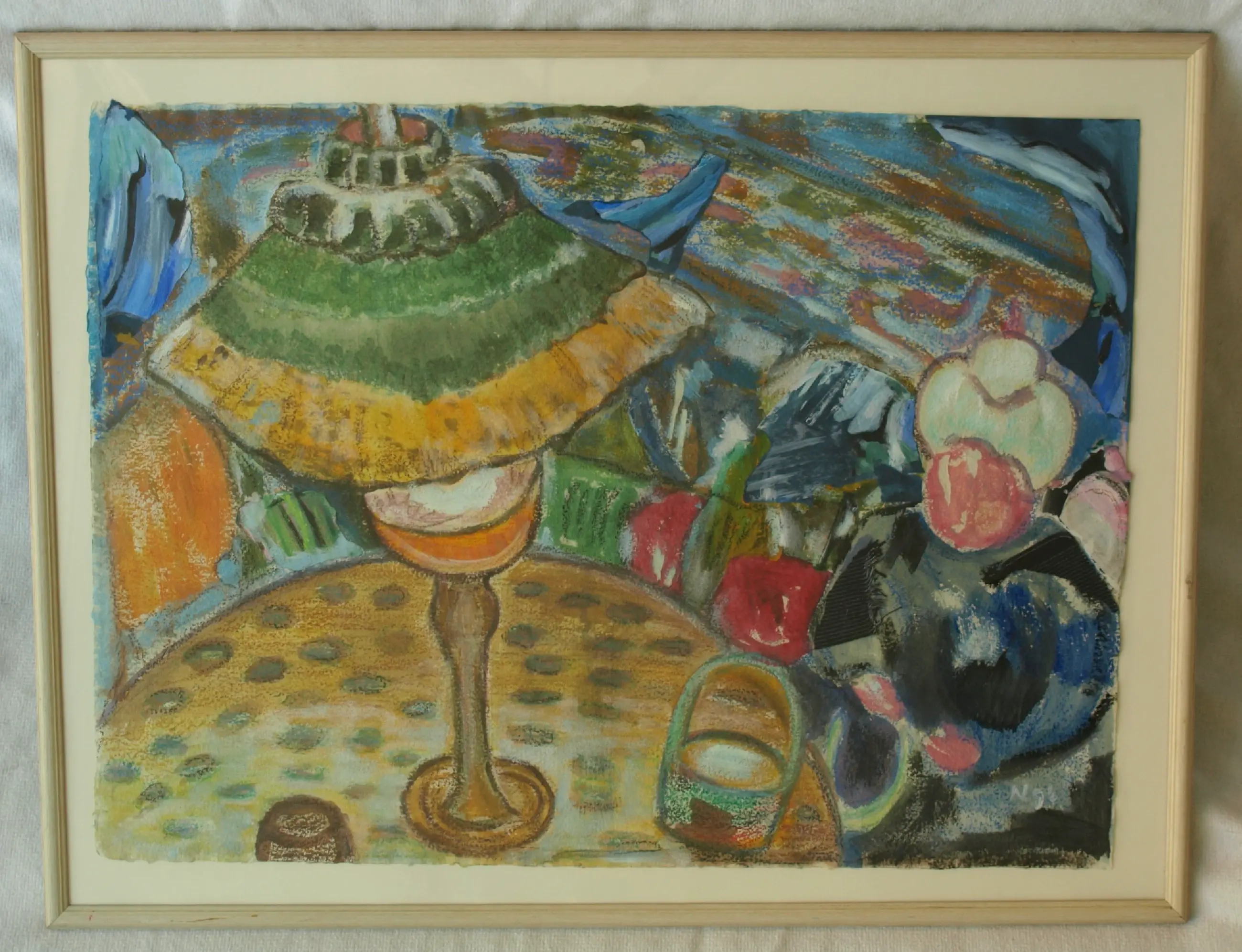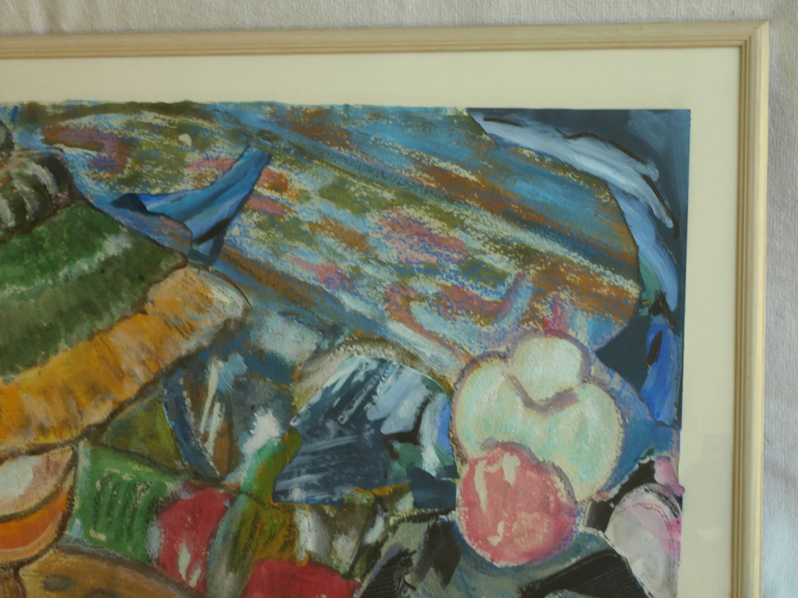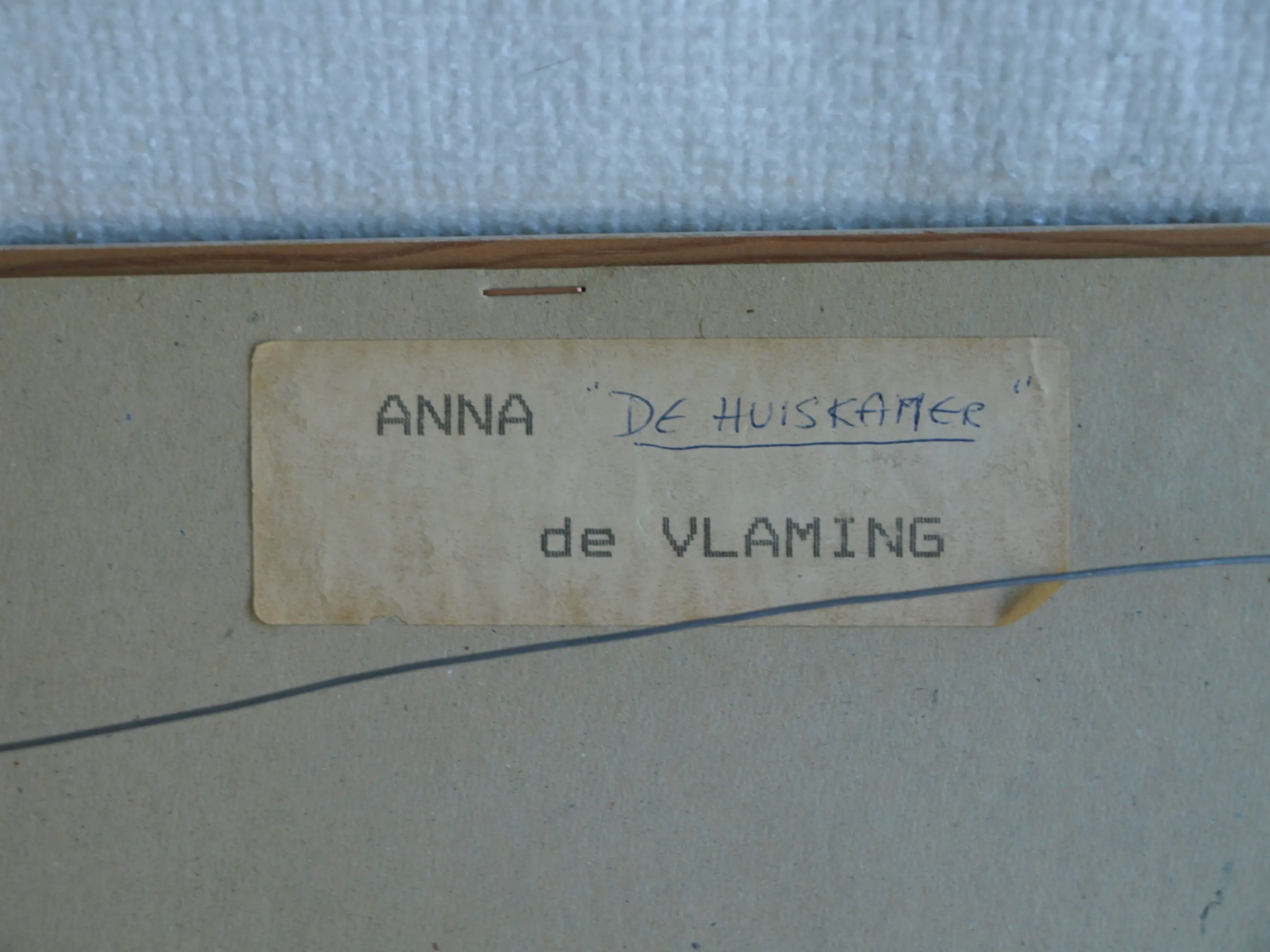 Een ingelijst werk uit 1996 van de Nederlandse kunstenares Anneke (Anna) de Vlaming. -Techniek: Gemengde techniek van acrylverf, collage en textiel op geschept papier. -Gesigneerd (monogram) en gedateerd rechtsonder in het werk. Ook met een sticker met naam en titel op de achterkant van de lijst. -Ingelijst in de originele houten lijst met glasplaat. -Afmetingen: Lijst, 65 x 84,5 x 2 cm. Beeld, 55 x 75 cm. -Herkomst: Uit een inboedel. -Conditie: Het werk is in zeer goede staat. De houten lijst heeft slijtplekjes. Zie ook de foto’s voor een eigen indruk. Kan zo aan de muur.