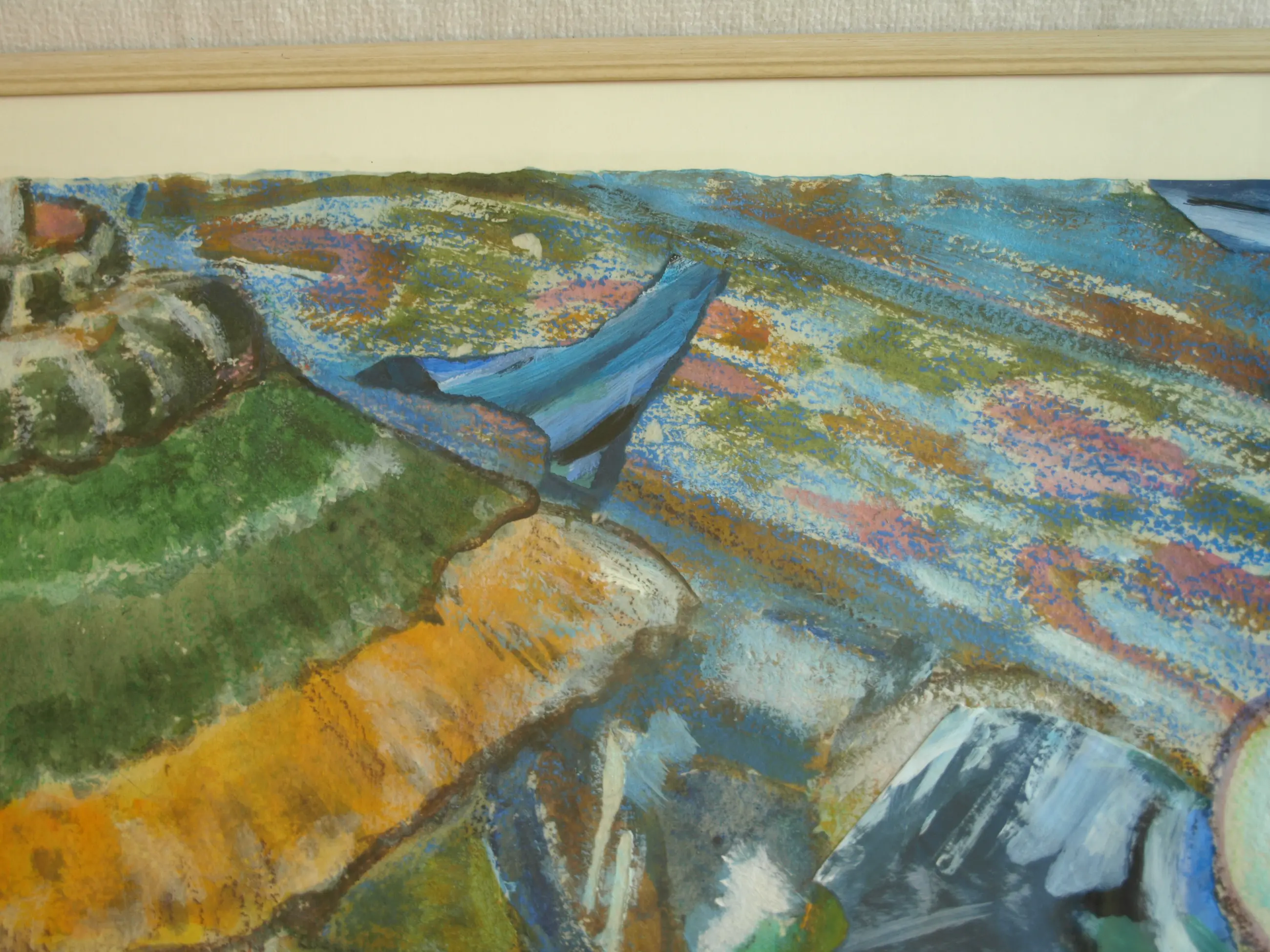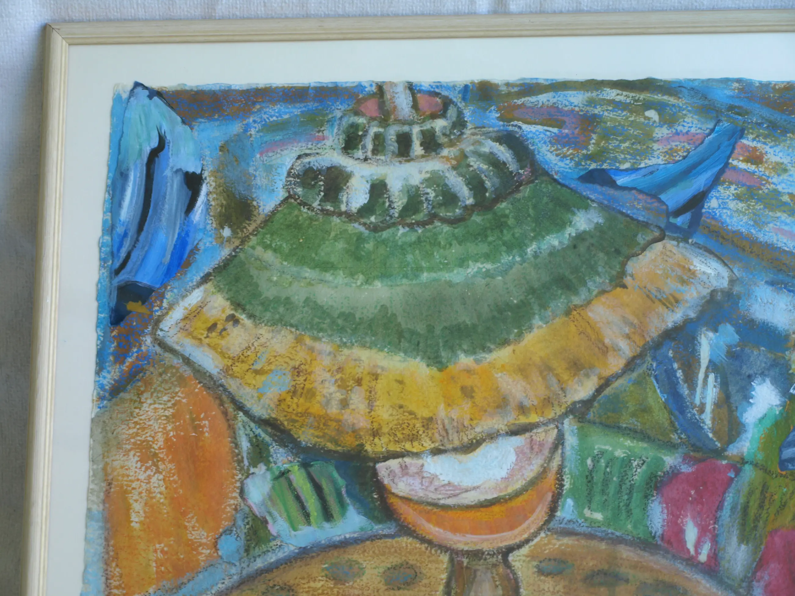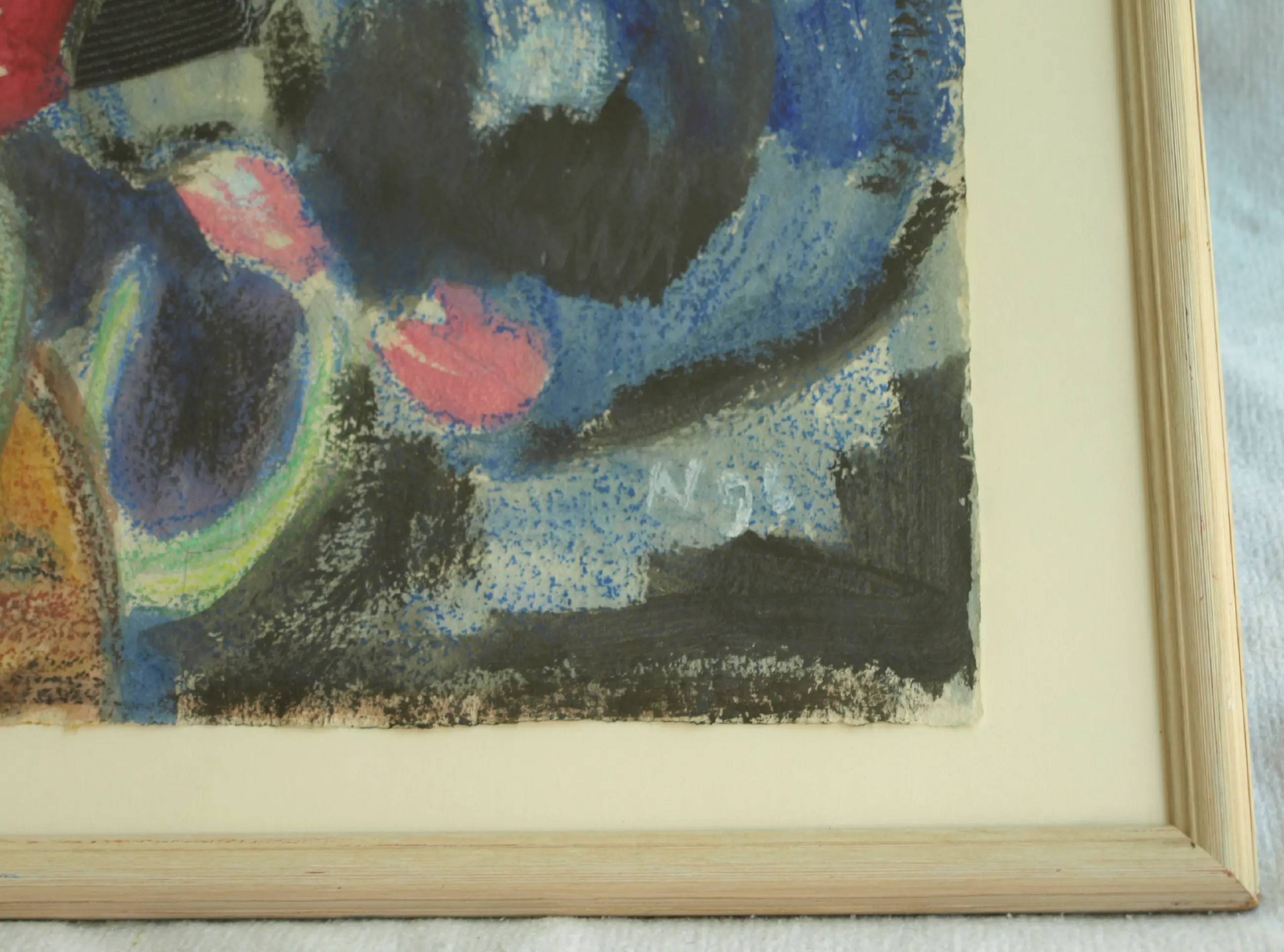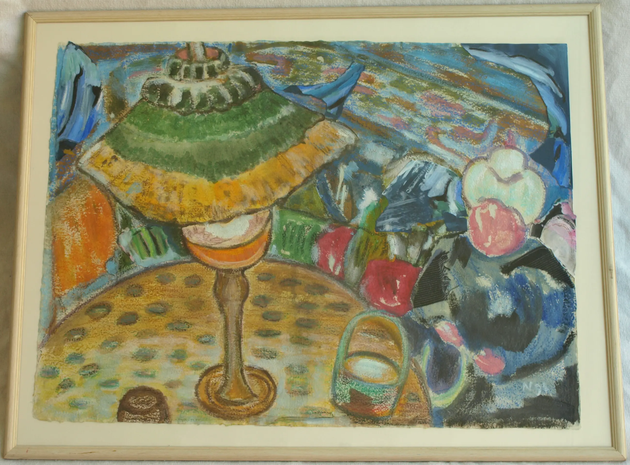 Een ingelijst werk uit 1996 van de Nederlandse kunstenares Anneke (Anna) de Vlaming. -Techniek: Gemengde techniek van acrylverf, collage en textiel op geschept papier. -Gesigneerd (monogram) en gedateerd rechtsonder in het werk. Ook met een sticker met naam en titel op de achterkant van de lijst. -Ingelijst in de originele houten lijst met glasplaat. -Afmetingen: Lijst, 65 x 84,5 x 2 cm. Beeld, 55 x 75 cm. -Herkomst: Uit een inboedel. -Conditie: Het werk is in zeer goede staat. De houten lijst heeft slijtplekjes. Zie ook de foto’s voor een eigen indruk. Kan zo aan de muur.