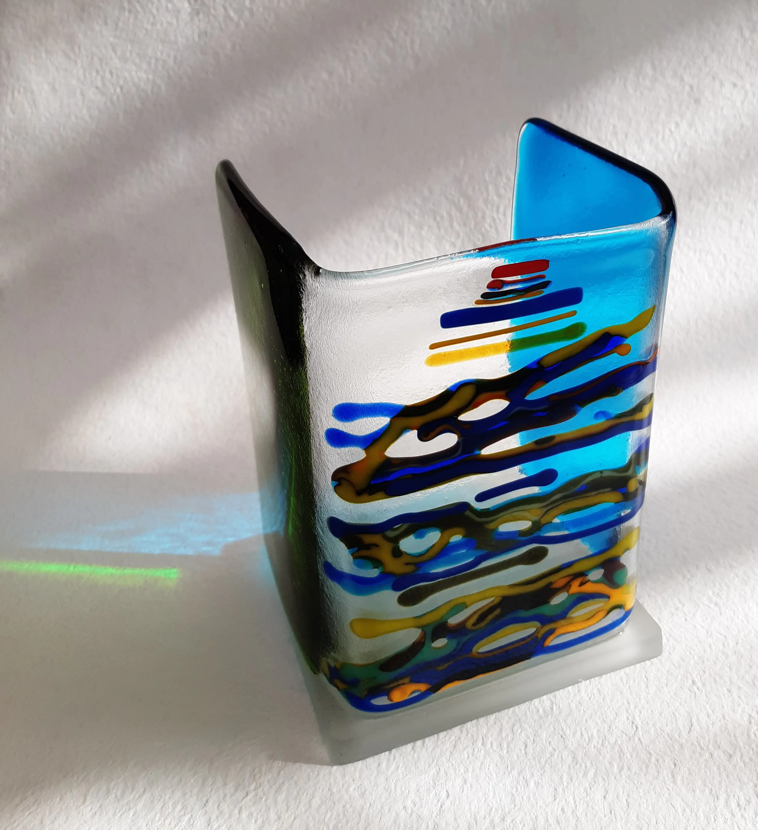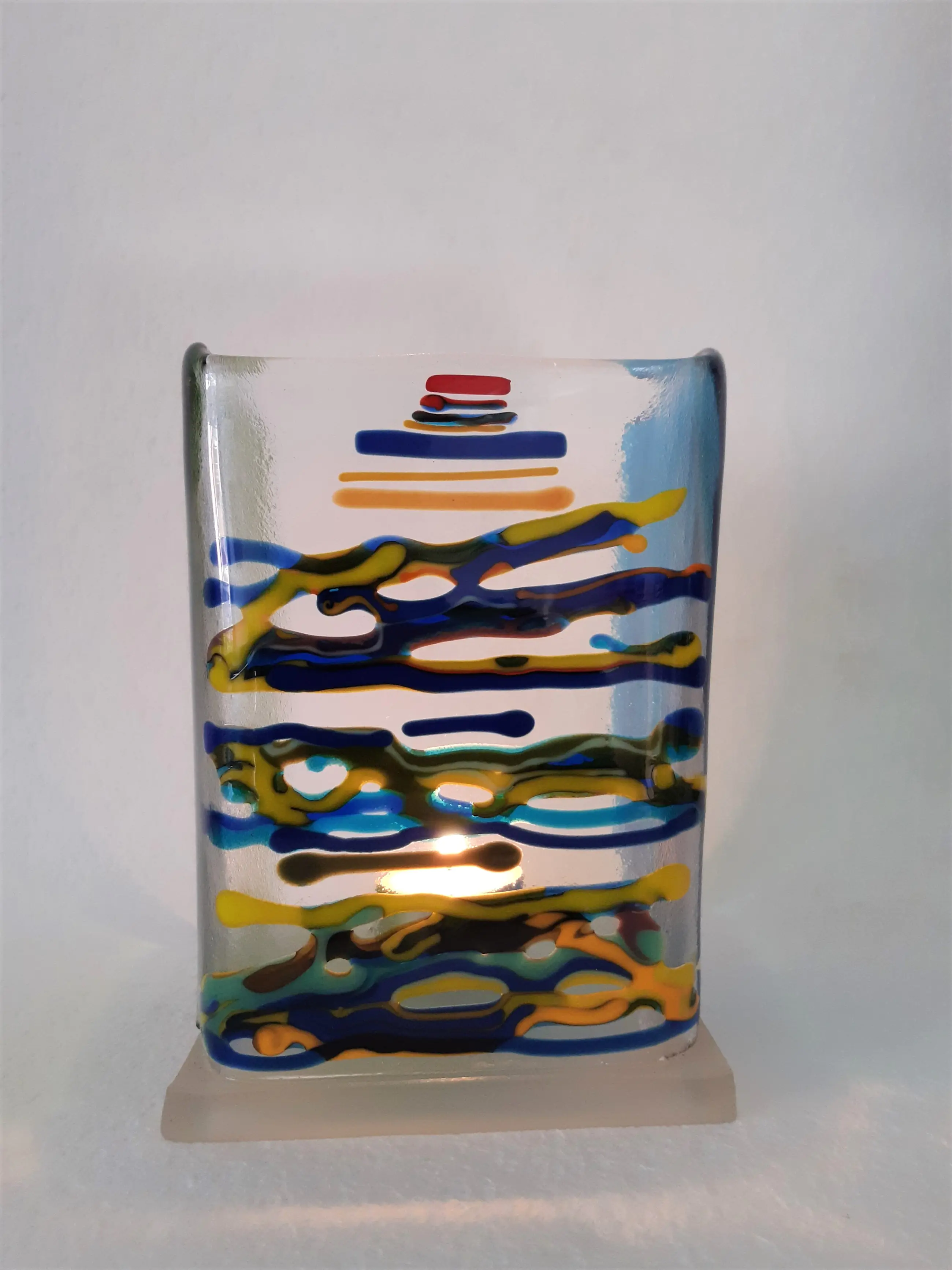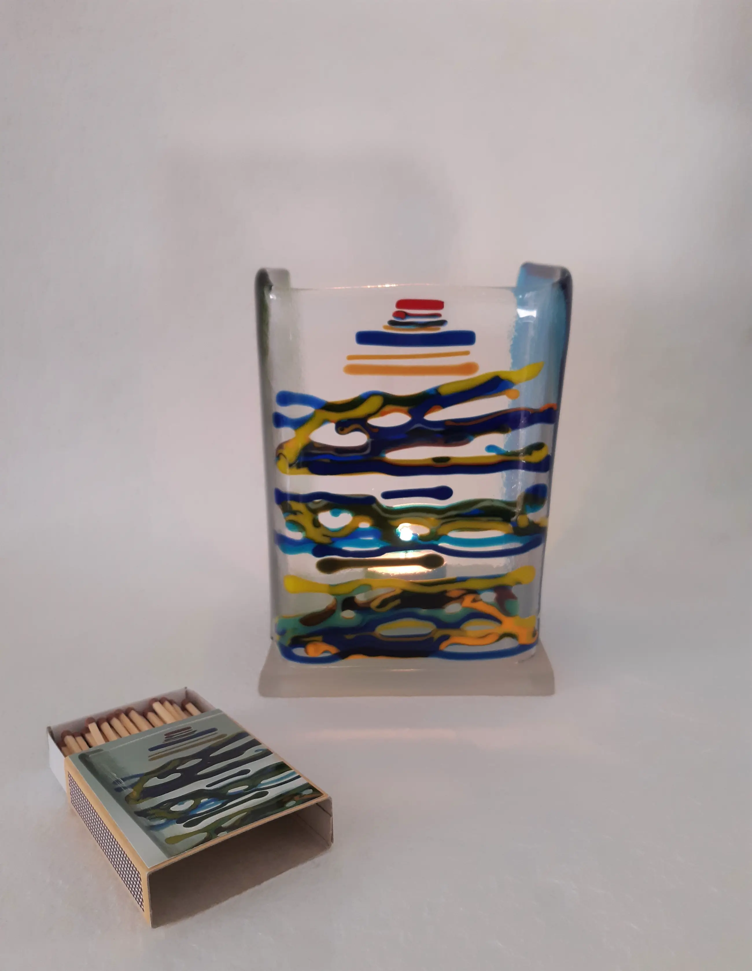 Dit unieke glasobject (windlicht) is vervaardigd in eigen atelier. De titel "Chinatown" verwijst naar een Chinese wijk waar volgens traditie de drakendans wordt opgevoerd. Een luciferdoosje met foto en tekst wordt bijgevoegd.