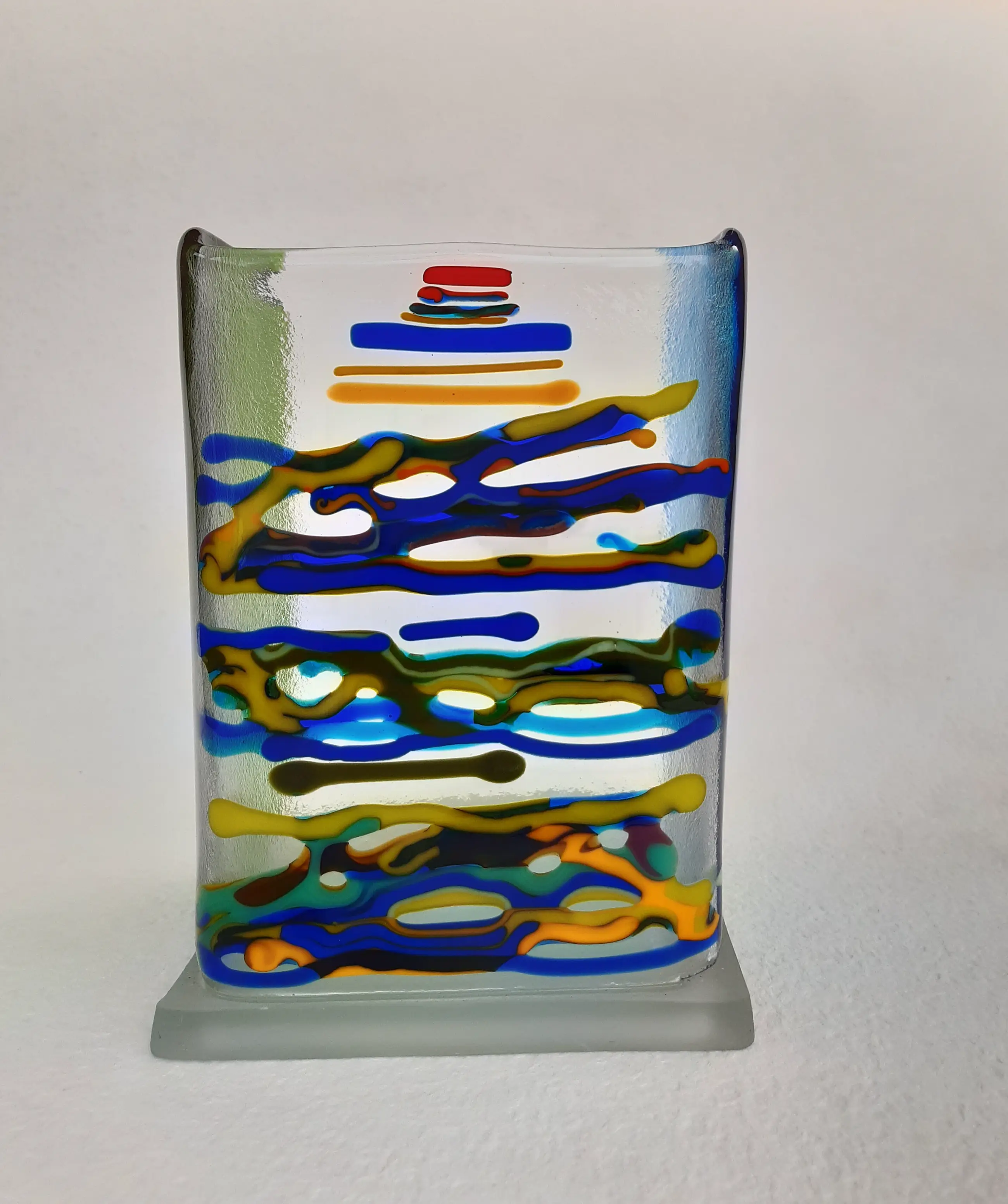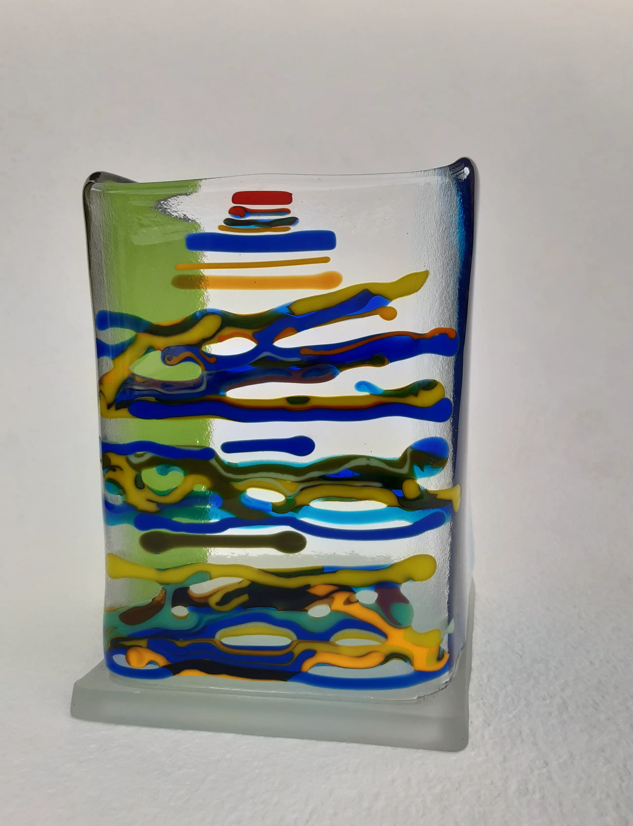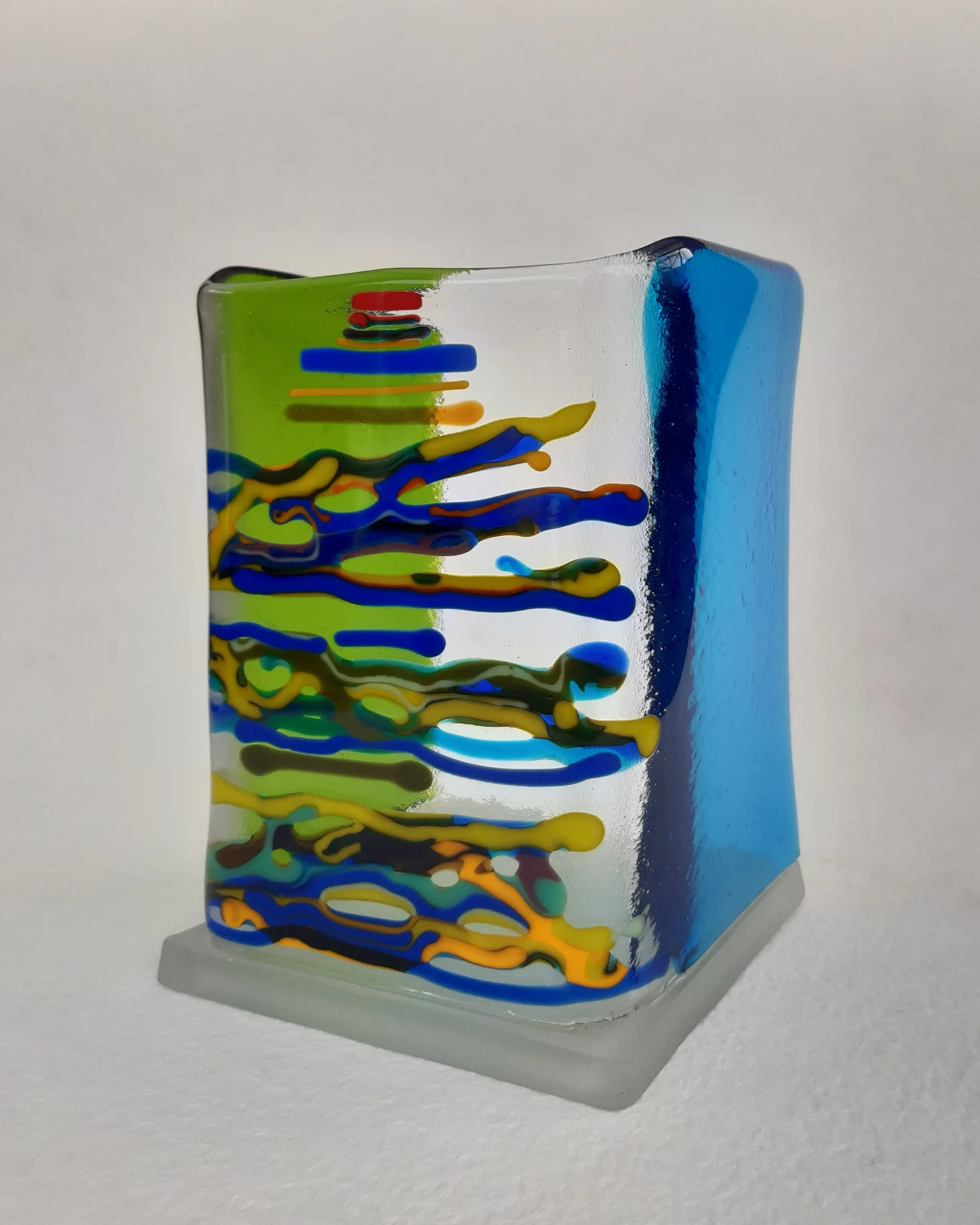 Dit unieke glasobject (windlicht) is vervaardigd in eigen atelier. De titel "Chinatown" verwijst naar een Chinese wijk waar volgens traditie de drakendans wordt opgevoerd. Een luciferdoosje met foto en tekst wordt bijgevoegd.