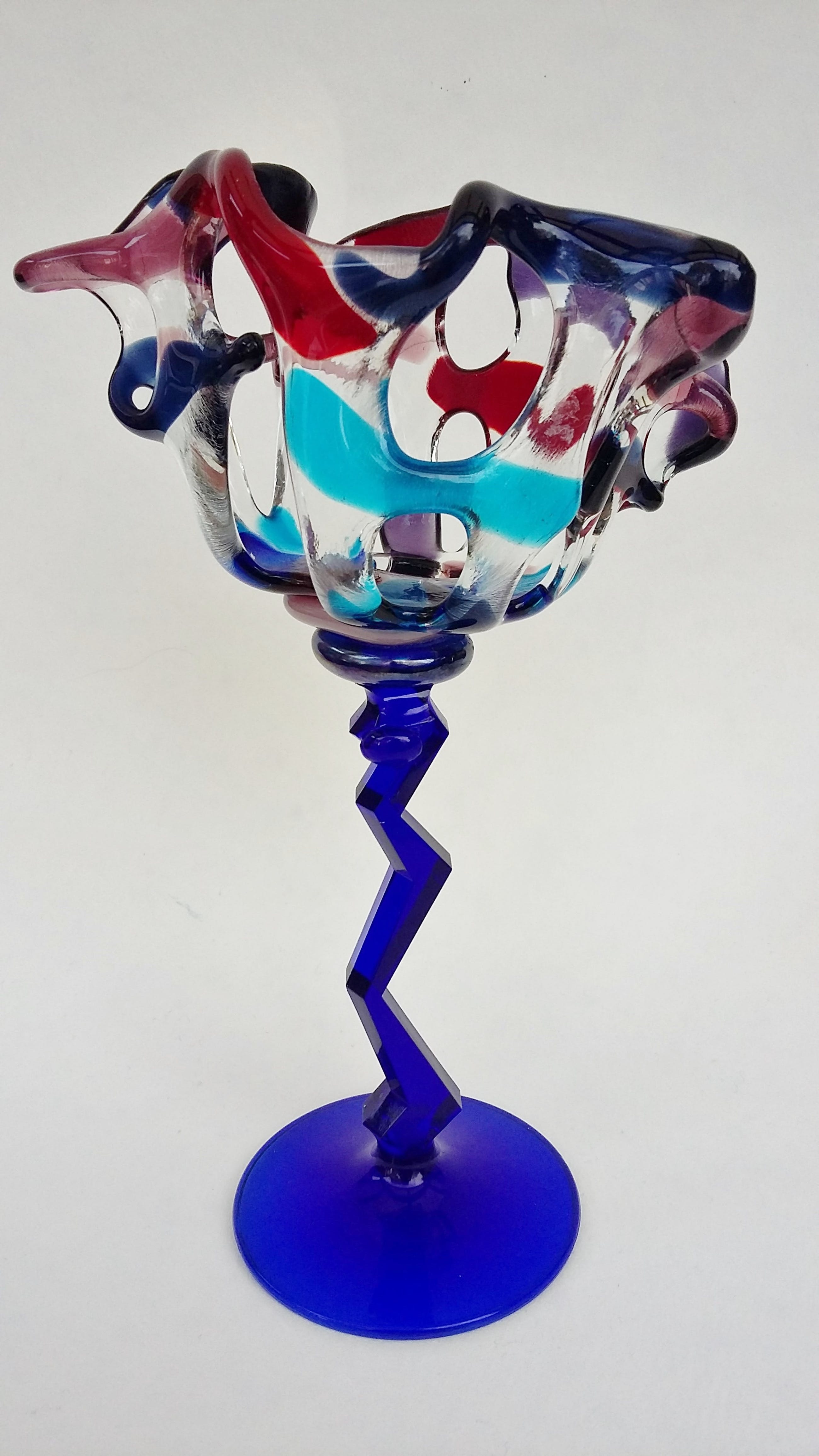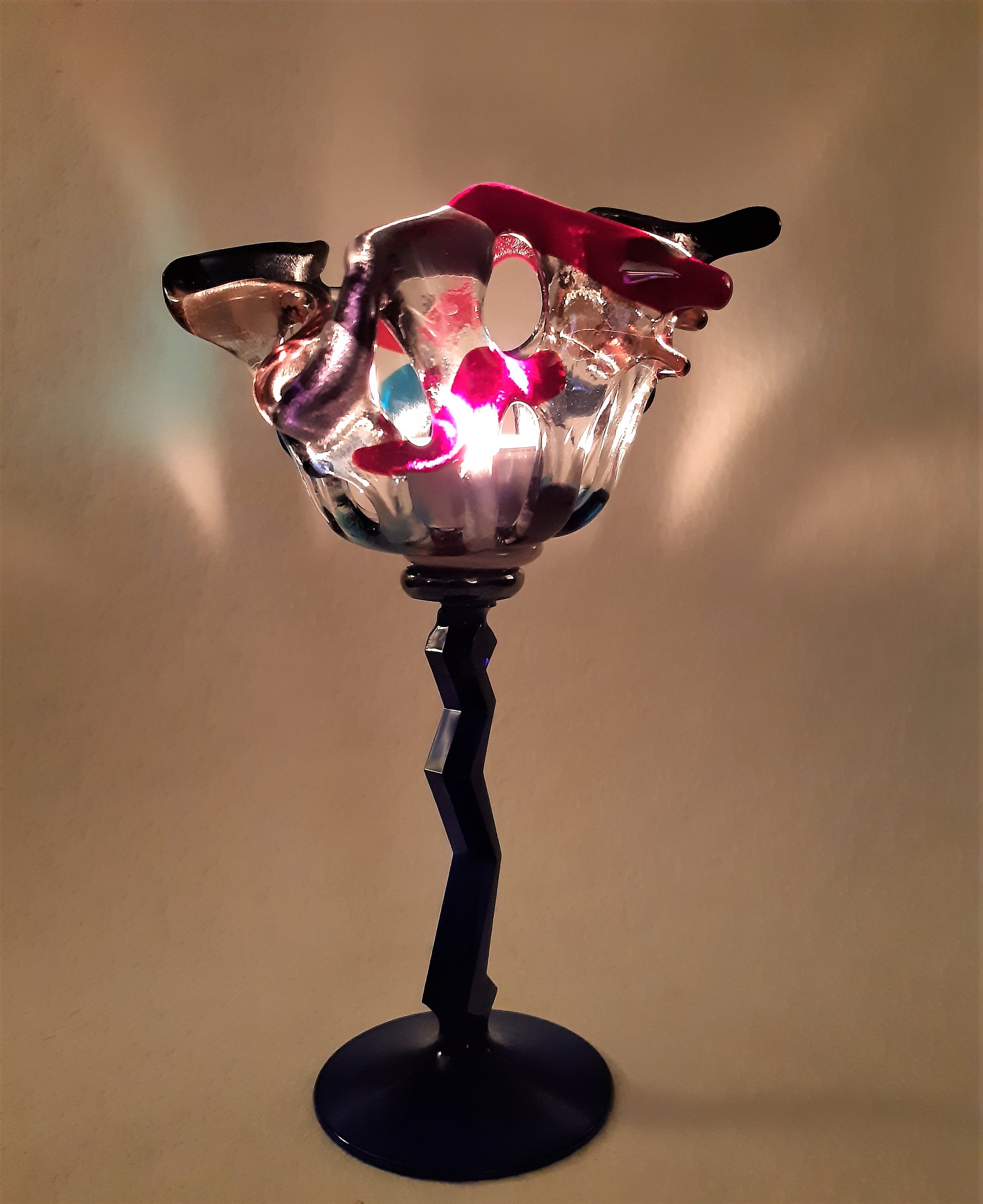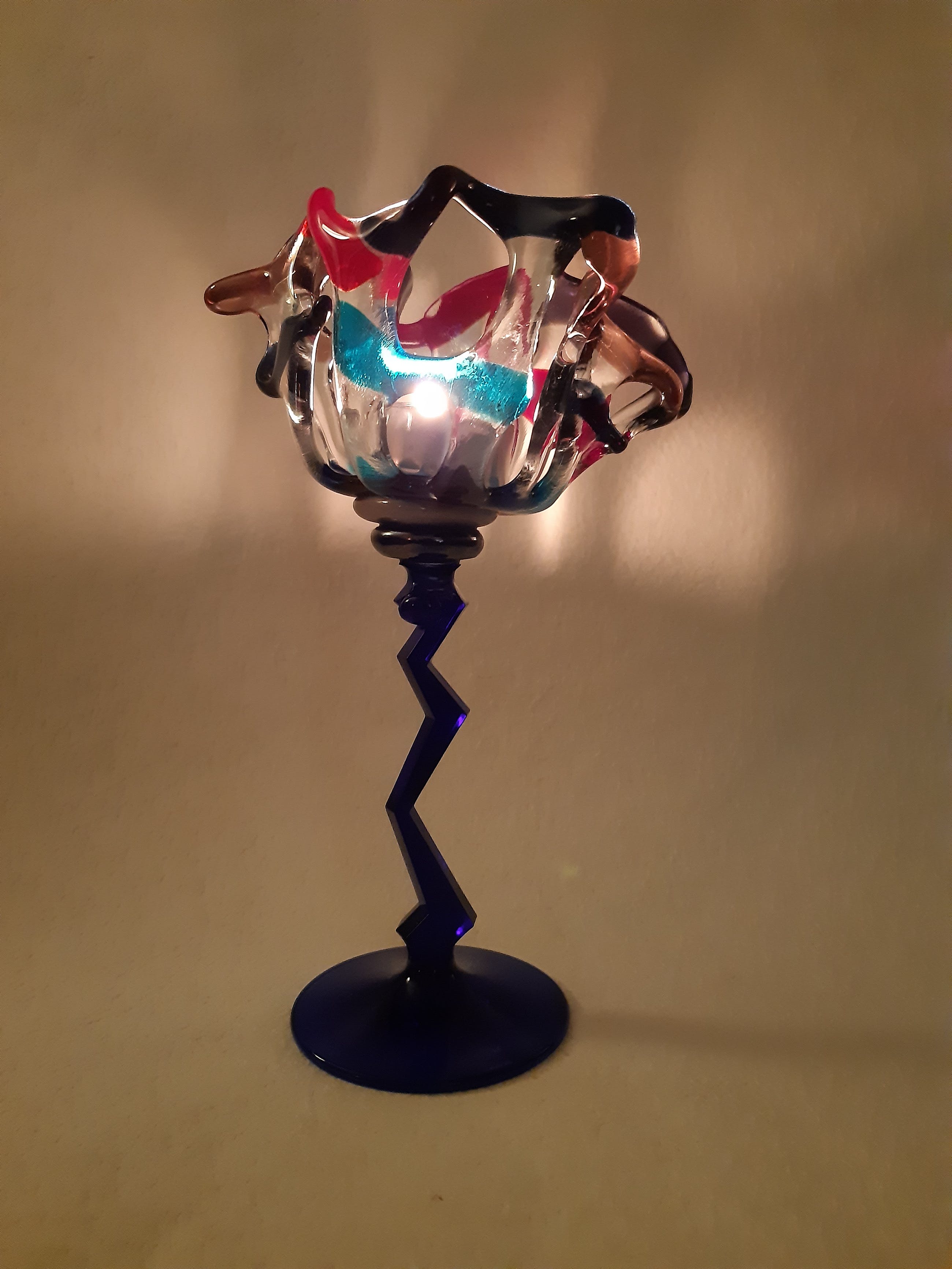 Dit unieke glasobject "Madeira ", te gebruiken als kandelaar, is genoemd naar het bloemrijke eiland Madeira dat zich kenmerkt door de prachtige kleuren van exotische bloemen.