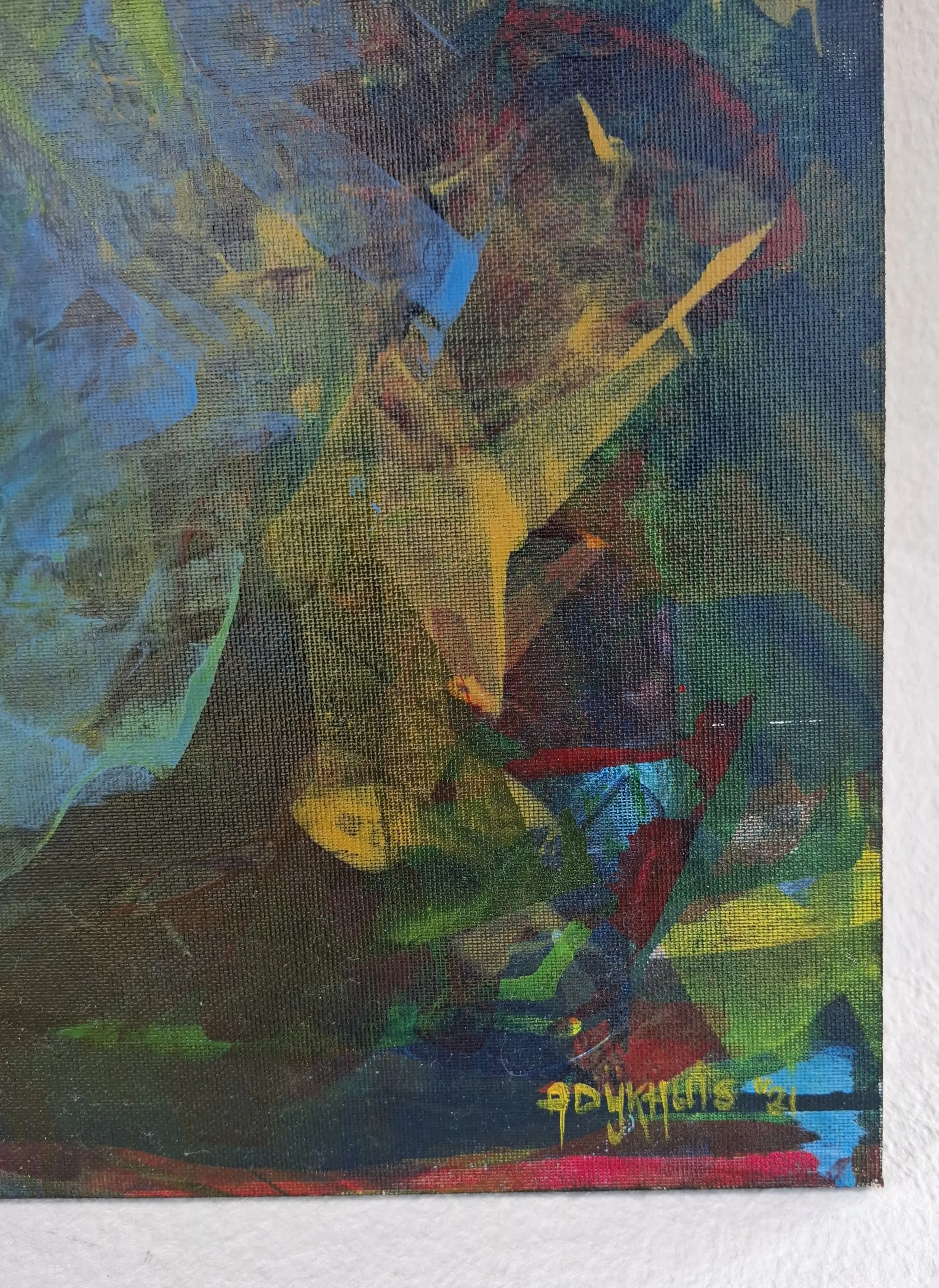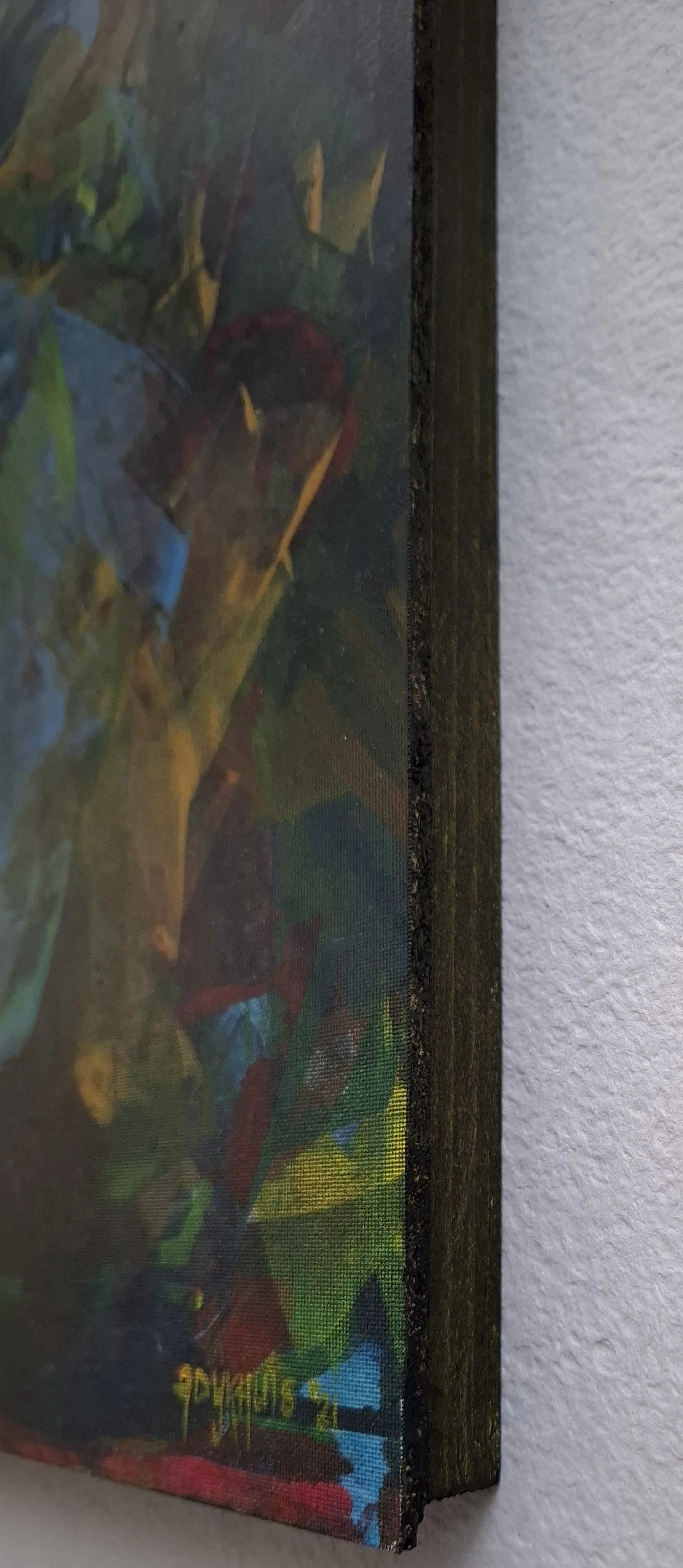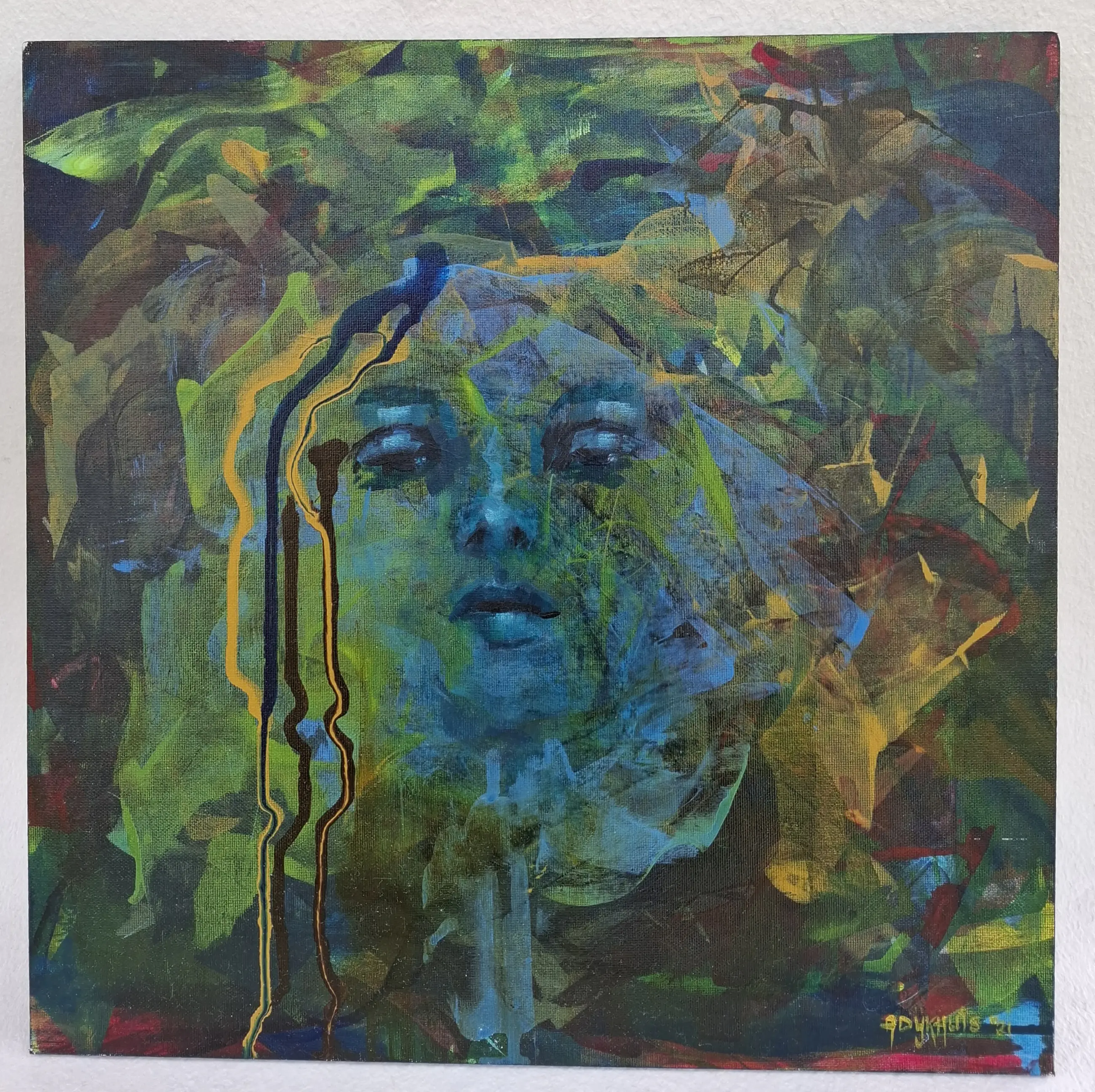 Een mysterieus portret "In The Jungle", geschilderd met acrylverf op canvasboard , gemonteerd op een houten frame.