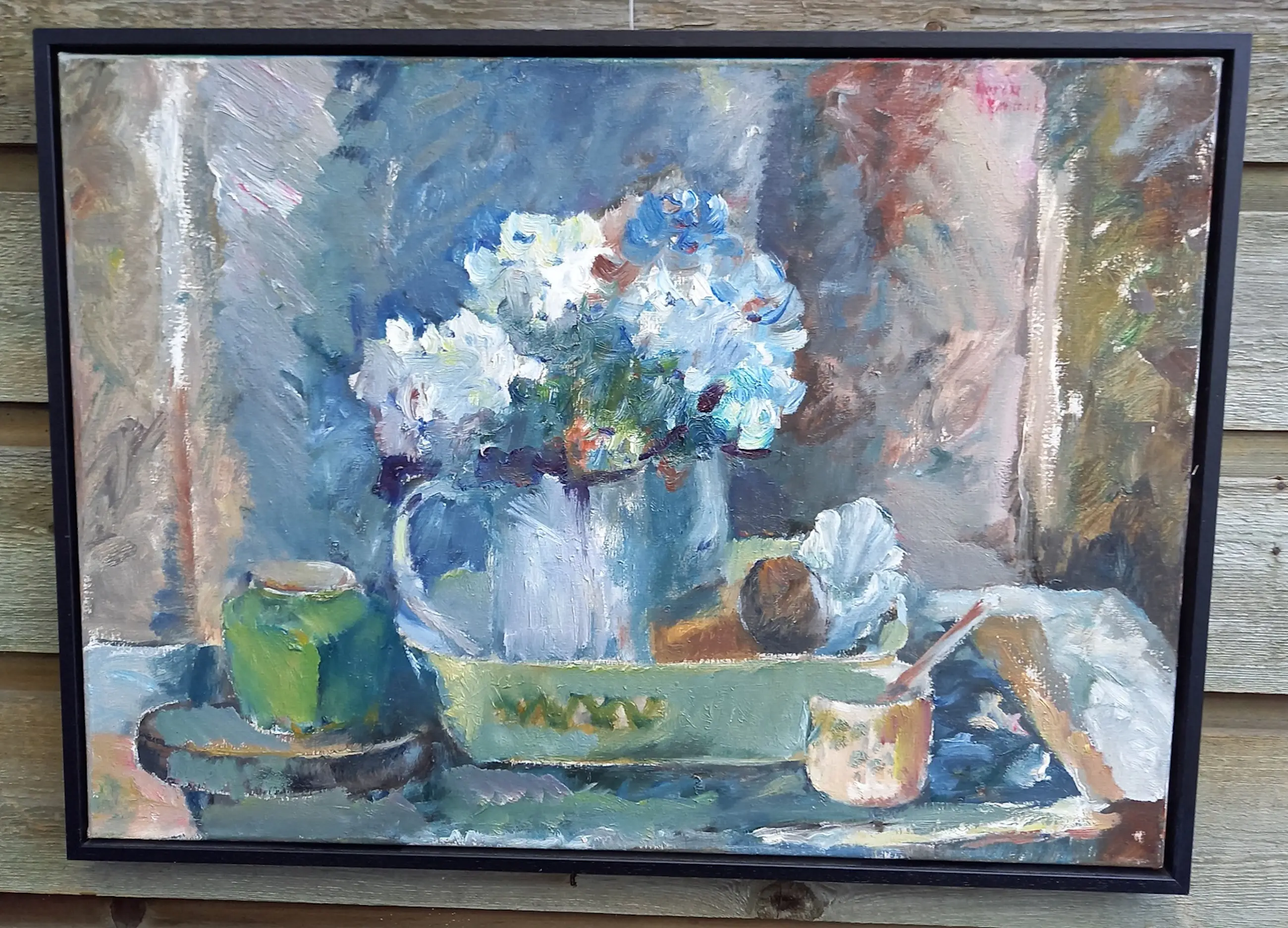 Het schilderij is gevat in een smalle zwarte baklijst.