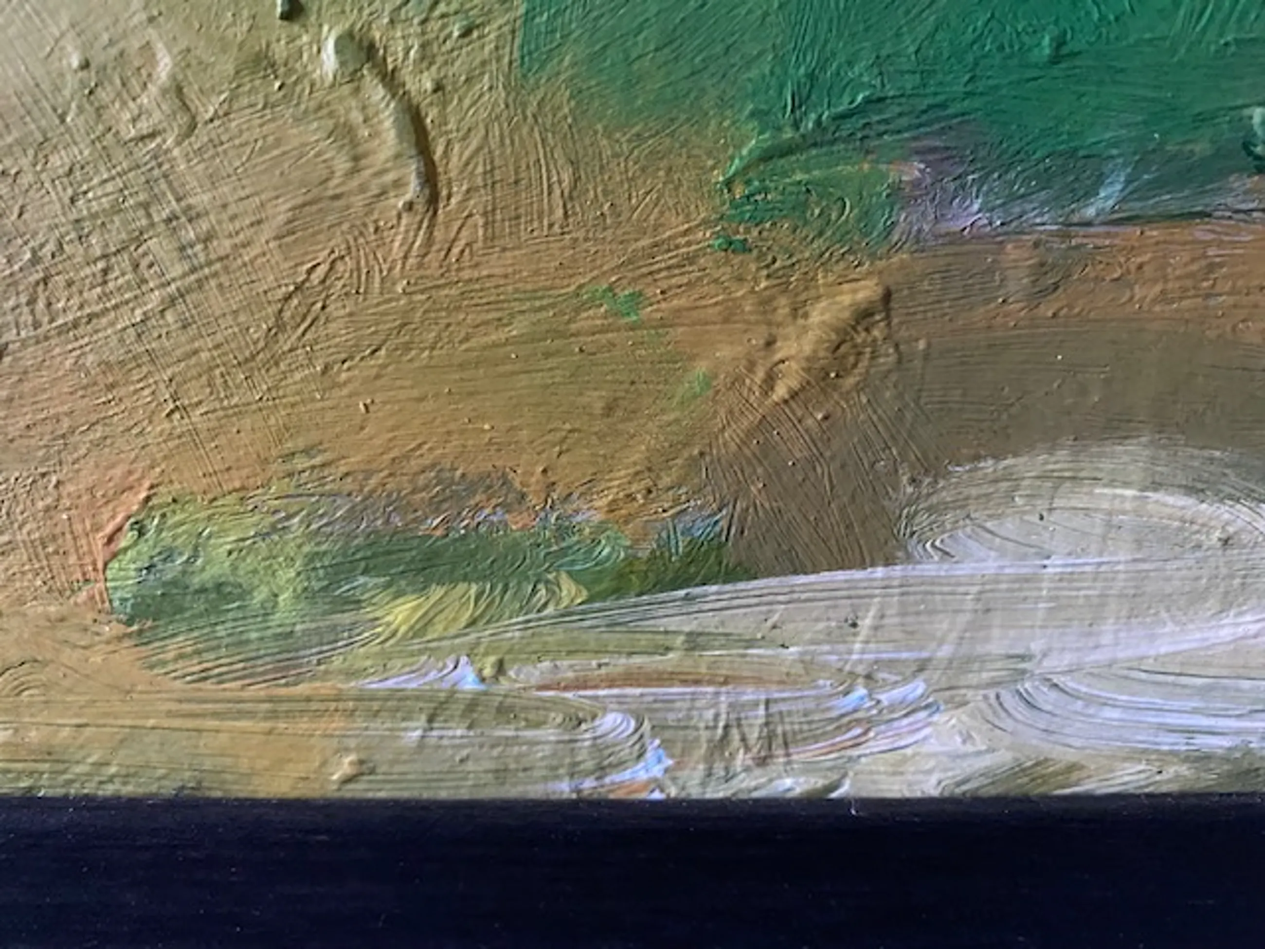 het doek is ingelijst voor een board. De zwarte lijst is van kunststof. Het schilderij is nog fris van kleur. gebruikelijke ouderdomssporen aanwezig