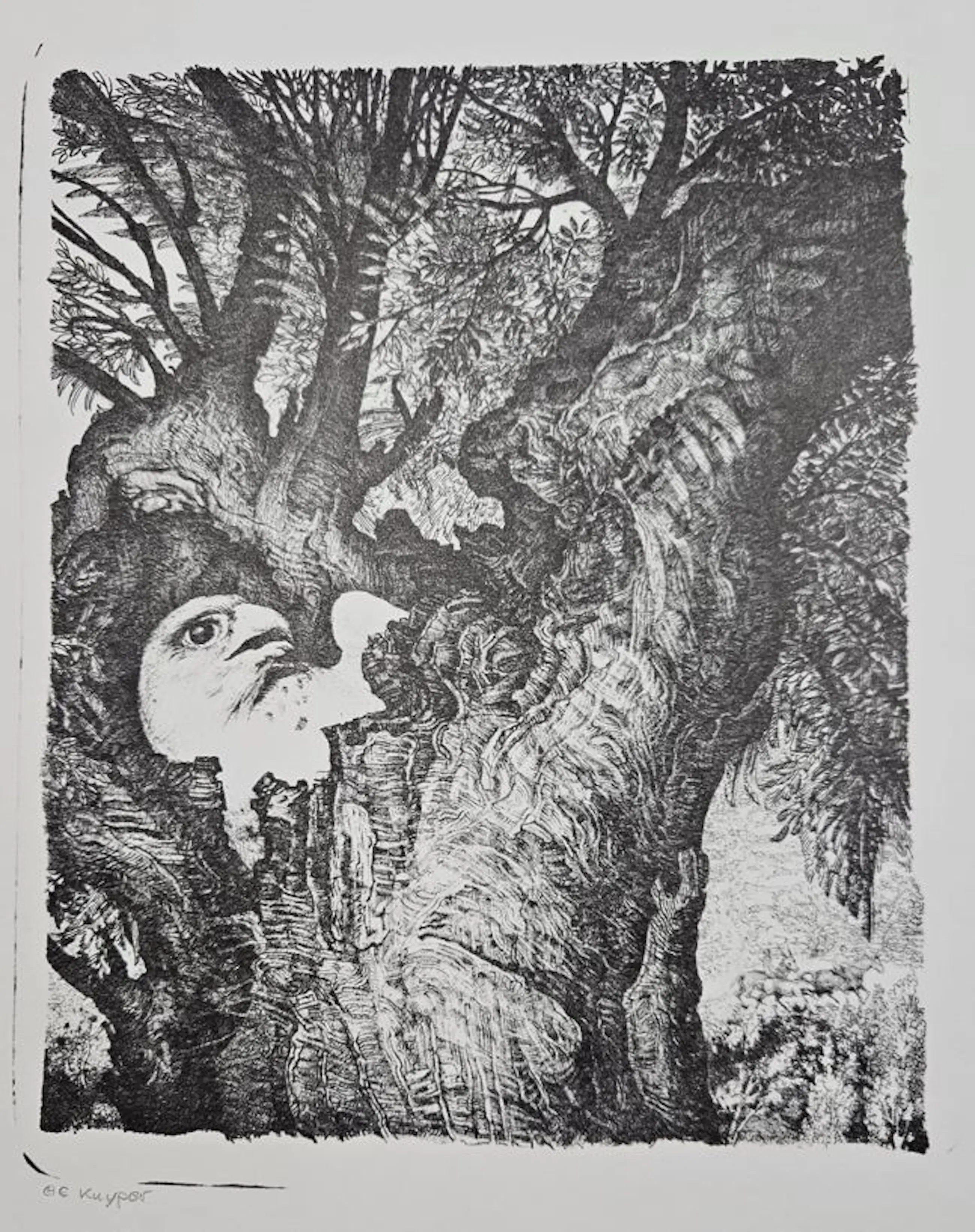 E.A. exemplaar (Épreuve d'Artiste / kunstenaarsproef) van een litho de gedrukt in Nederlands Steendruk Museum. Afbeelding toont de Vogelboom van Anneke Kuyper uit 1973.