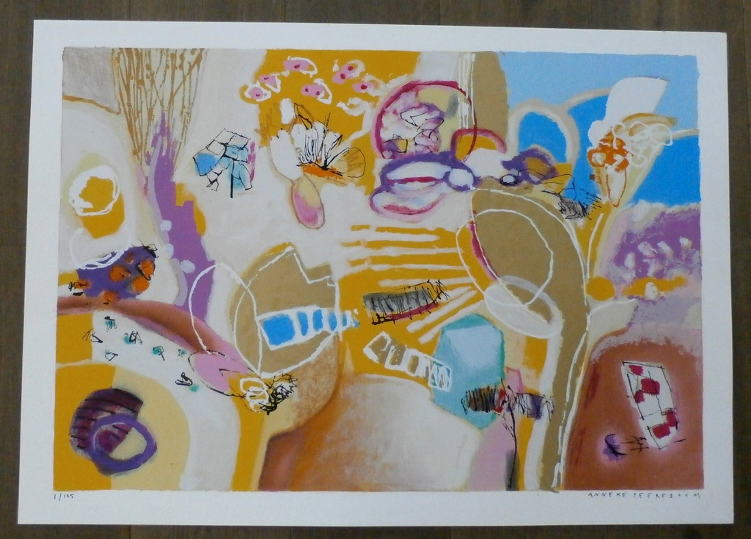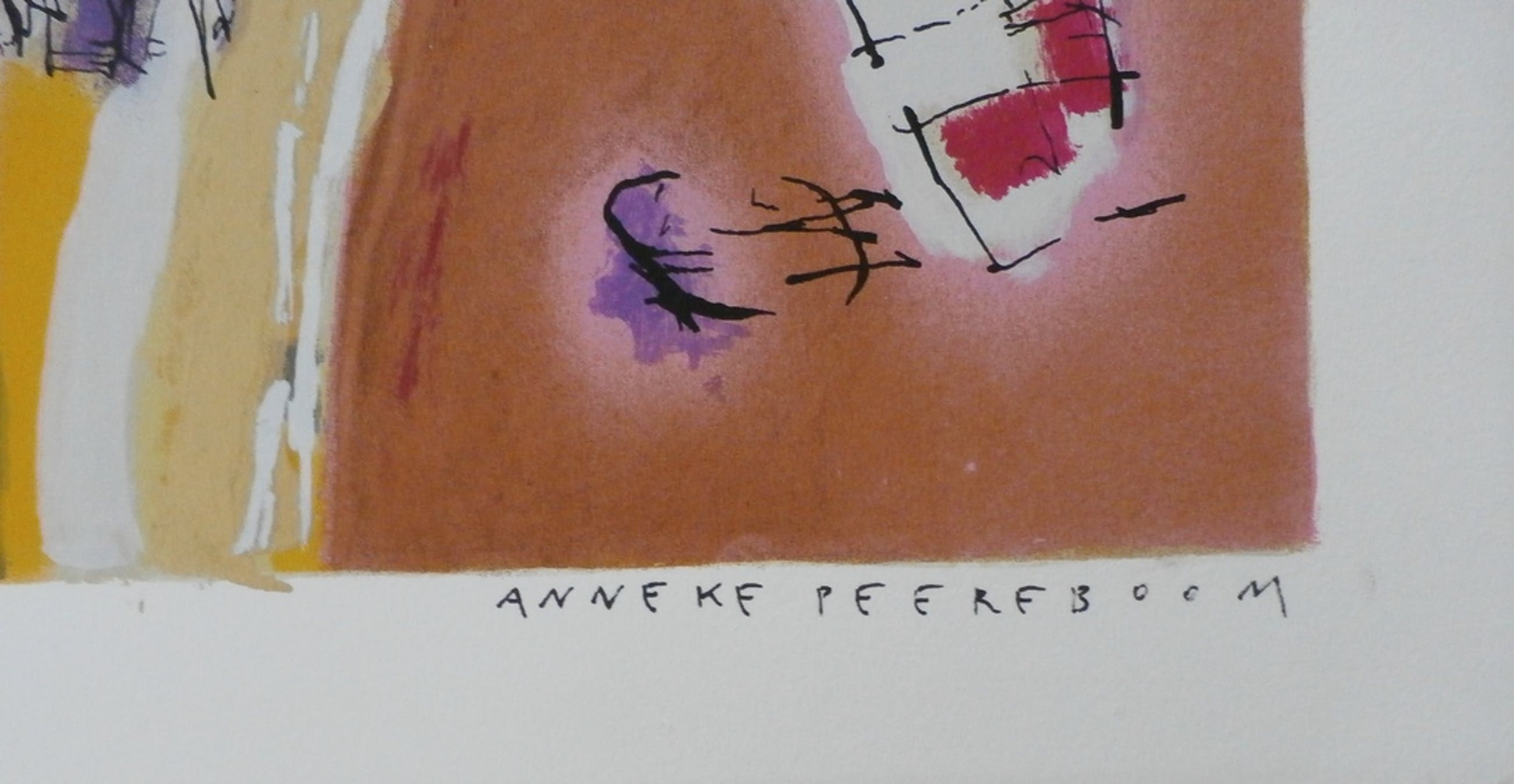 Grote zeefdruk van Anneke Peereboom. Titel: Au septième ciècle. Nummer: 1/125. Afmetingen blad: H70 x b98 cm. Afmetingen voorstelling: H62cm x b89,5cm. Het werk is rechtsonder gesigneerd door de kunstenaar. De authenciteit van het, aangeboden, werk wordt voor 100% gegarandeerd. Een certificaat van echtheid kan, op aanvraag, worden meegestuurd. Herkomst: collectie ABN AMRO. Galerieprijs: 850 euro.