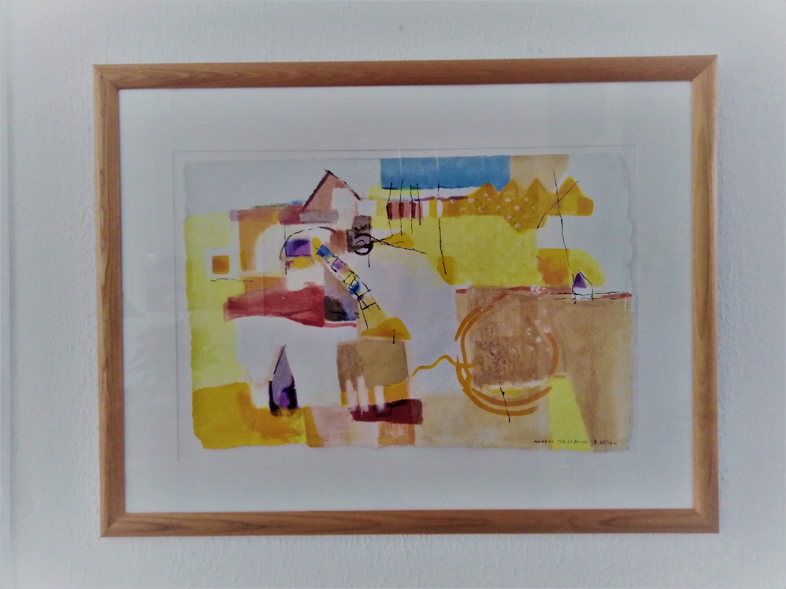 Een mooie semi-abstracte zeefdruk in een mooie warme houten lijst.