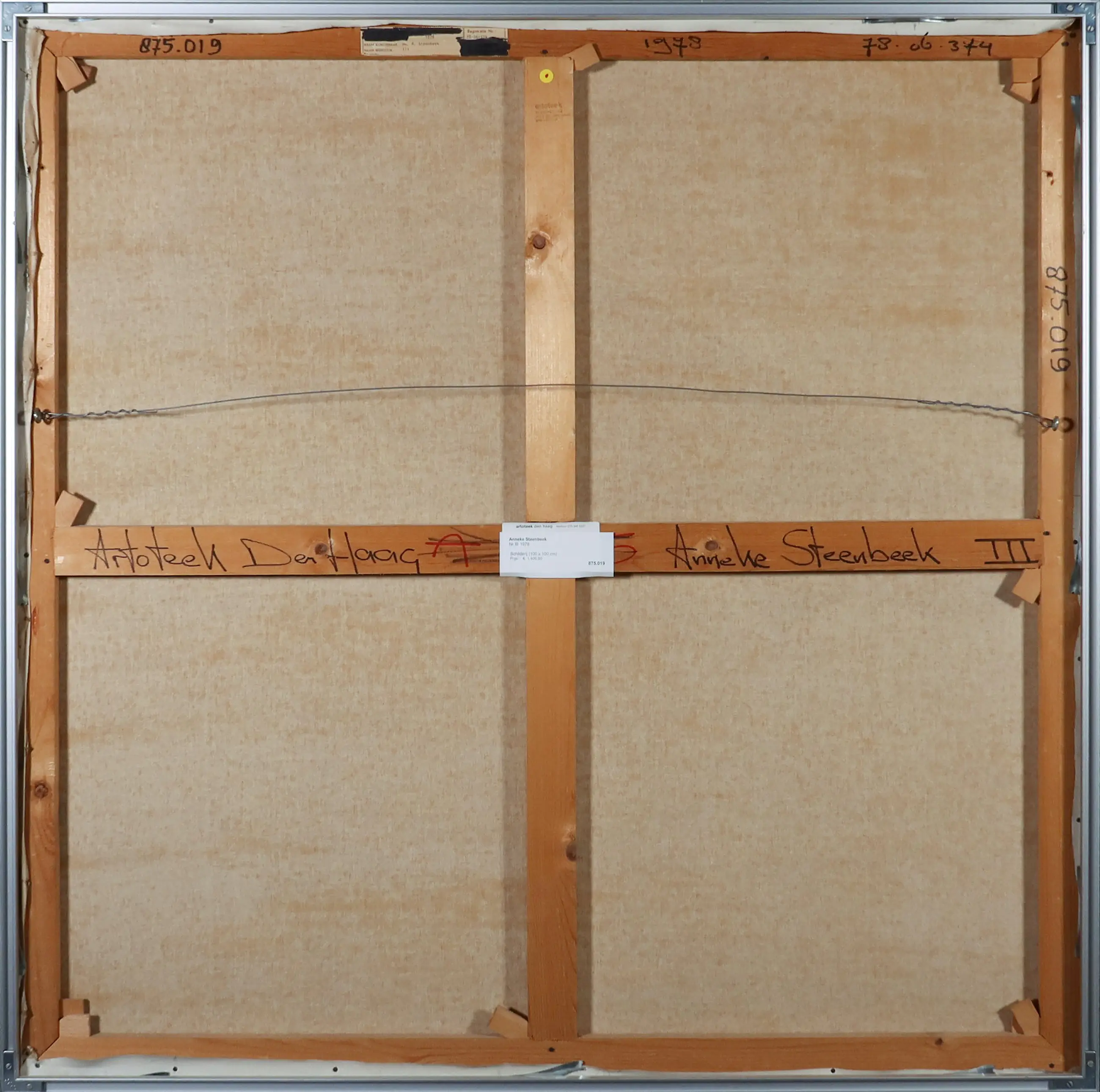 | enkele lichte beschadigingen (in midden doek klein butsje), verder drukt het spieraam iets door het doek (zichtbaar bij strijklicht) | |