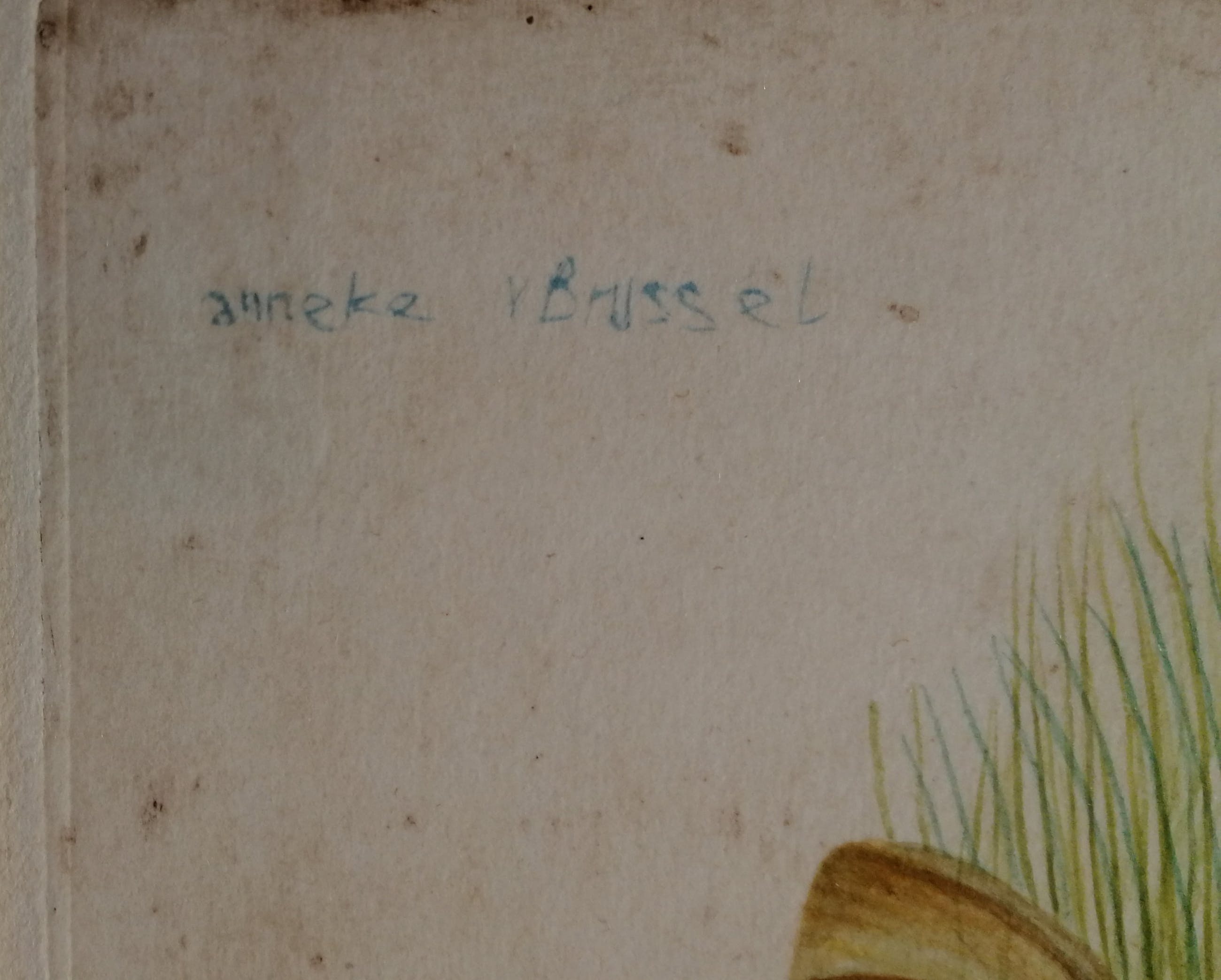 Gesigneerd linksboven. Gedateerd 2-11-1977 rechtsboven. Dit werk is geëxposeerd bij Galerie Lieve hemel te Amsterdam in november 1978. Anneke van Brussel-Loman werd geboren te Eindhoven op 22 december 1949. Opleiding aan de Koninklijke Academie voor Kunstvormgeving te Den Bosch en de Koninklijke Academie voor Schone Kunsten te Antwerpen.