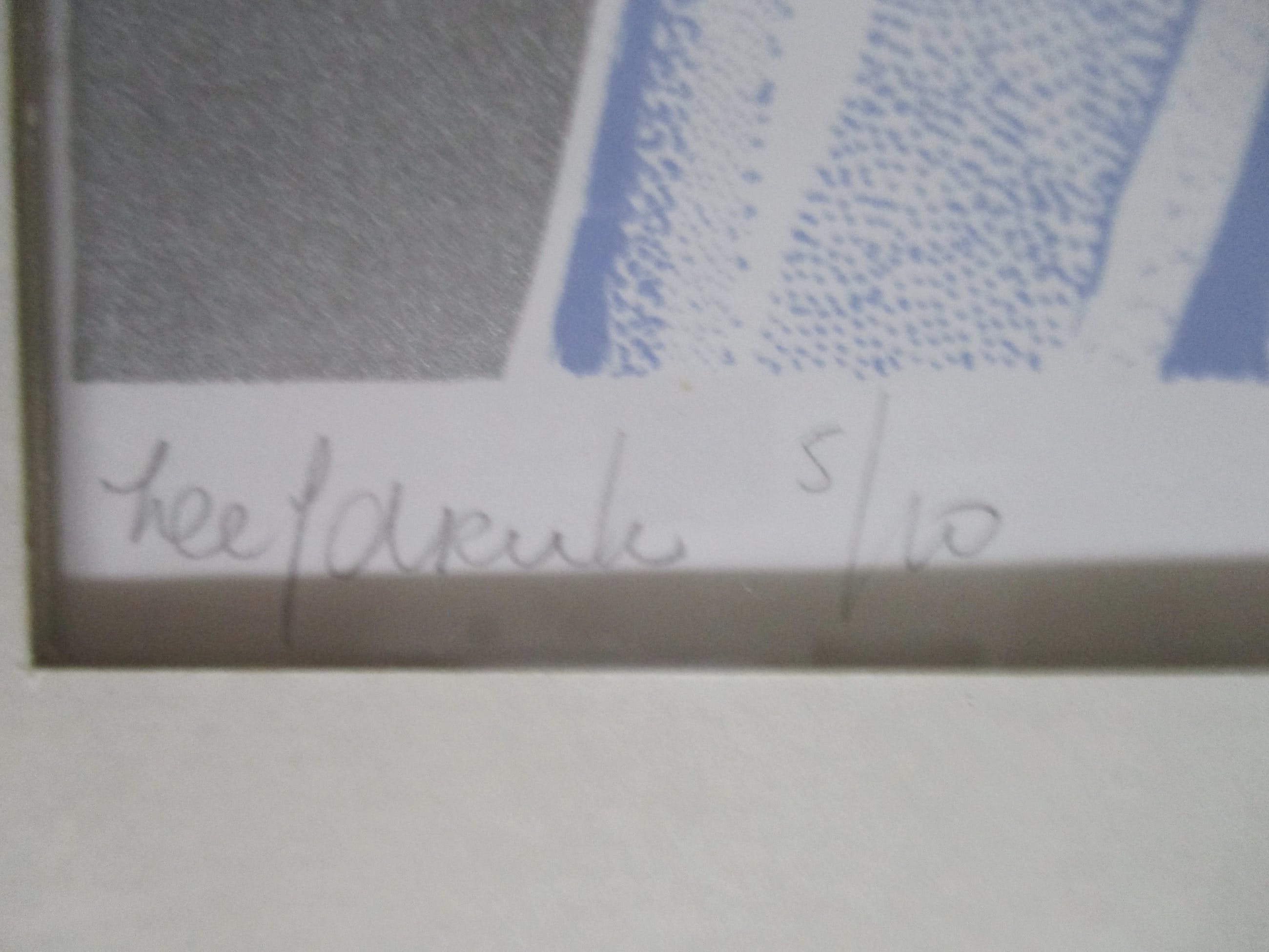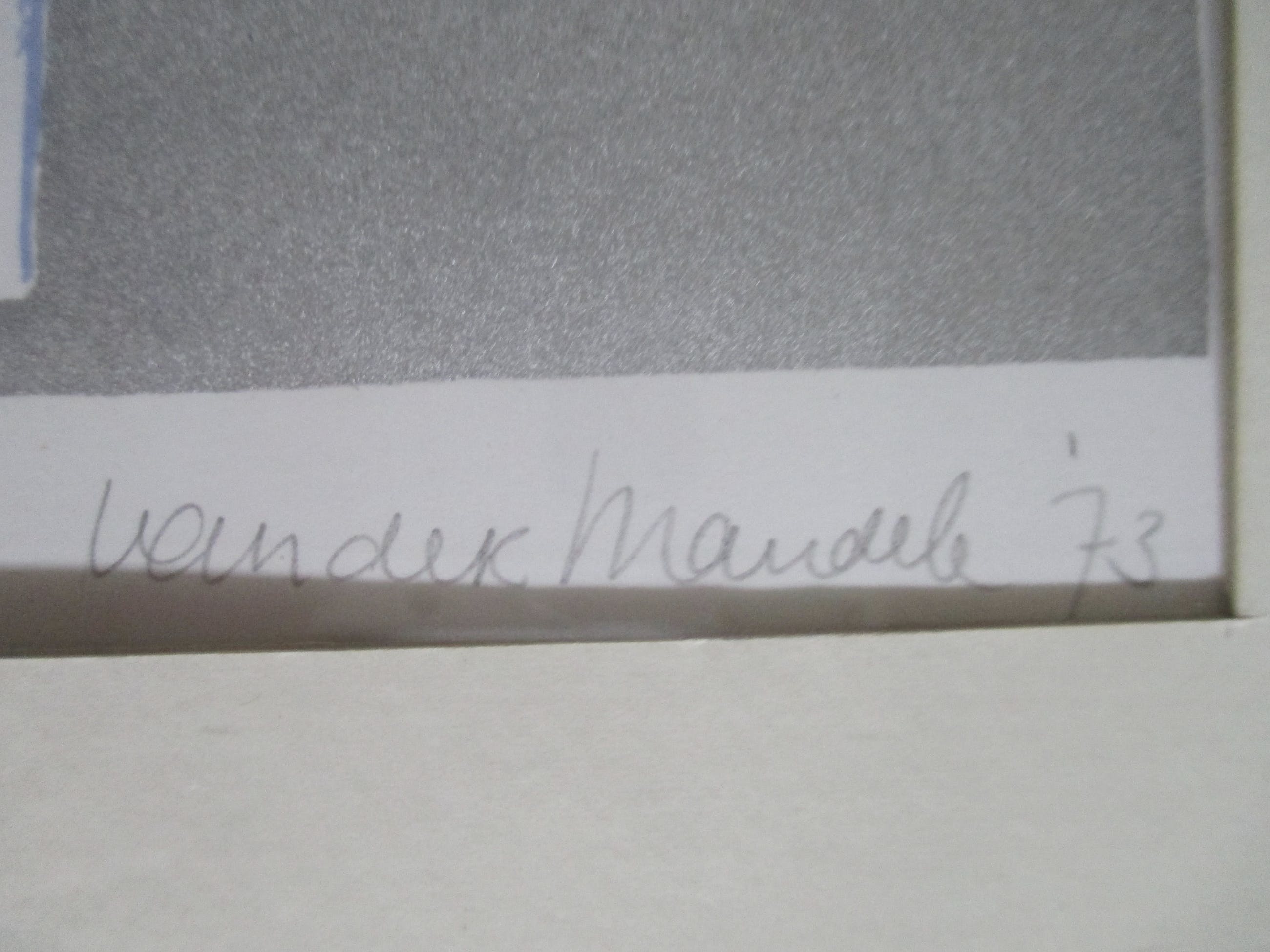 Zeefdruk van Anneke van der Mandele, gesigneerd, genummerd en gedateerd in potlood. Ingelijst achter passe-partout en glas in aluminium lijst.