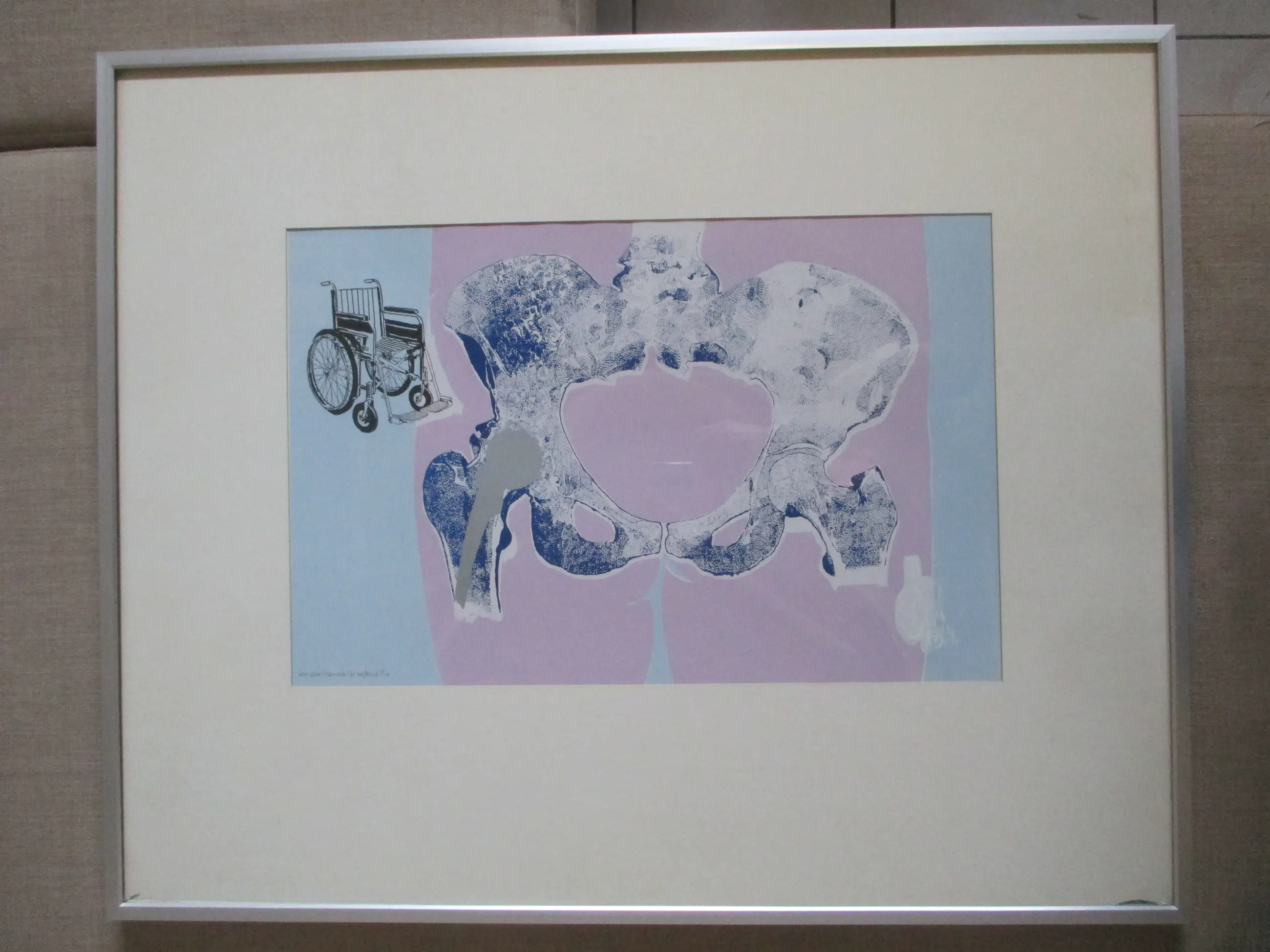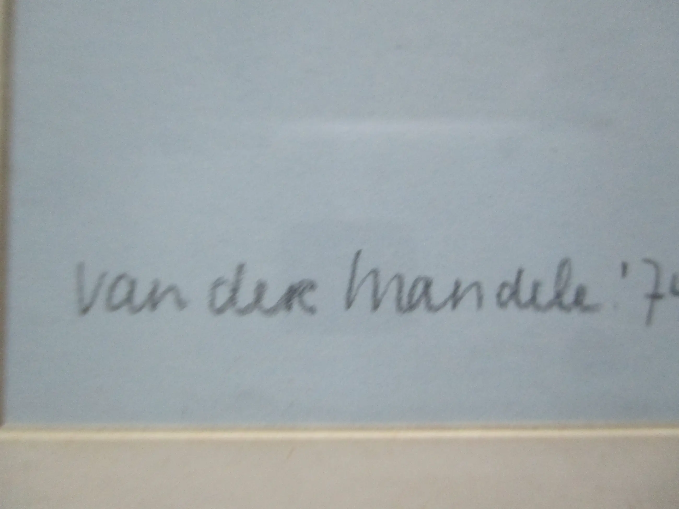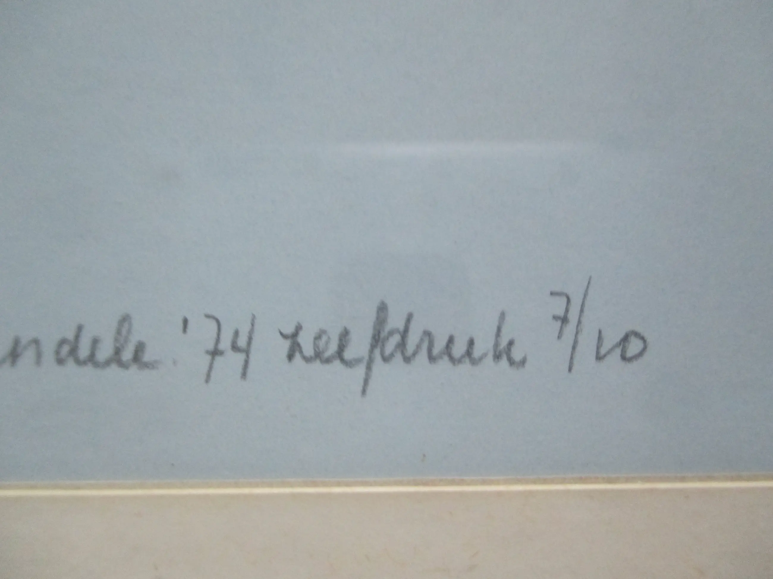 Zeefdruk van Anneke van de Mandele, gesigneerd, gedateerd en genummerd in potlood. Ingelijst achter glas passe-partout in aluminium lijst. verzending aangetekend en verzekerd 19 euro. Bij verzending is glasbreuk voor risico van de koper. Verzending alleen binnen Nederland