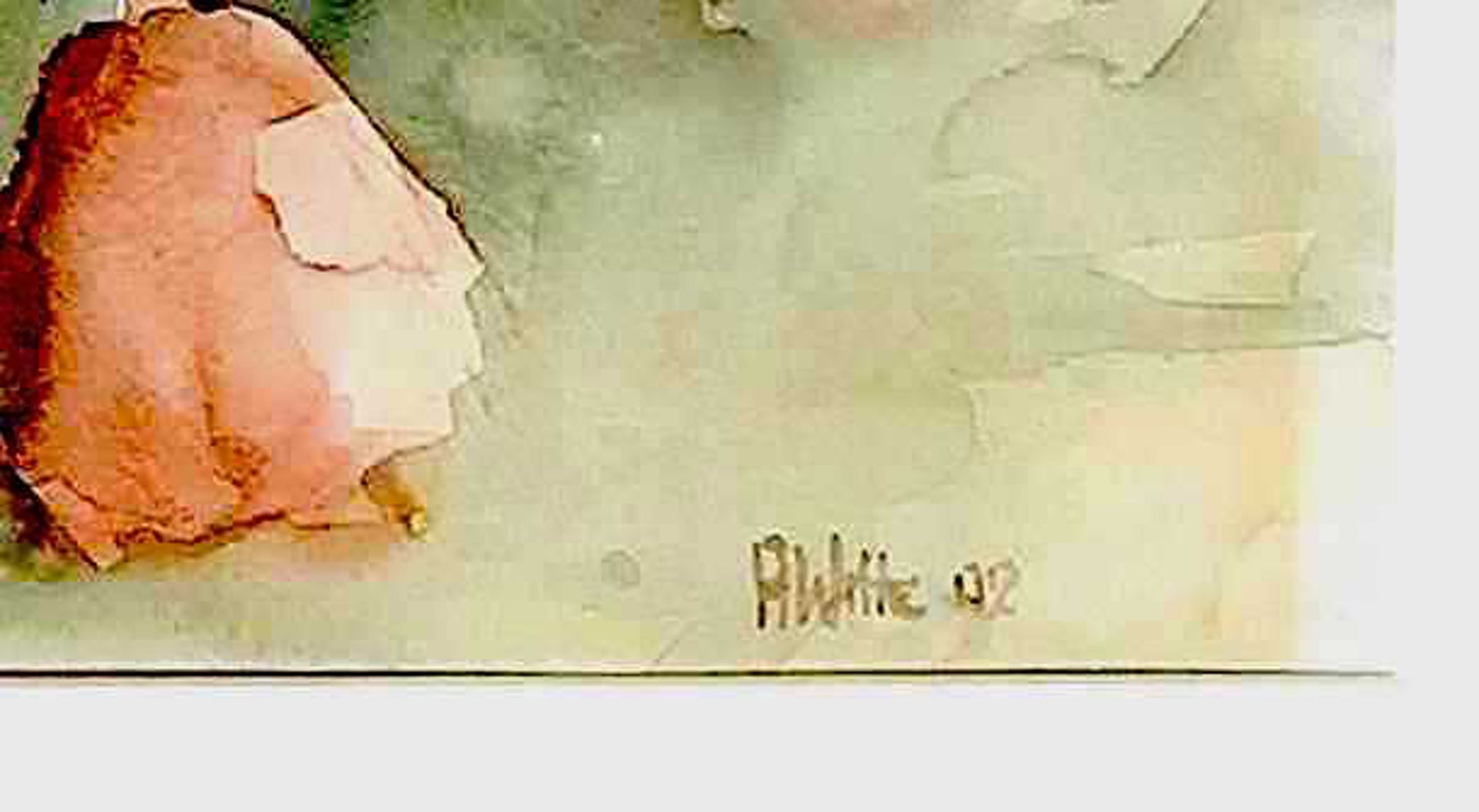 Professioneel ingelijst achter glas in mooi passe-partout en mooie gemelleerd houten lijst. Oorspronkelijke galerieprijs in 2002: € 850,00 (zie foto achterzijde kunstwerk).